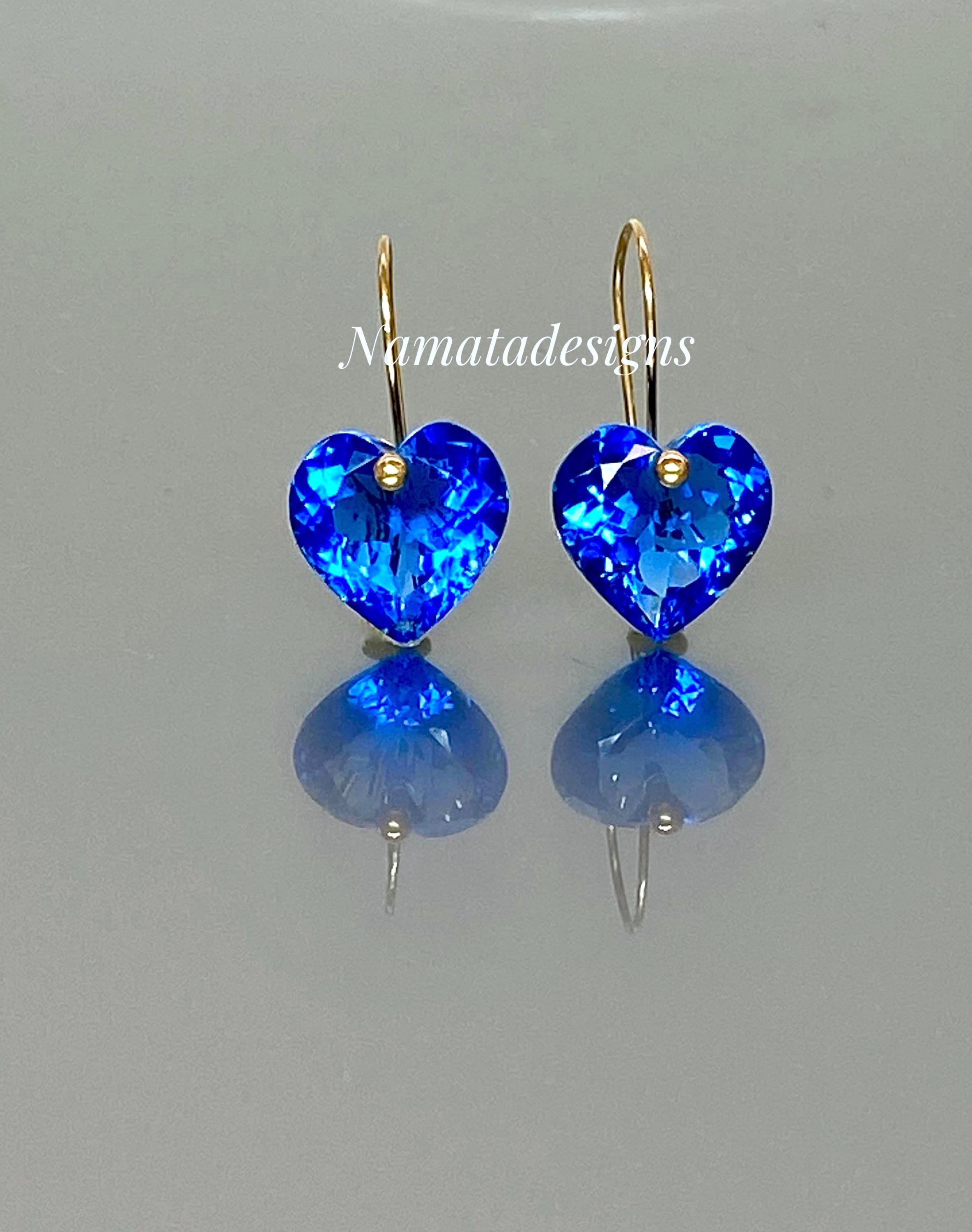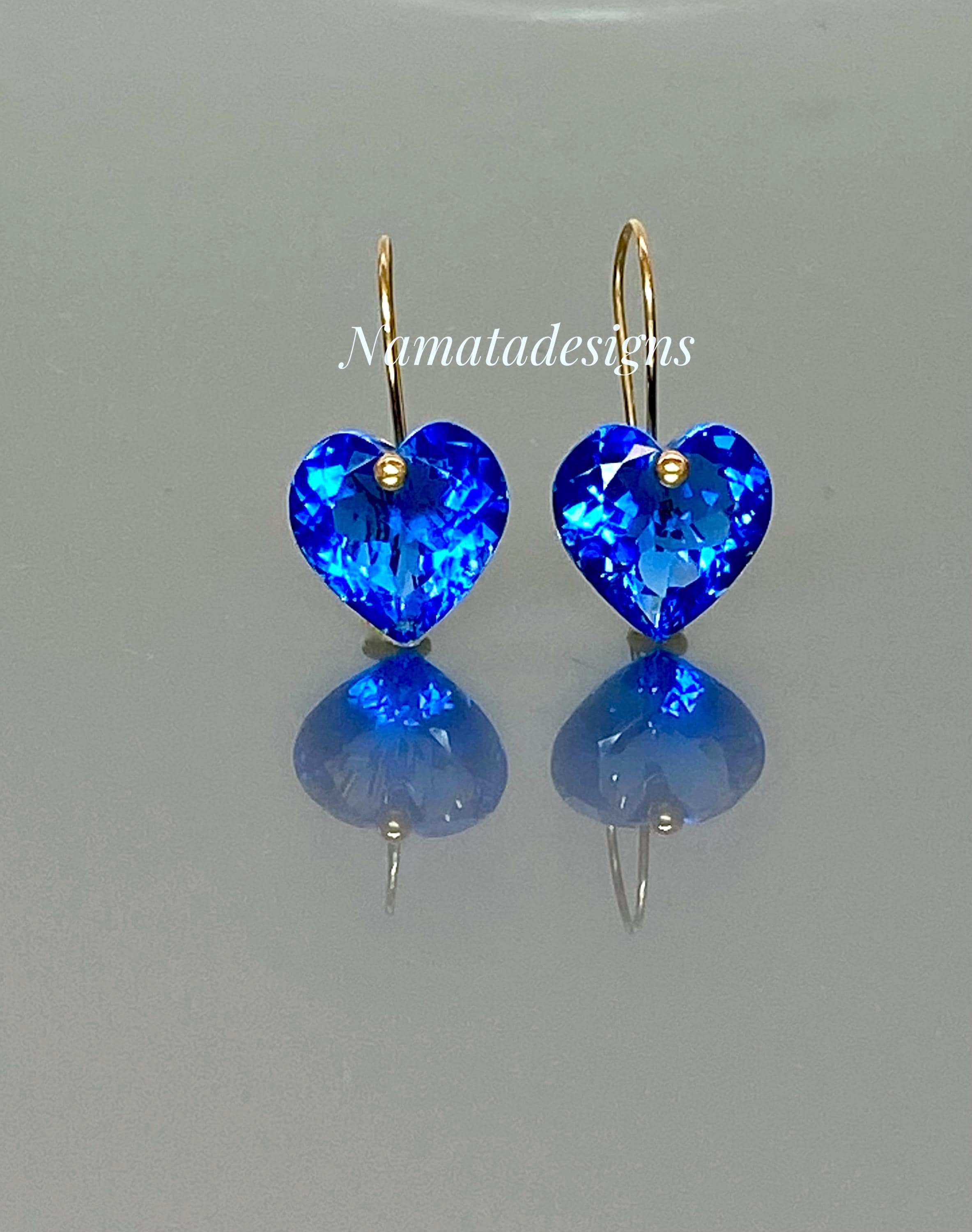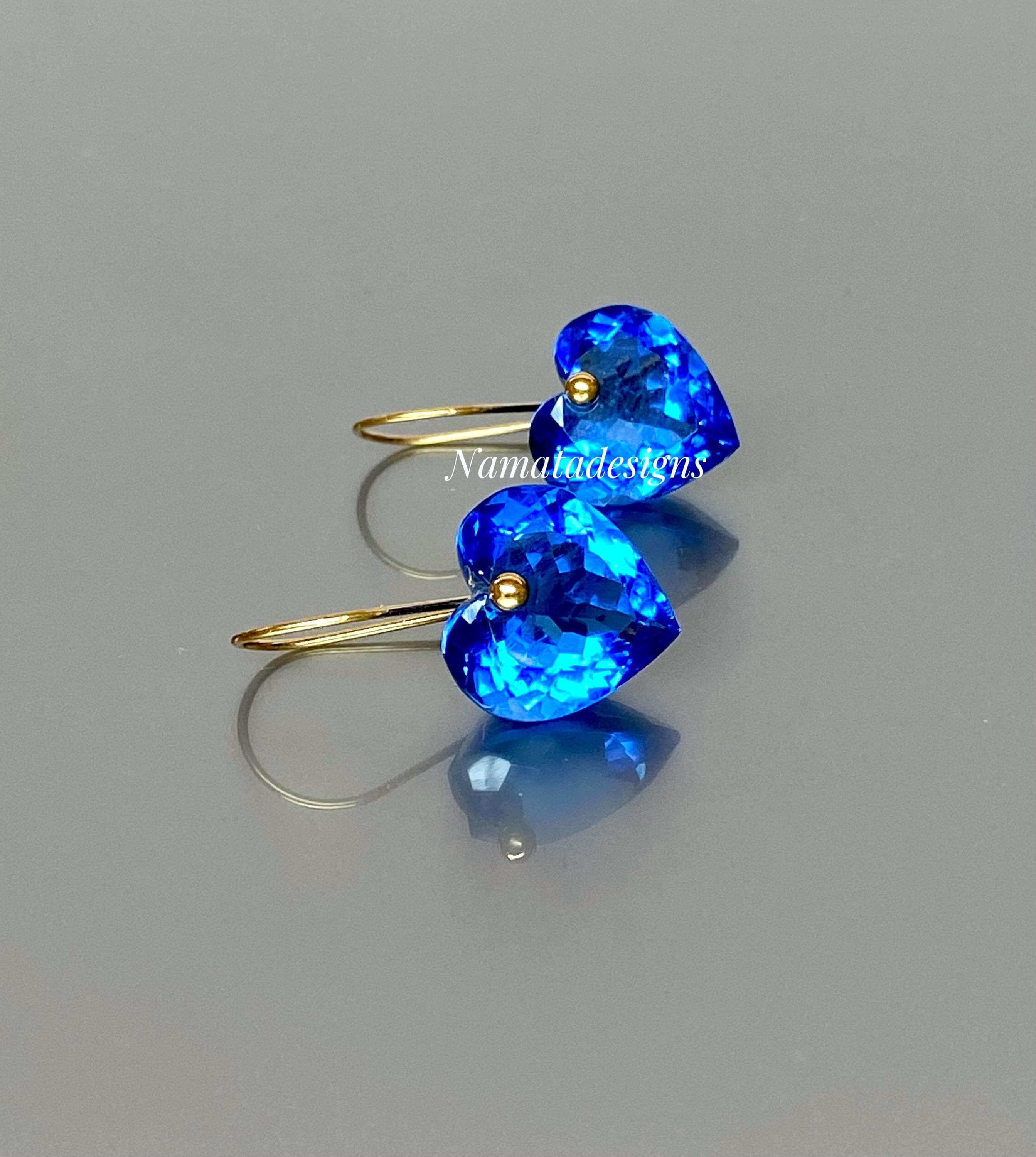 The faceted heart-shaped drops are flawless and feature beautiful blue-purplish colors. The drops are attached to 24k gold-Vermeil/ 14K/18K SOLID GOLD ear wires.