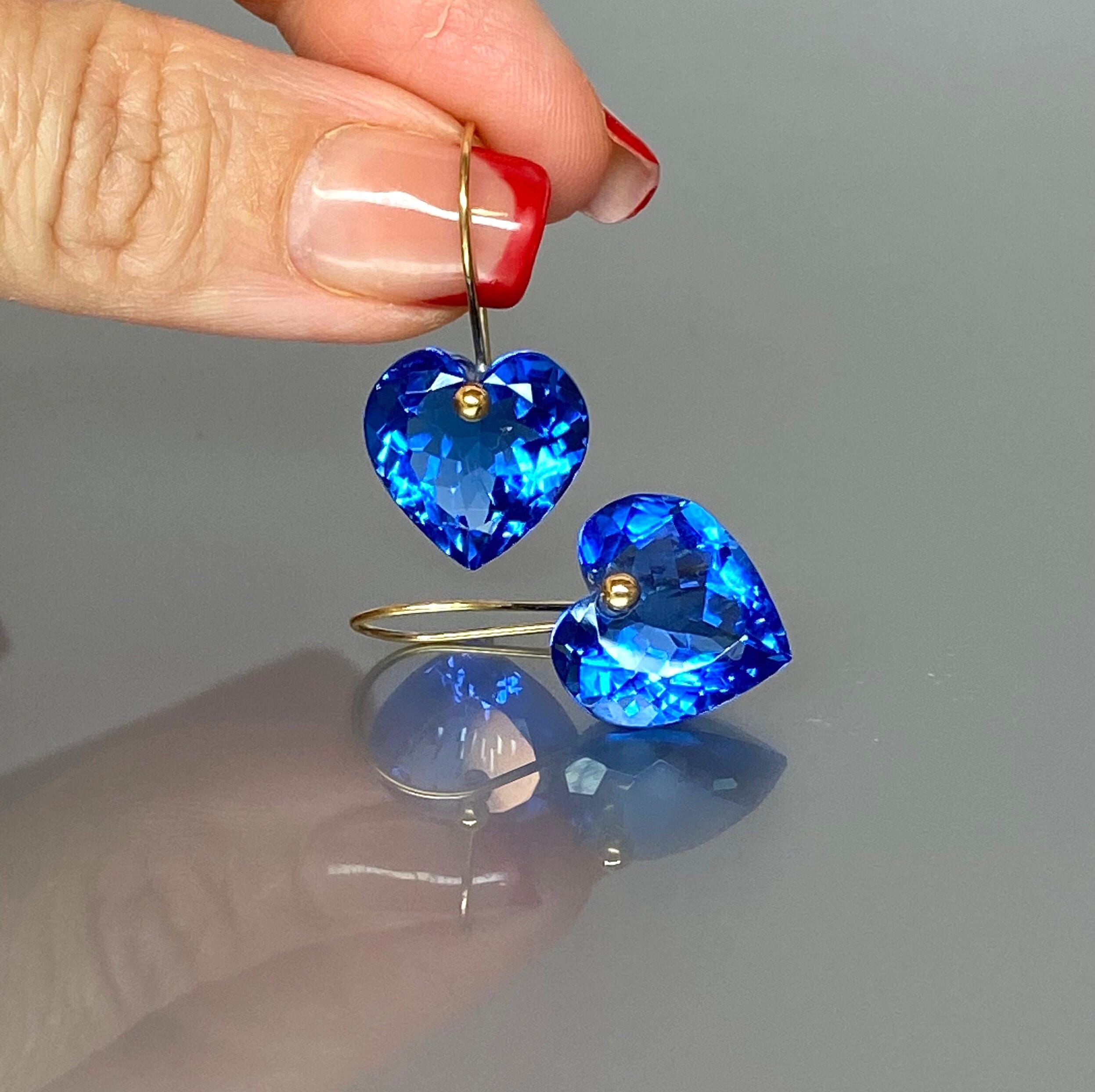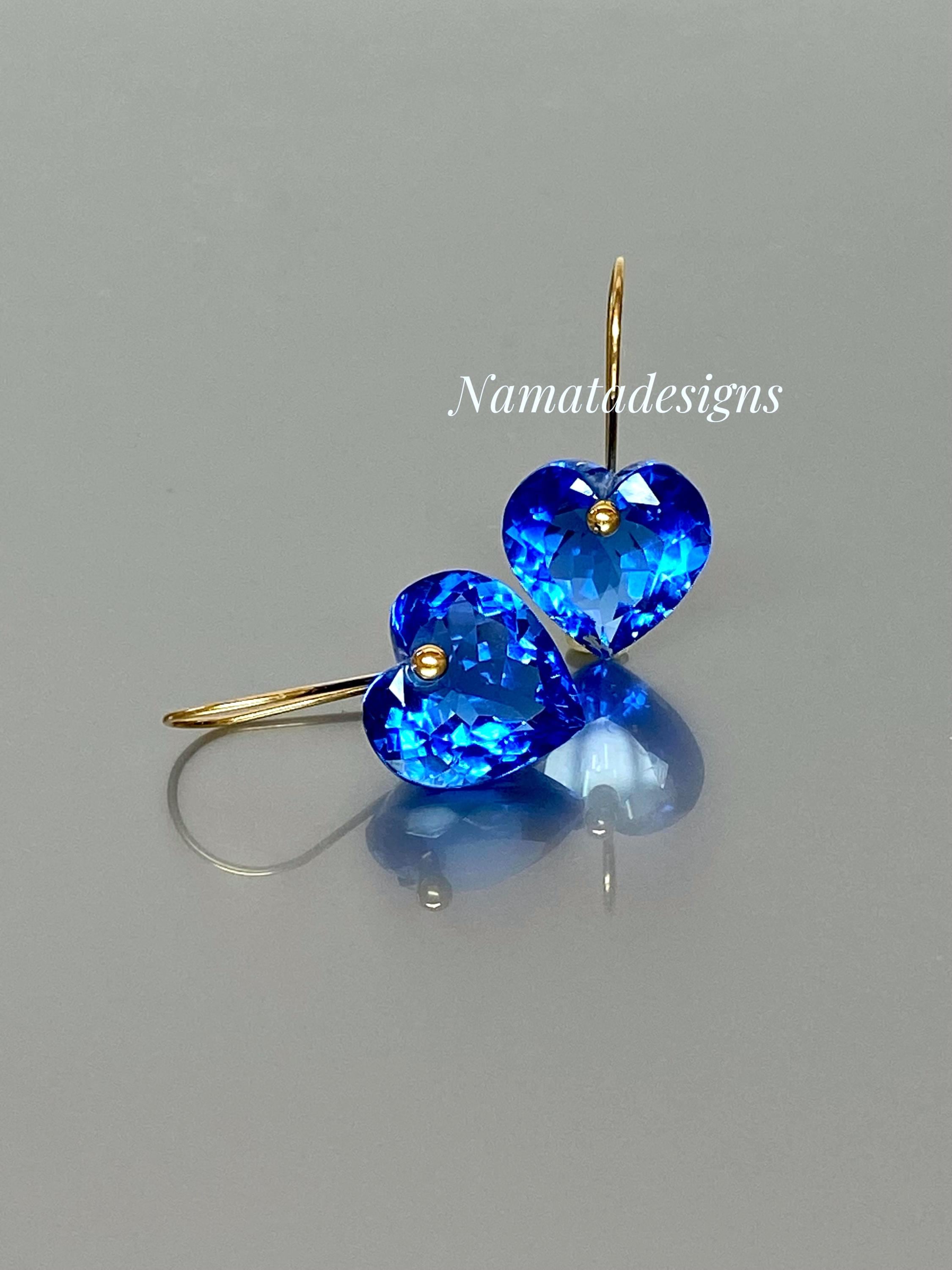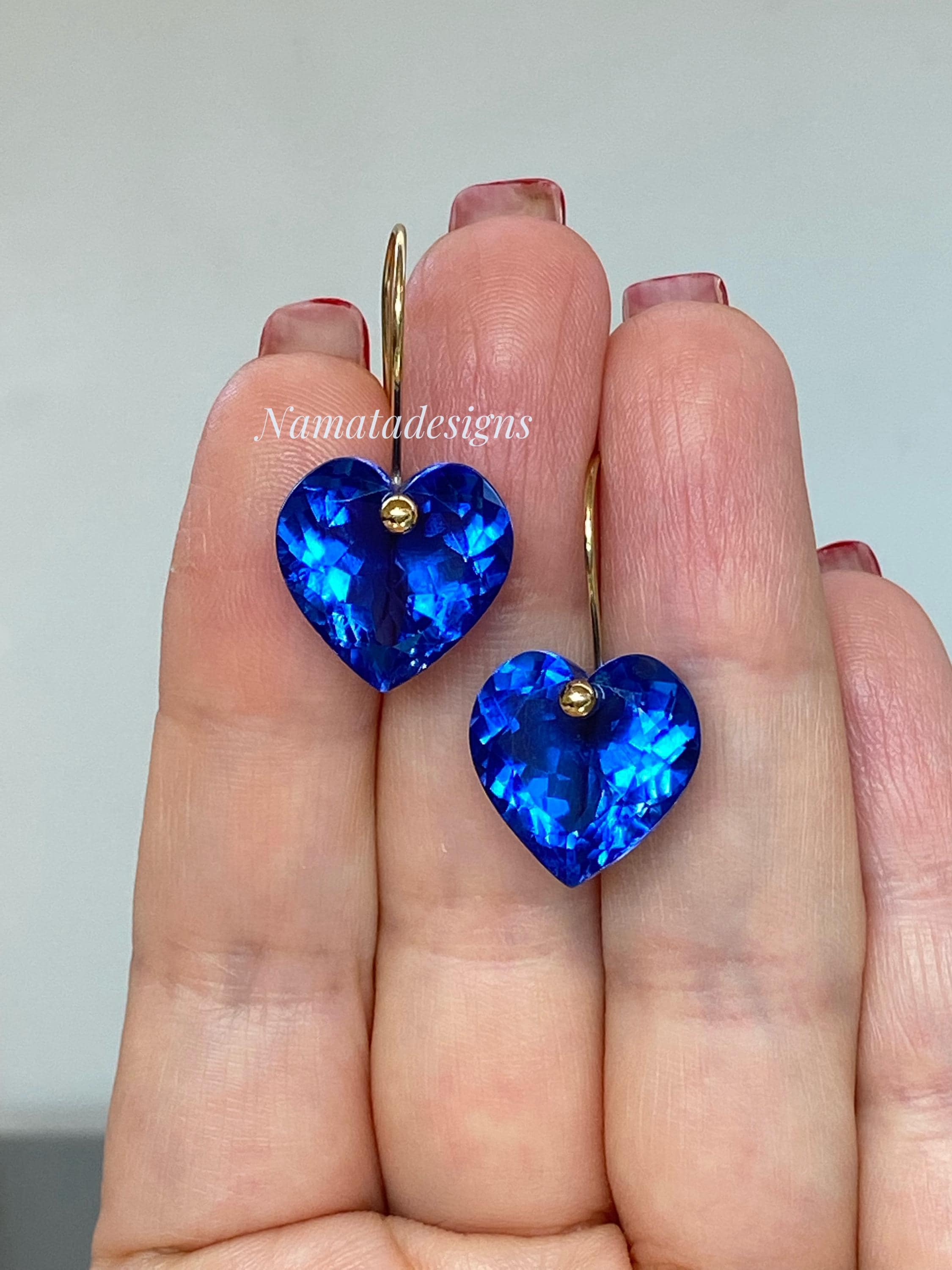 The faceted heart-shaped drops are flawless and feature beautiful blue-purplish colors. The drops are attached to 24k gold-Vermeil/ 14K/18K SOLID GOLD ear wires.