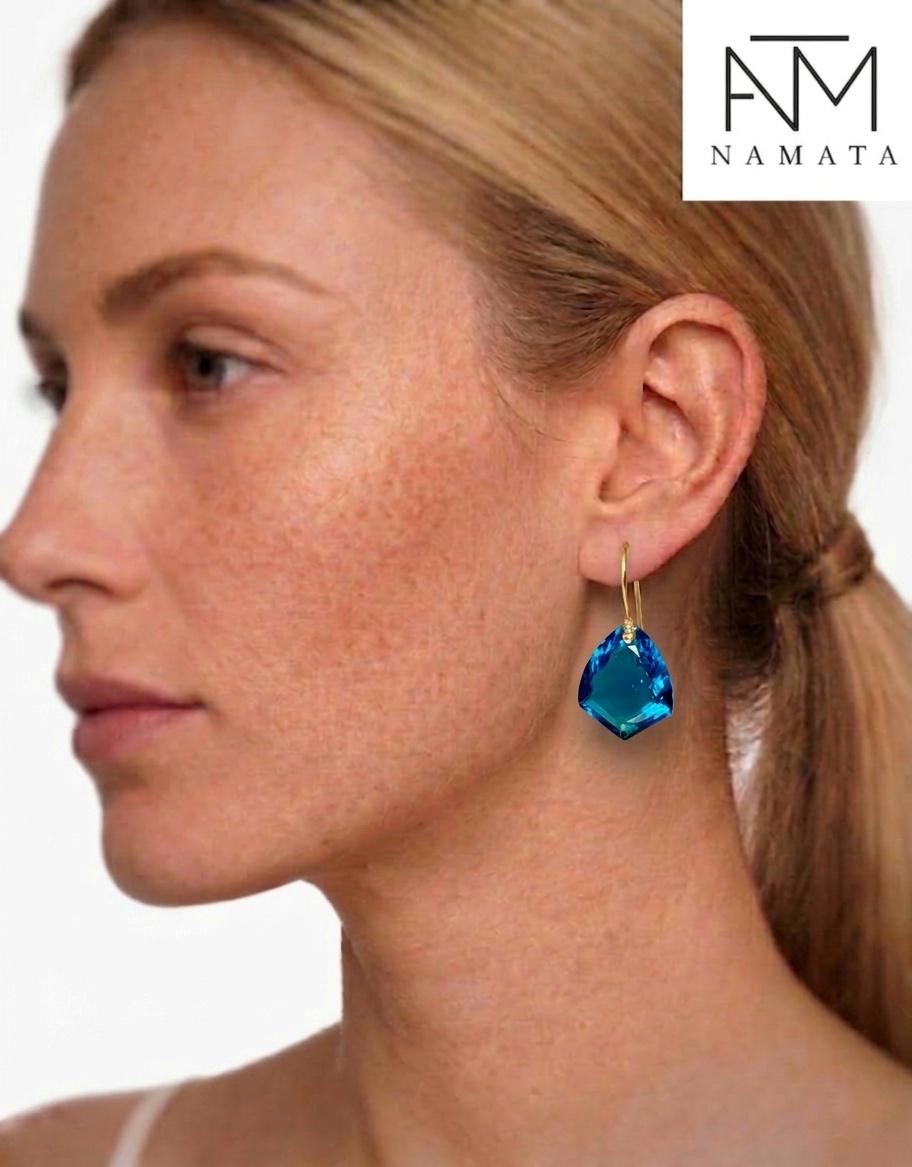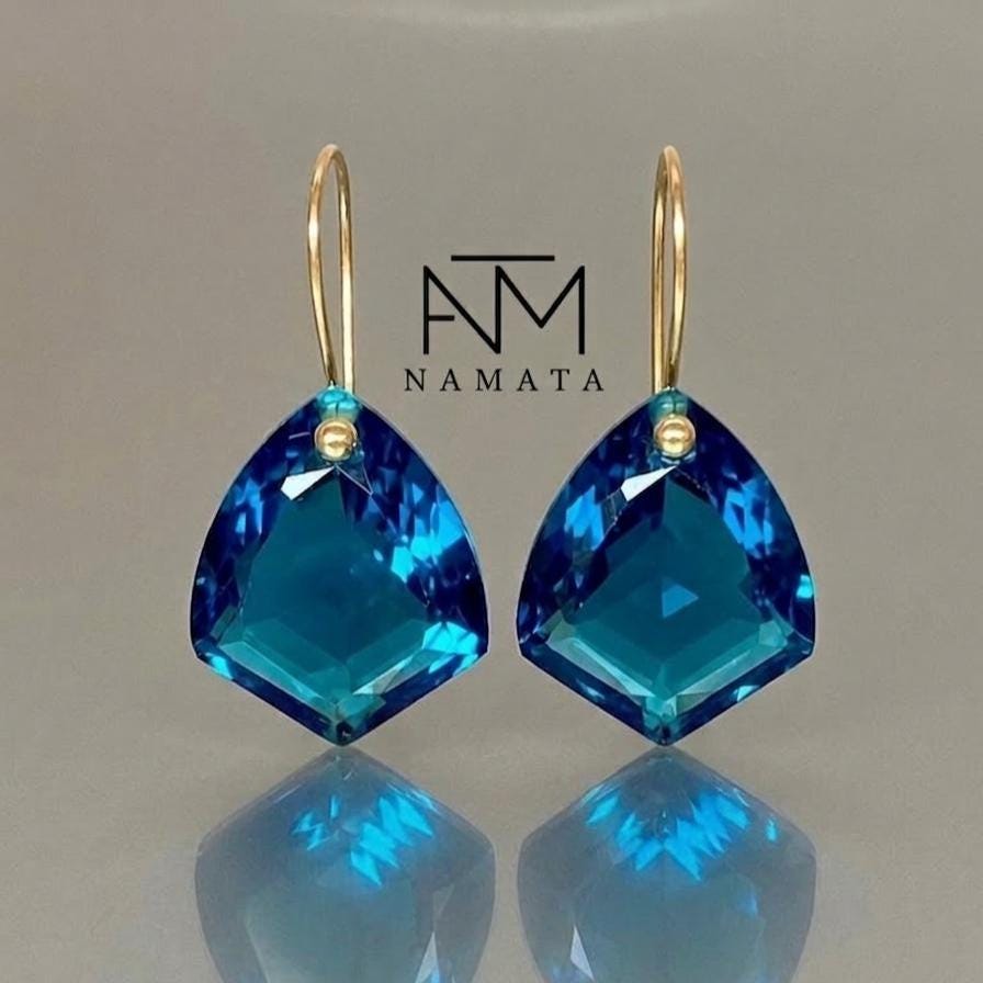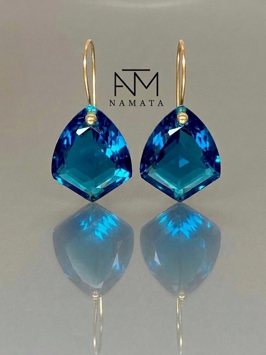 Gorgeous sparkly London blue topaz statement drop earrings. The Faceted unique shield shape drops are flawless and have the most vivid bright inky blue color that brings lots of depth to the stone and reflects lights beautifully. The drops are attached to vermeil ear wires/ 14K SOLID GOLD. The earrings are, elegant, have a lux look, and make a statement.