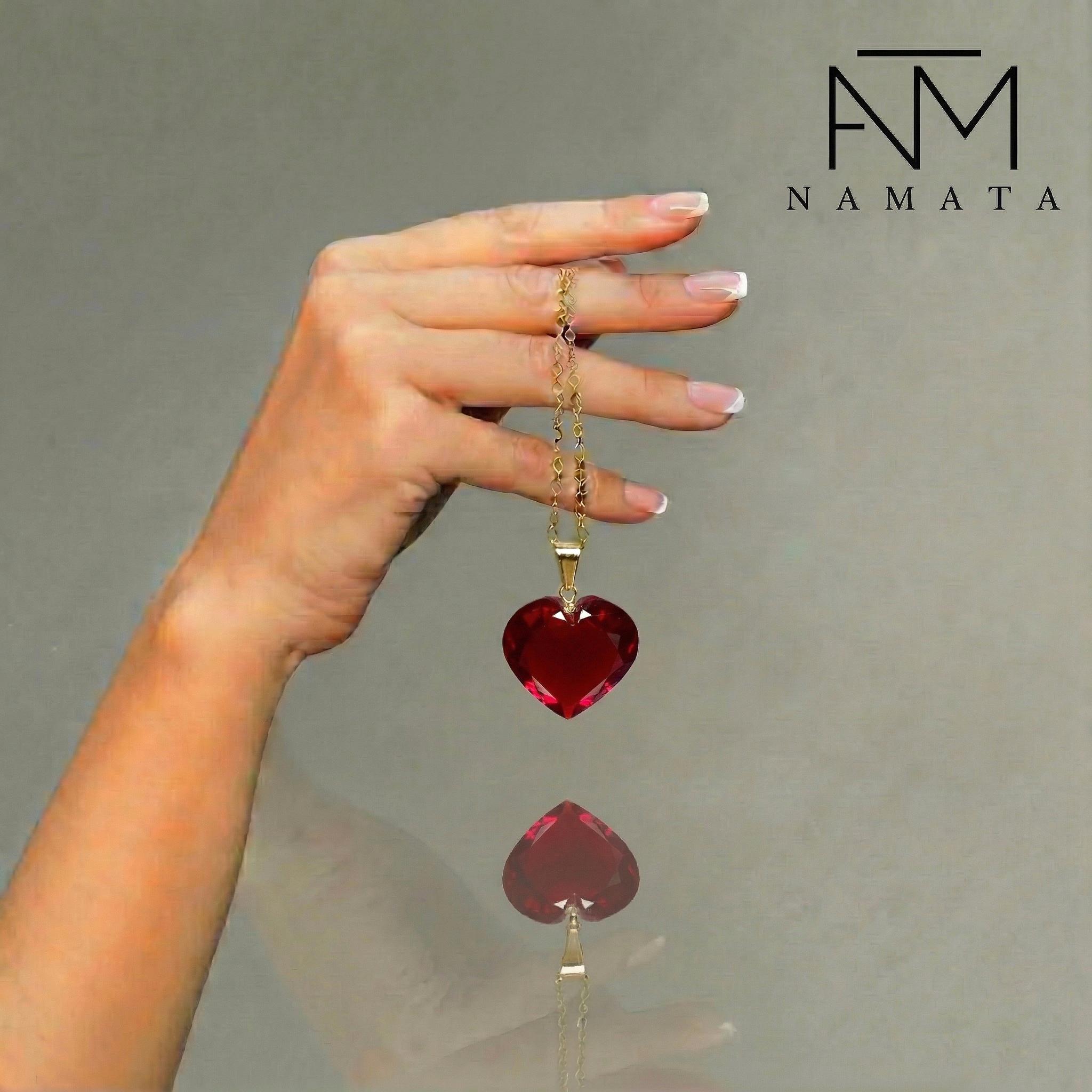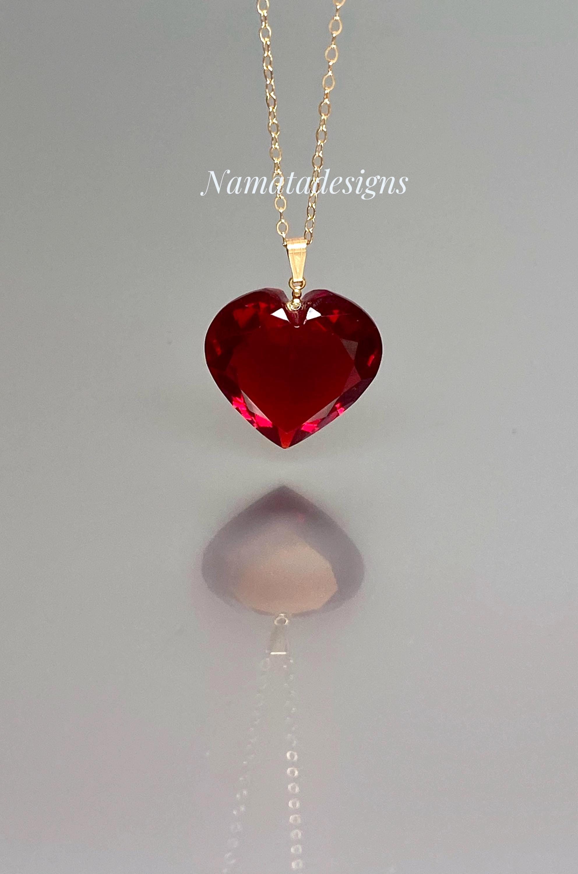 Gorgeous sparkly ruby pendant necklace. The Faceted heart-shaped pendant is flawless and has the most vivid wine-red color that brings lots of depth to the stone and reflects lights beautifully. The pendant is strung on a 14K gold filled chain. It is perfect for layering or looks great when worn alone.