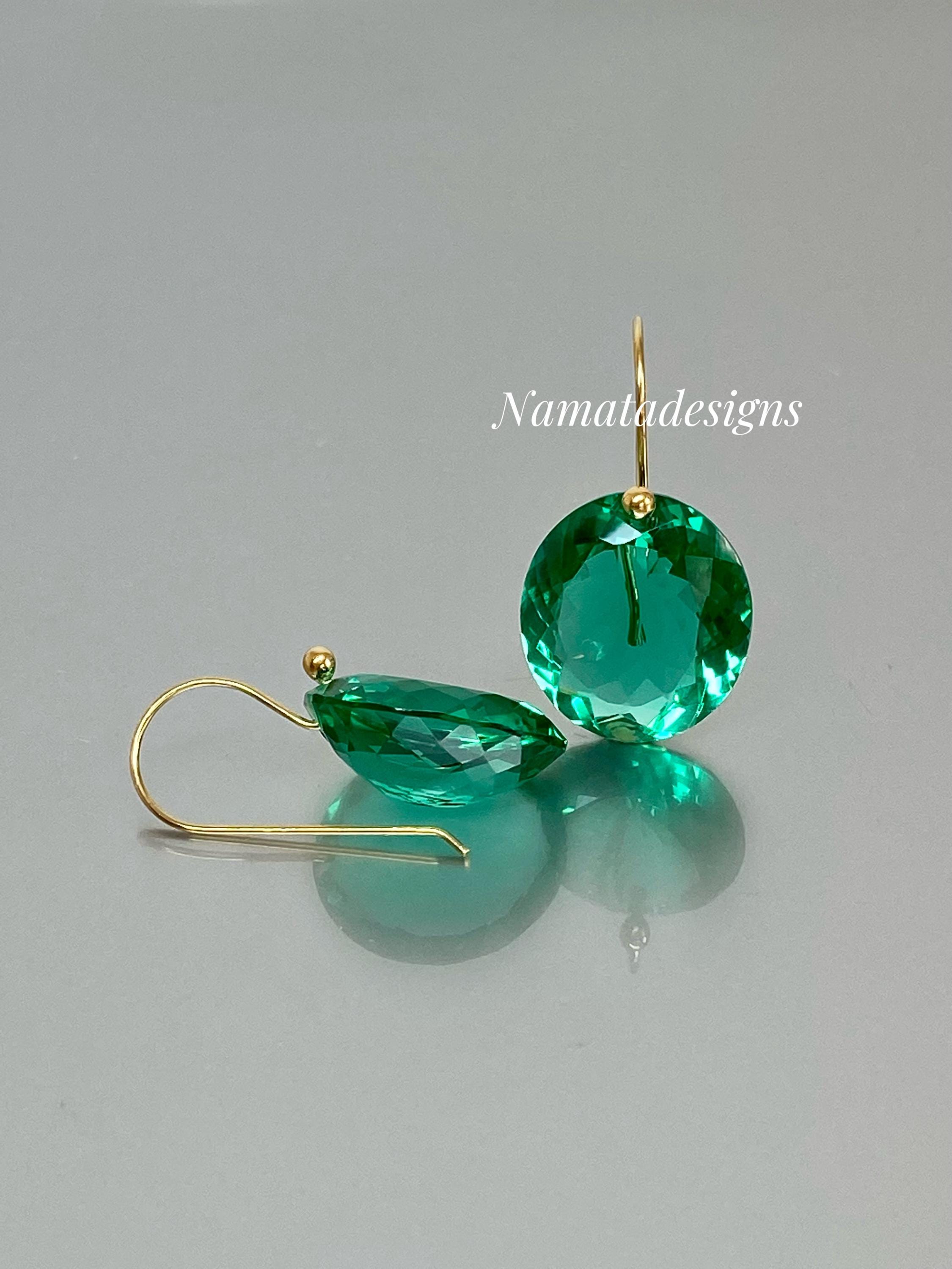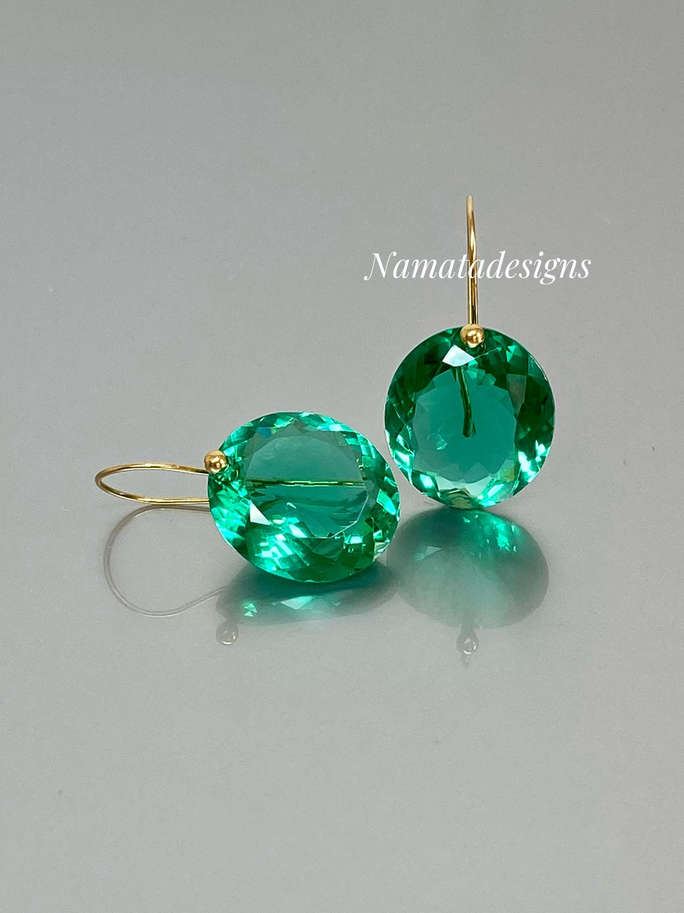 Beautiful Colombian emerald earrings in Brilliant drops. The faceted oval drops exhibit a breathtaking Caribbean ocean green hue, infusing the stones with remarkable depth and reflecting light with captivating beauty.
