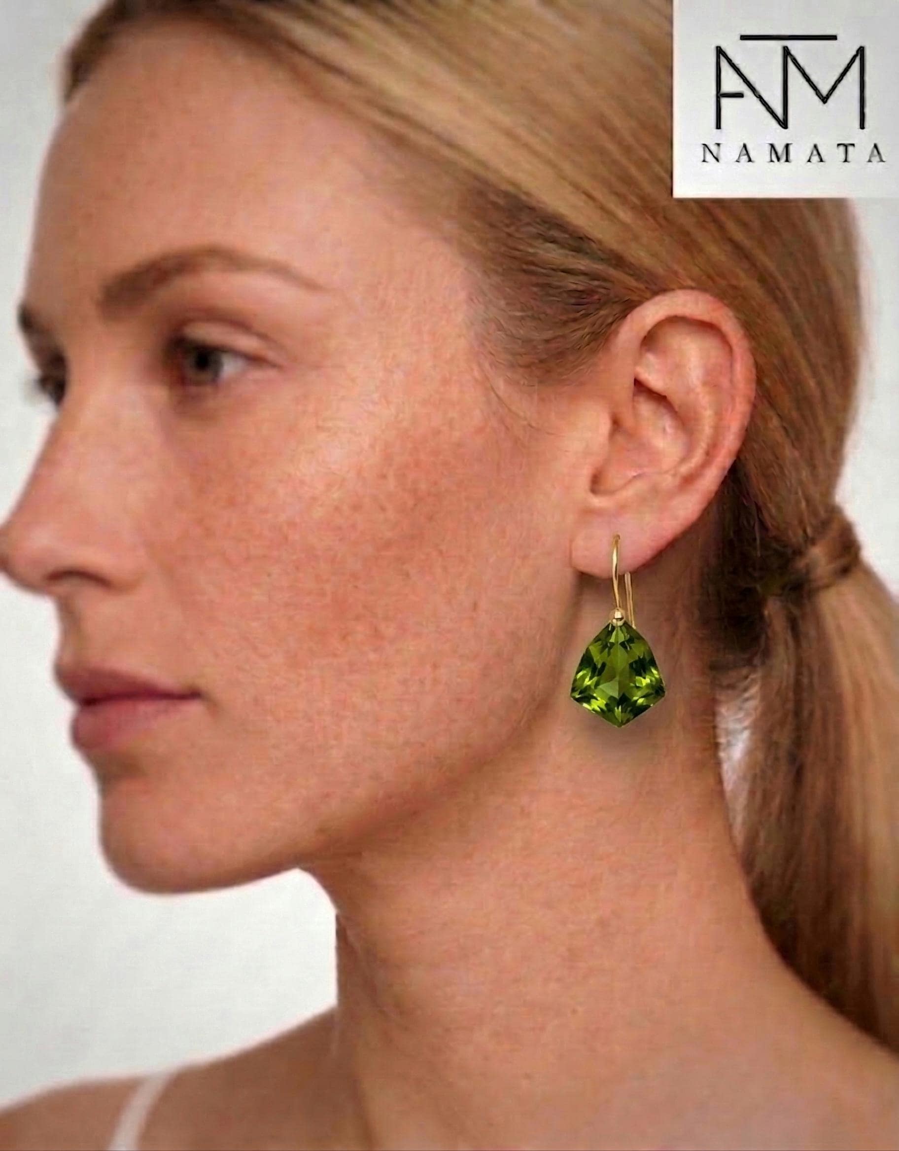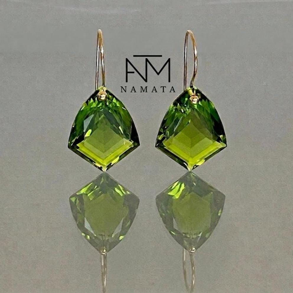 Exquisite sparkly peridot drop earrings that enchant the eye. The flawlessly faceted shield drops are not only pristine but also radiate a beautiful deep green color, captivating all who behold them. These ultra-fine oval drops are delicately suspended from ear wires crafted in 14K SOLID GOLD, adding a touch of opulence to their elegant and minimalist design.