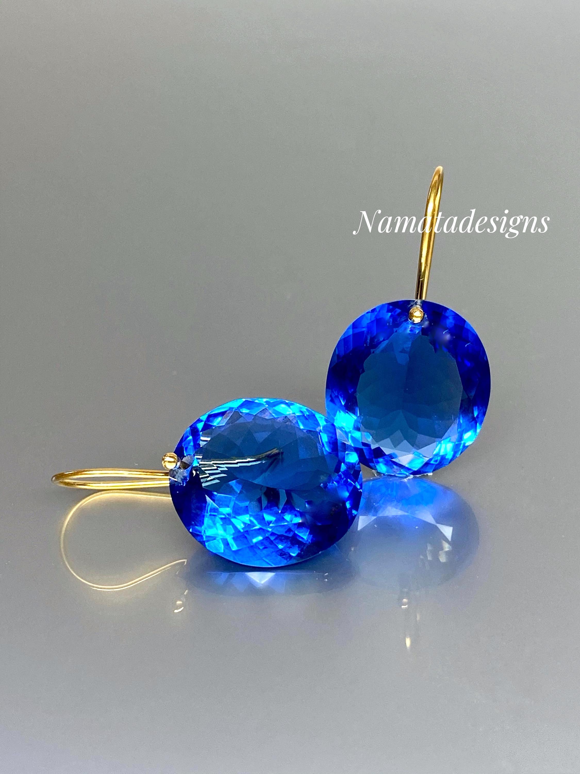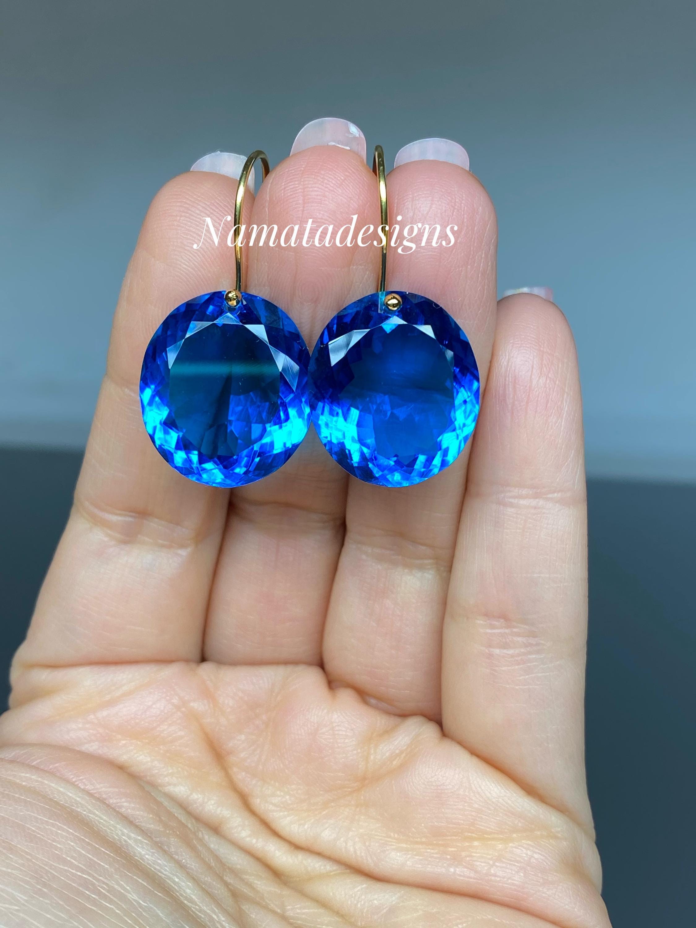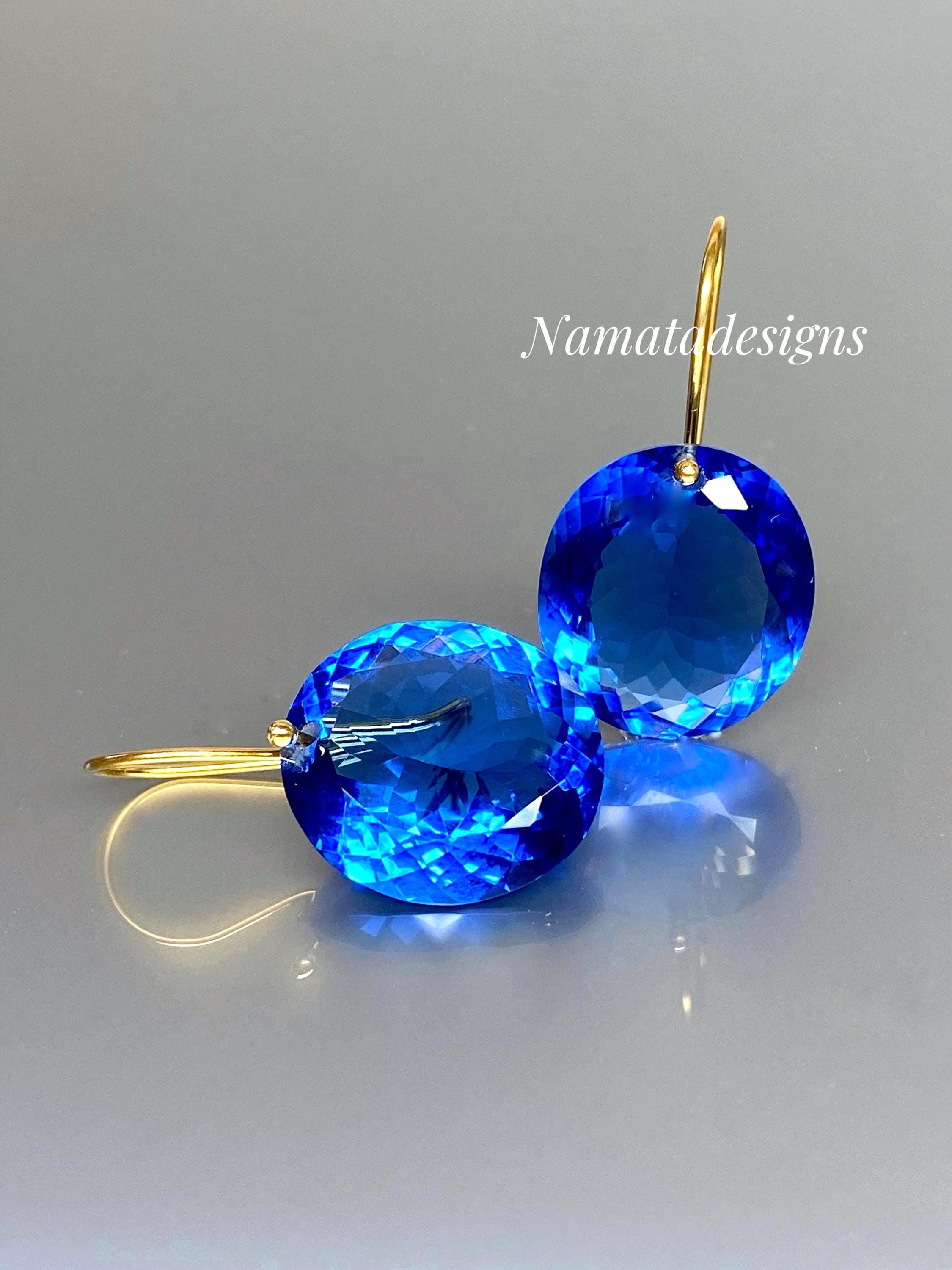 Gorgeous sparkly Swiss Blue Topaz earrings. The Faceted oval drops are flawless and eye-clean and have a beautiful vivid clear deep blue color. The earrings are elegant and bold and make a statement.