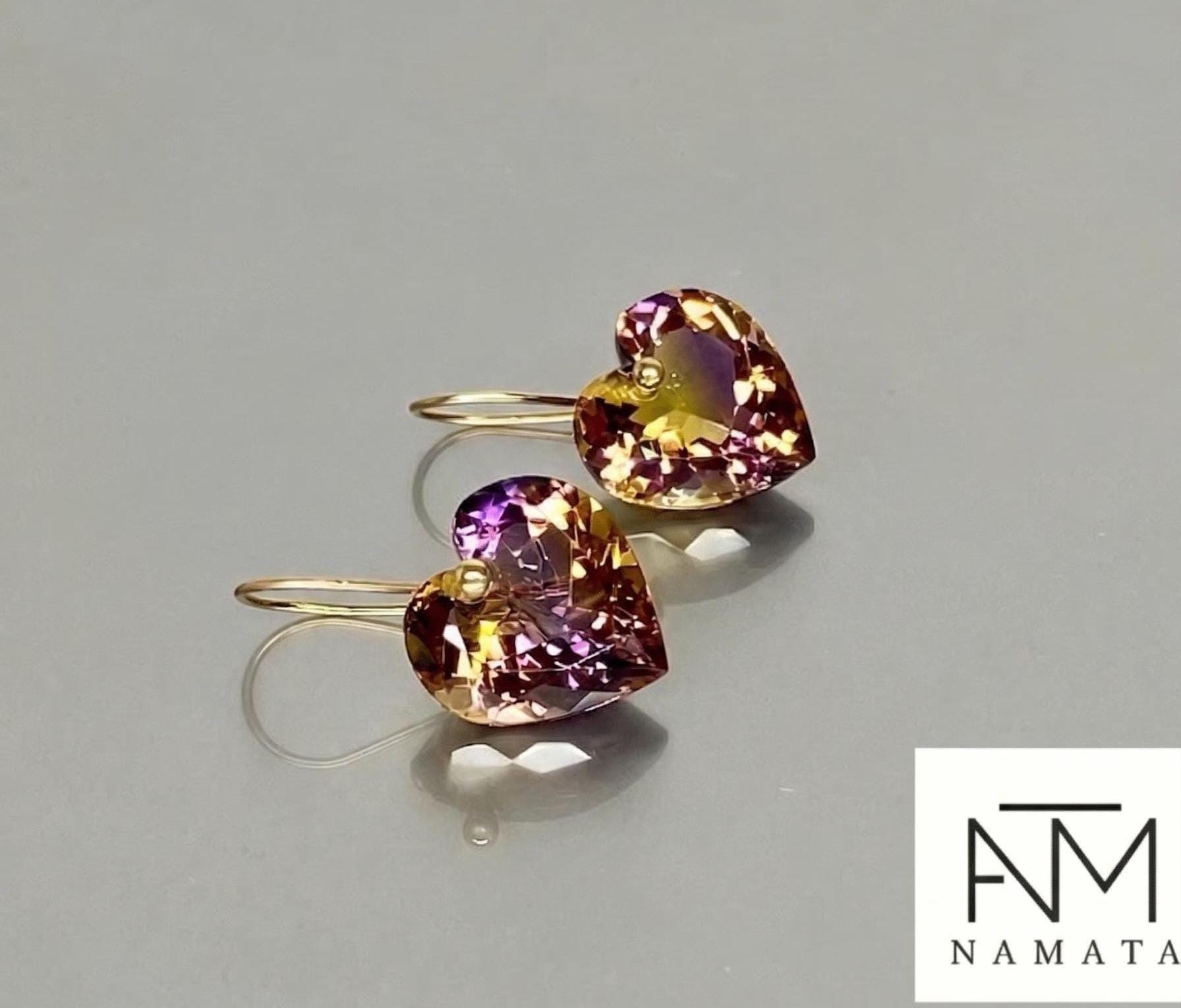 Gorgeous sparkly bi-color ametrine earrings. The faceted heart shape drops have a beautiful color blend of purple and yellow. They hang from 14K SOLID GOLD ear wires.