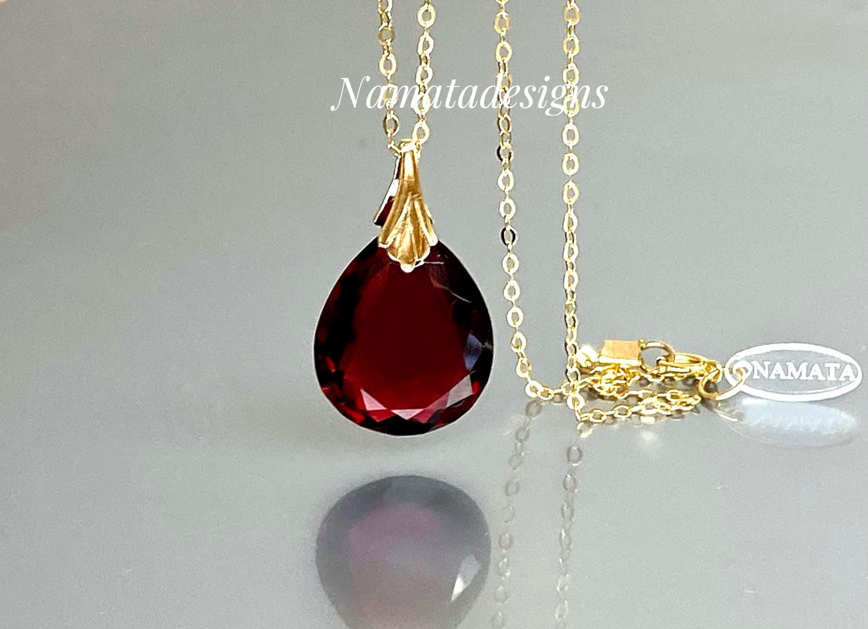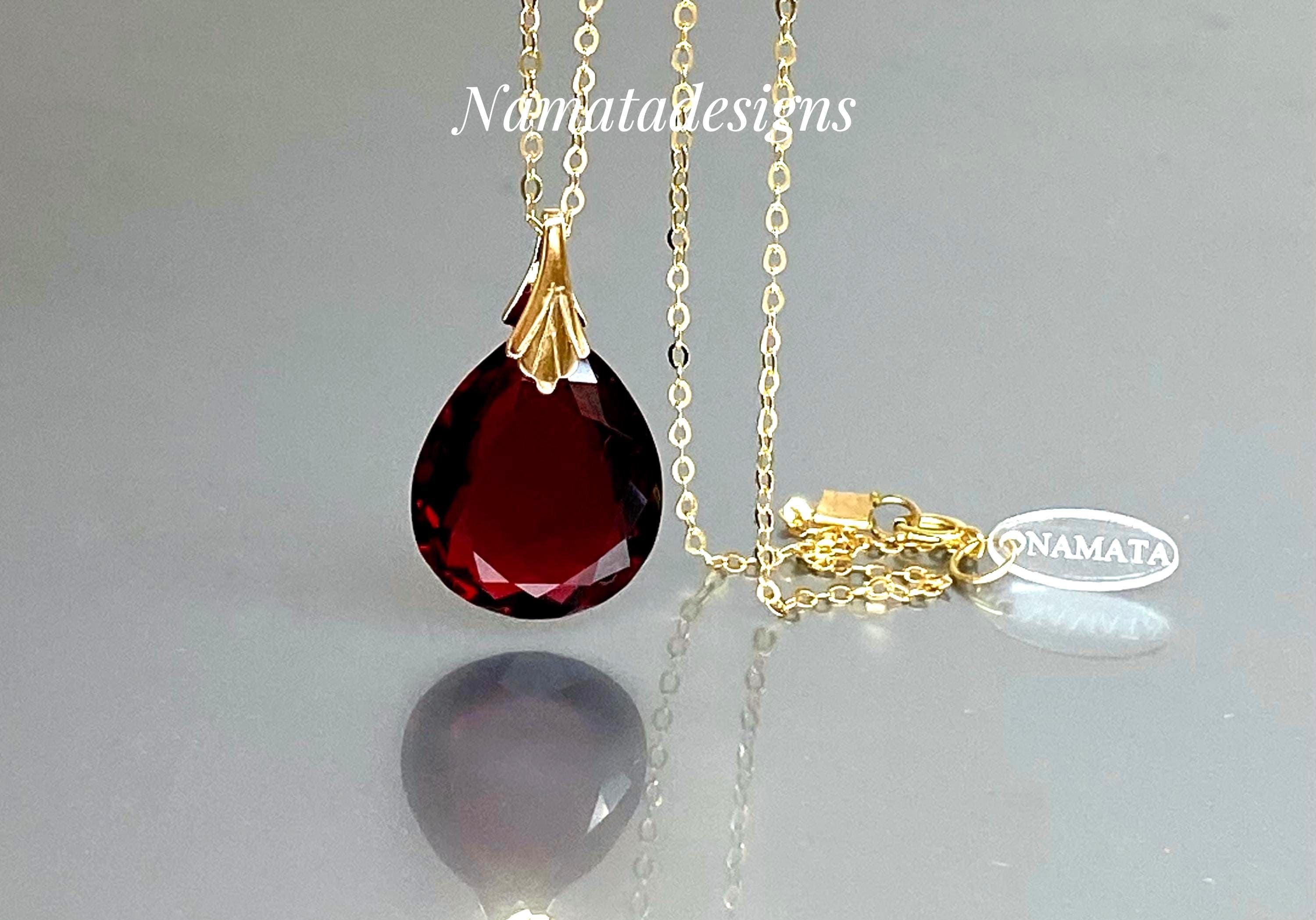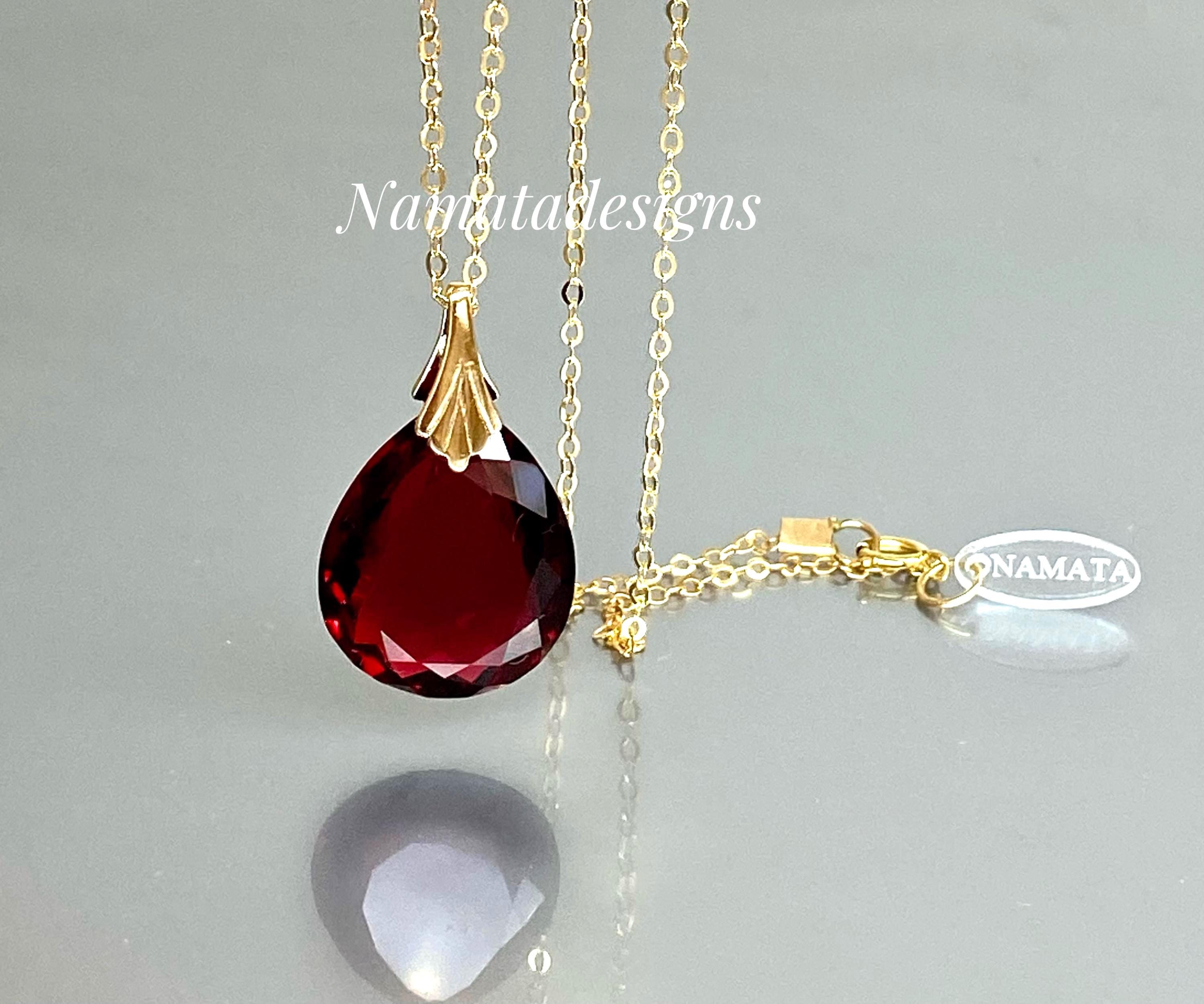 This pendant necklace showcases a gorgeous sparkly ruby pendant with a flawless, deep wine-red teardrop shape. The pendant exudes a captivating depth, reflecting light beautifully. It is gracefully strung on either a 14K gold-filled or Sterling Silver chain, offering versatility for layering with other necklaces or making a striking statement when worn alone.