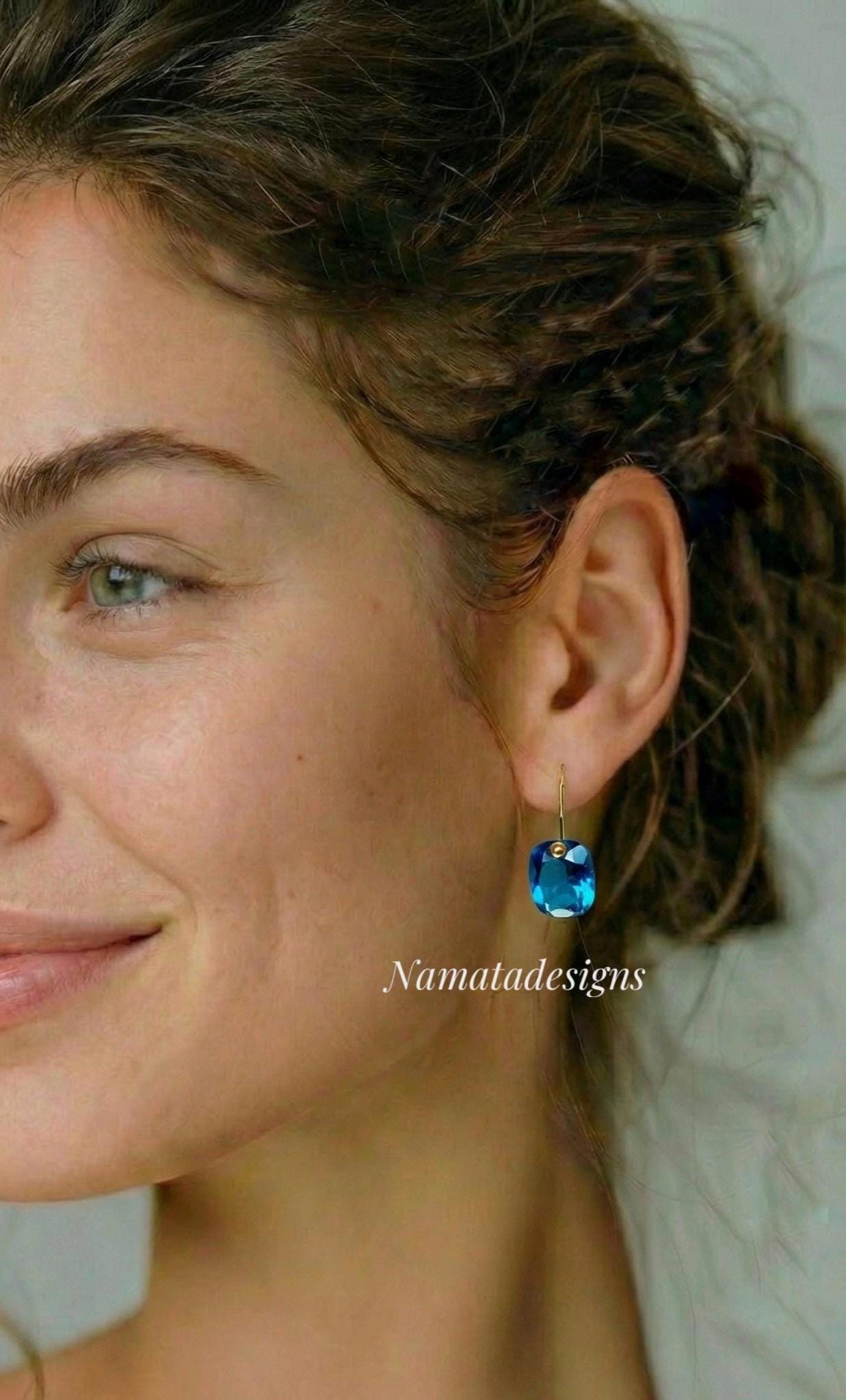 Elegant London blue topaz earrings featuring stunning brilliant drops. These faceted rectangular drops showcase a mesmerizing blue hue, imbuing the stones with remarkable depth and capturing and reflecting light beautifully.