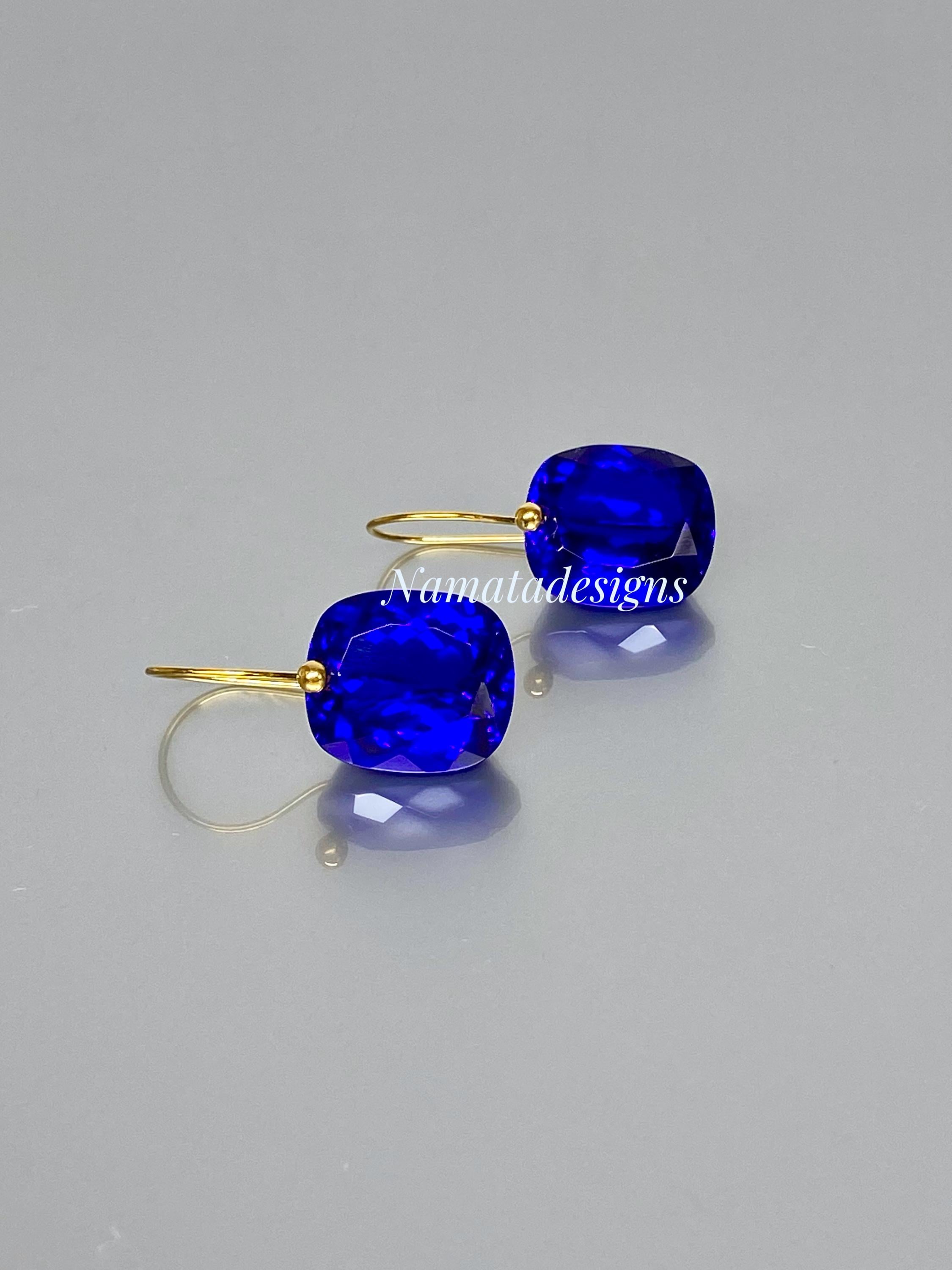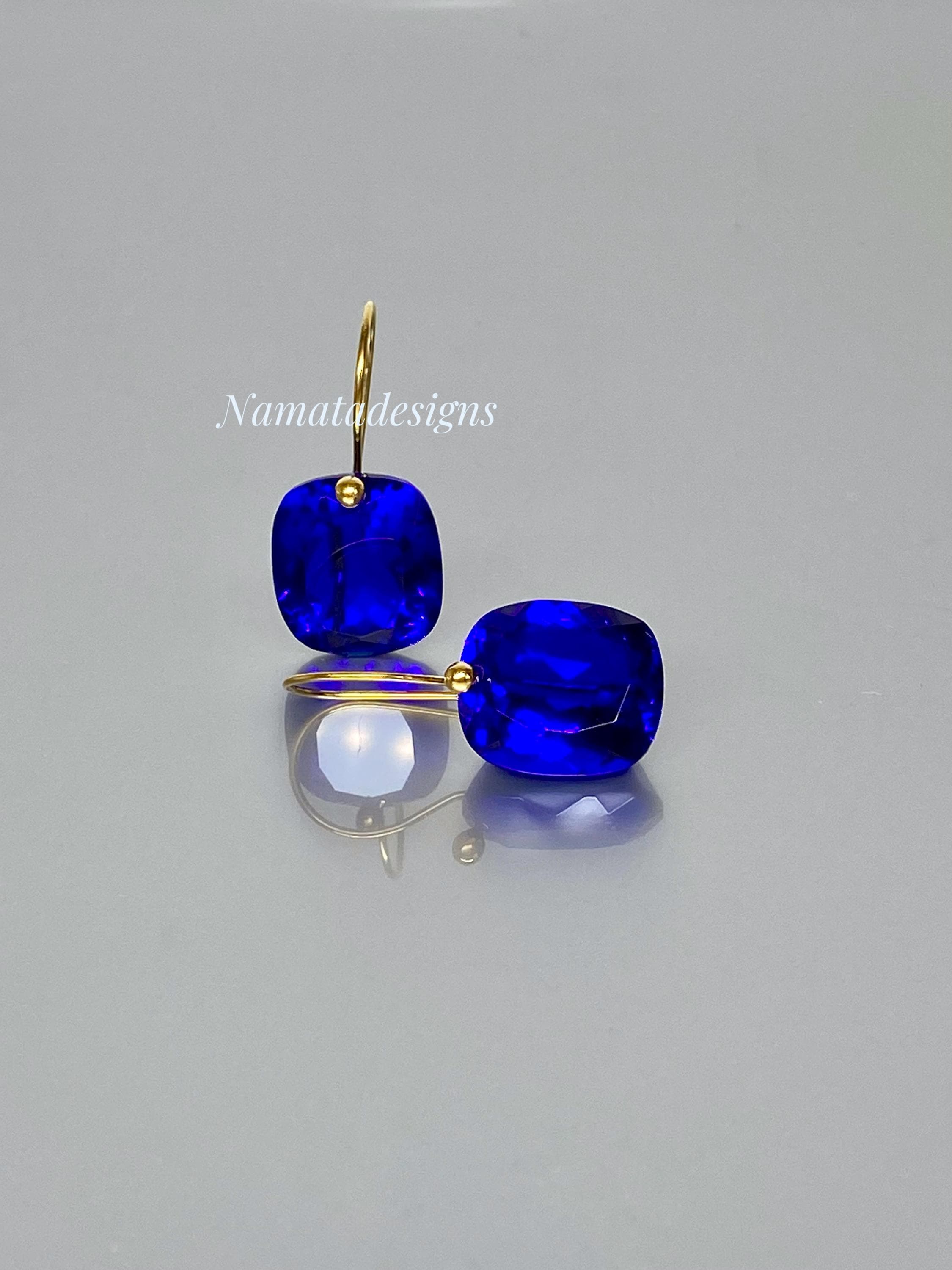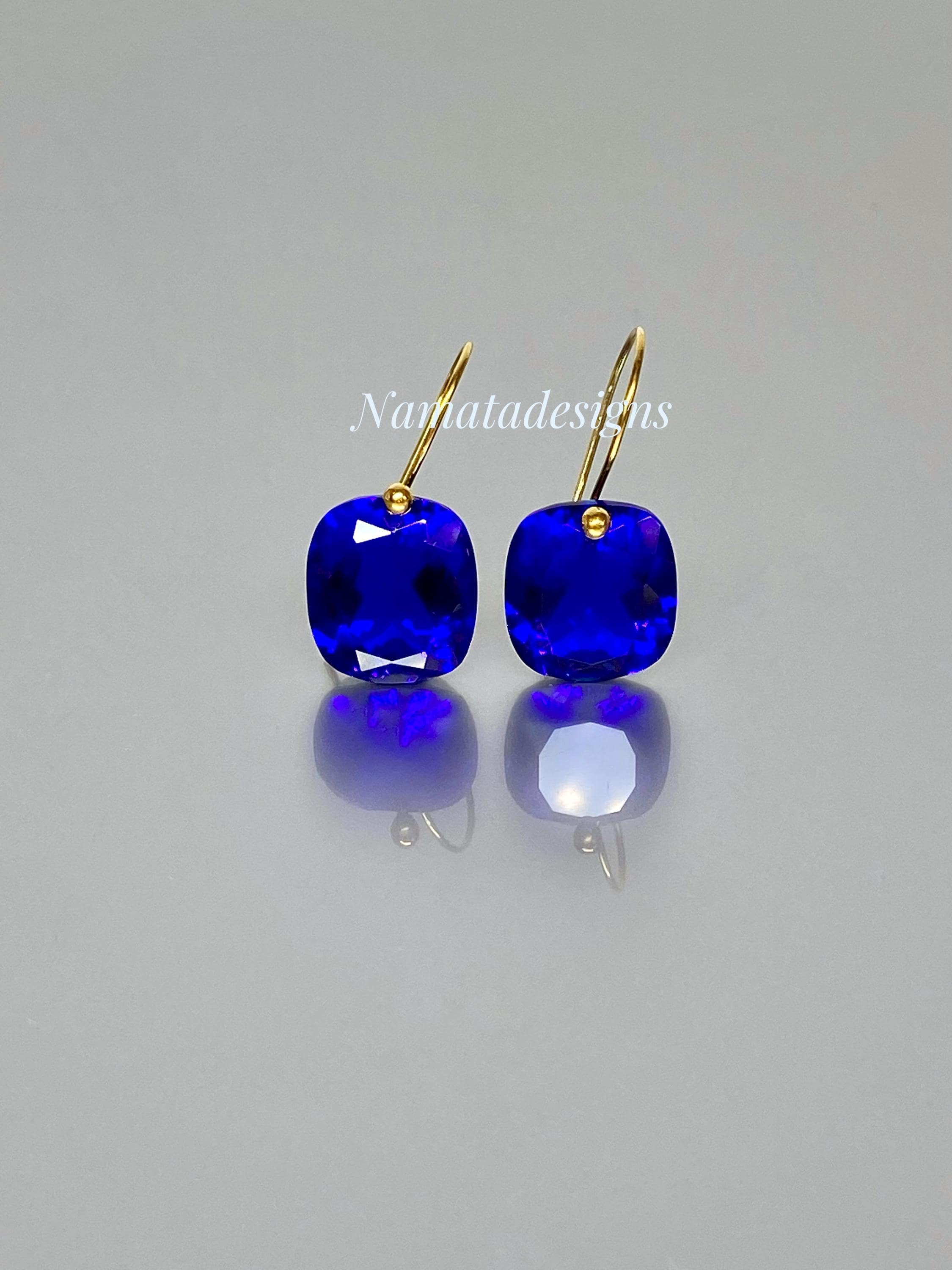 Beautiful faceted sapphire drop earrings in a mesmerizing ink-blue hue. The faceted emerald-cut drops are delicately affixed to ear wires and available in either 24K Gold Vermeil or 14K/ 18K SOLID GOLD, enhancing their elegant and luxurious appearance.