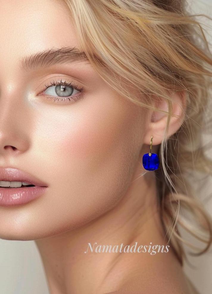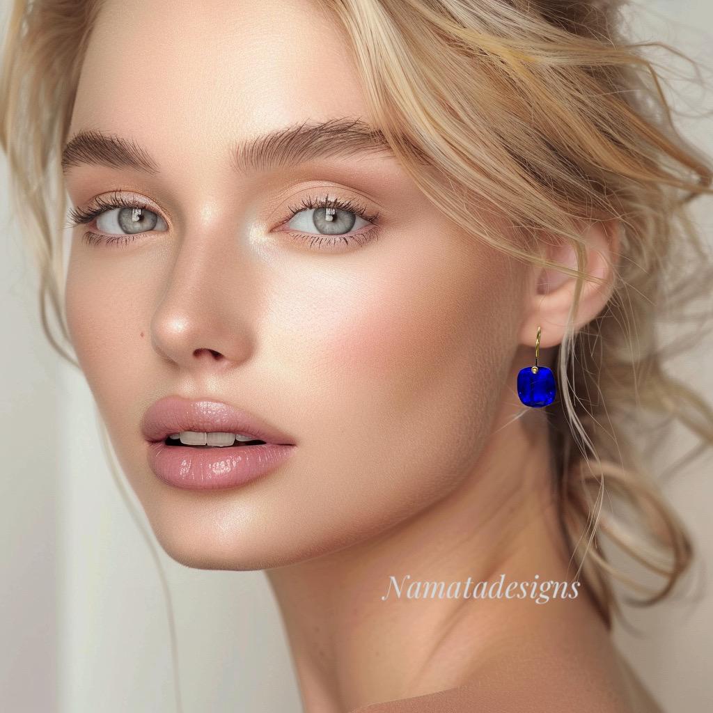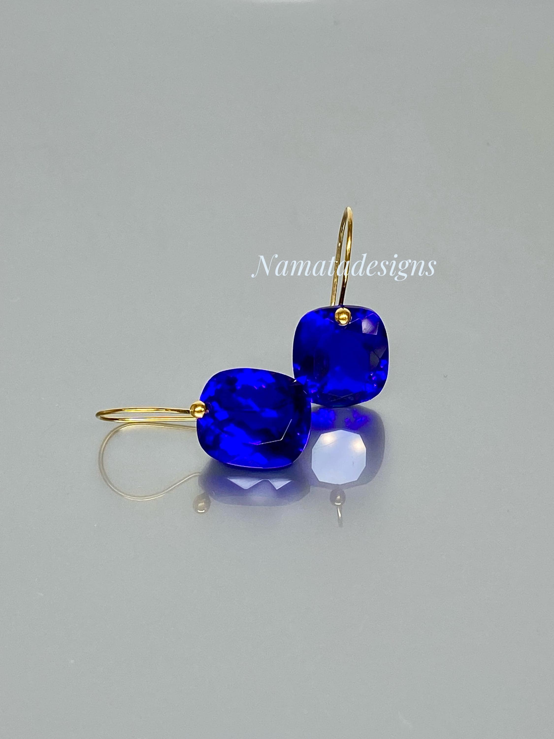 Beautiful faceted sapphire drop earrings in a mesmerizing ink-blue hue. The faceted emerald-cut drops are delicately affixed to ear wires and available in either 24K Gold Vermeil or 14K/ 18K SOLID GOLD, enhancing their elegant and luxurious appearance.
