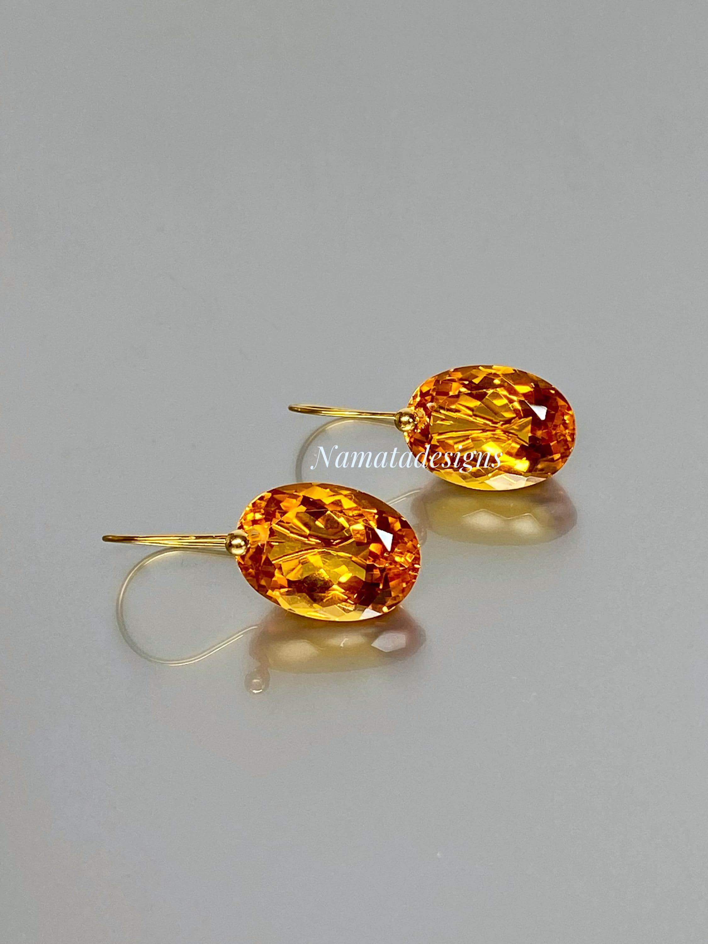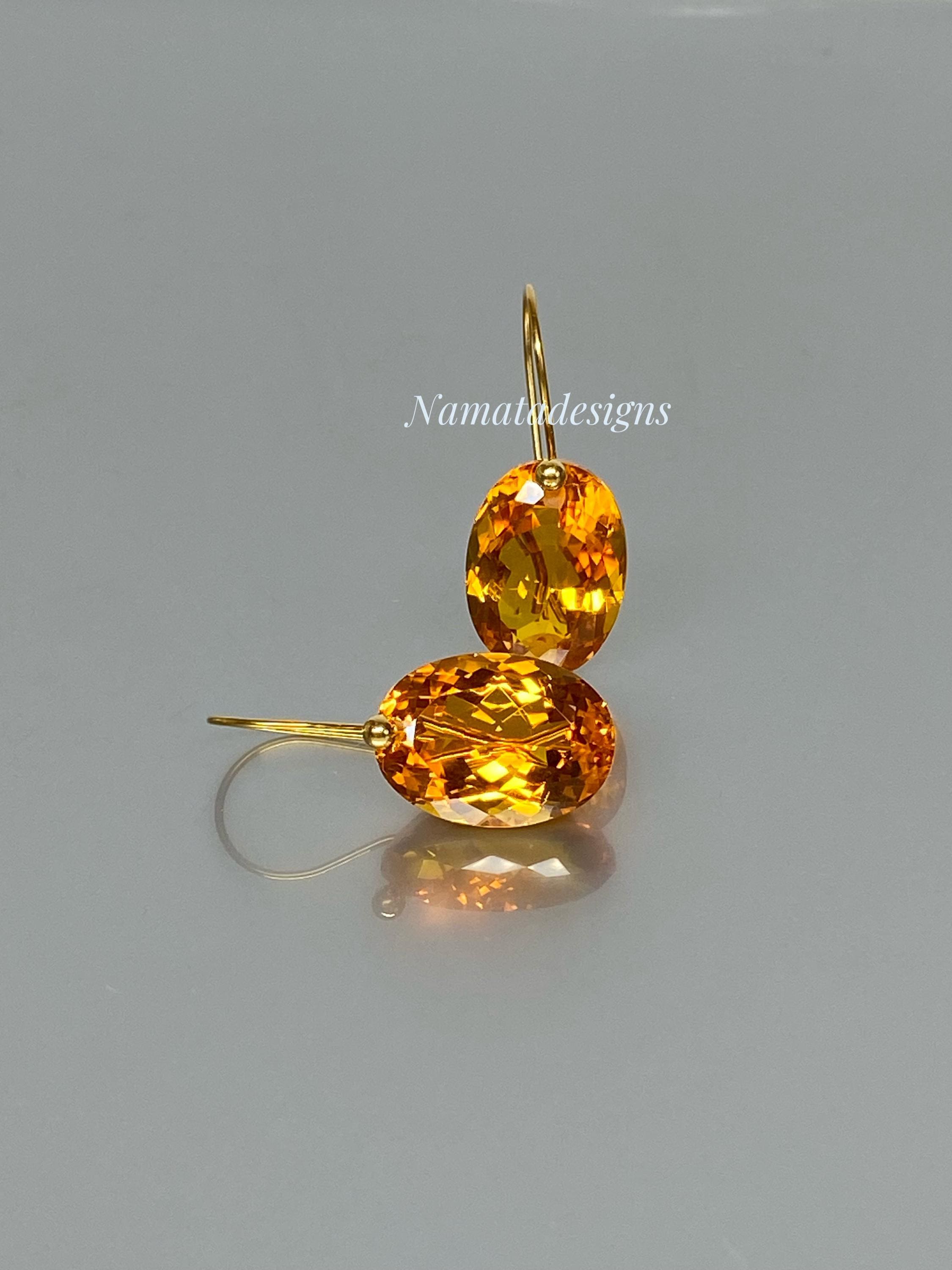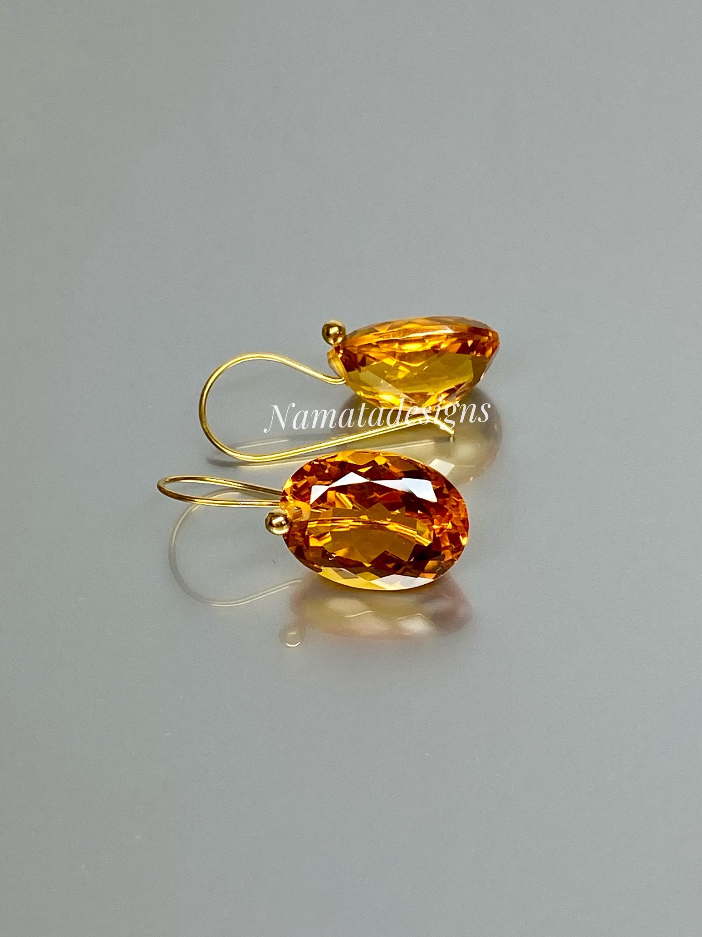 Exquisite earrings featuring faceted Citrine oval-shaped drops. The flawless citrine drops showcase stunning rich golden hues, suspended elegantly from 24K gold vermeil / 14K/18K SOLID GOLD ear wires. These earrings radiate sophistication and boast a luxurious aesthetic.