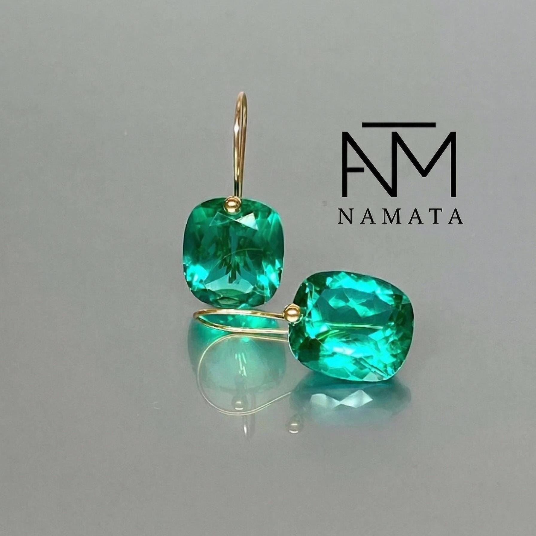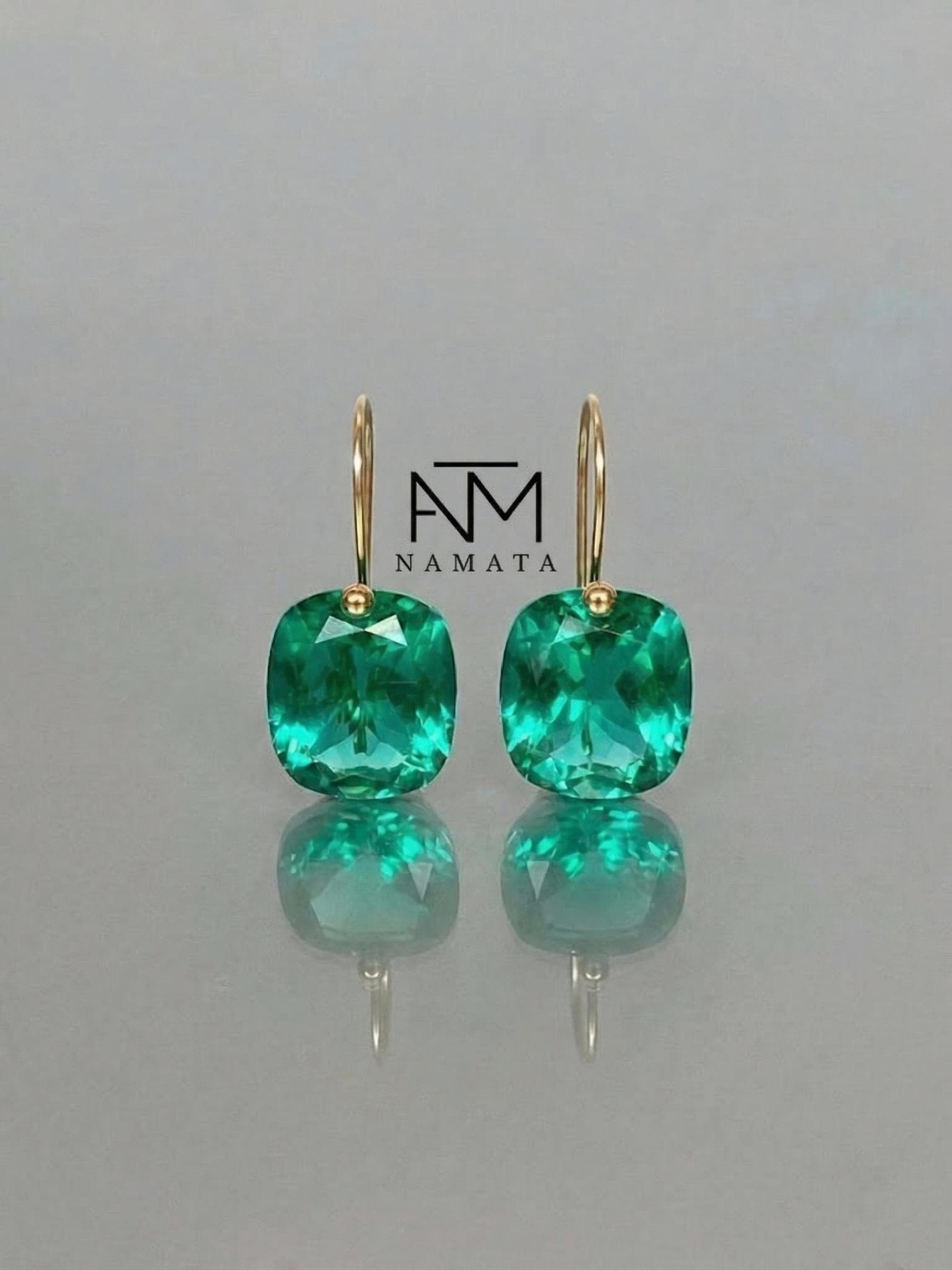 Beautiful Colombian emerald earrings in Brilliant drops. The faceted rectangle drops have a gorgeous Caribean ocean green color that brings lots of depth to the stone and reflects light beautifully. The fancy drops are expertly attached to ear wires made of either 24K Gold Vermeil or 14K SOLID GOLD, adding a touch of opulence to their elegance.