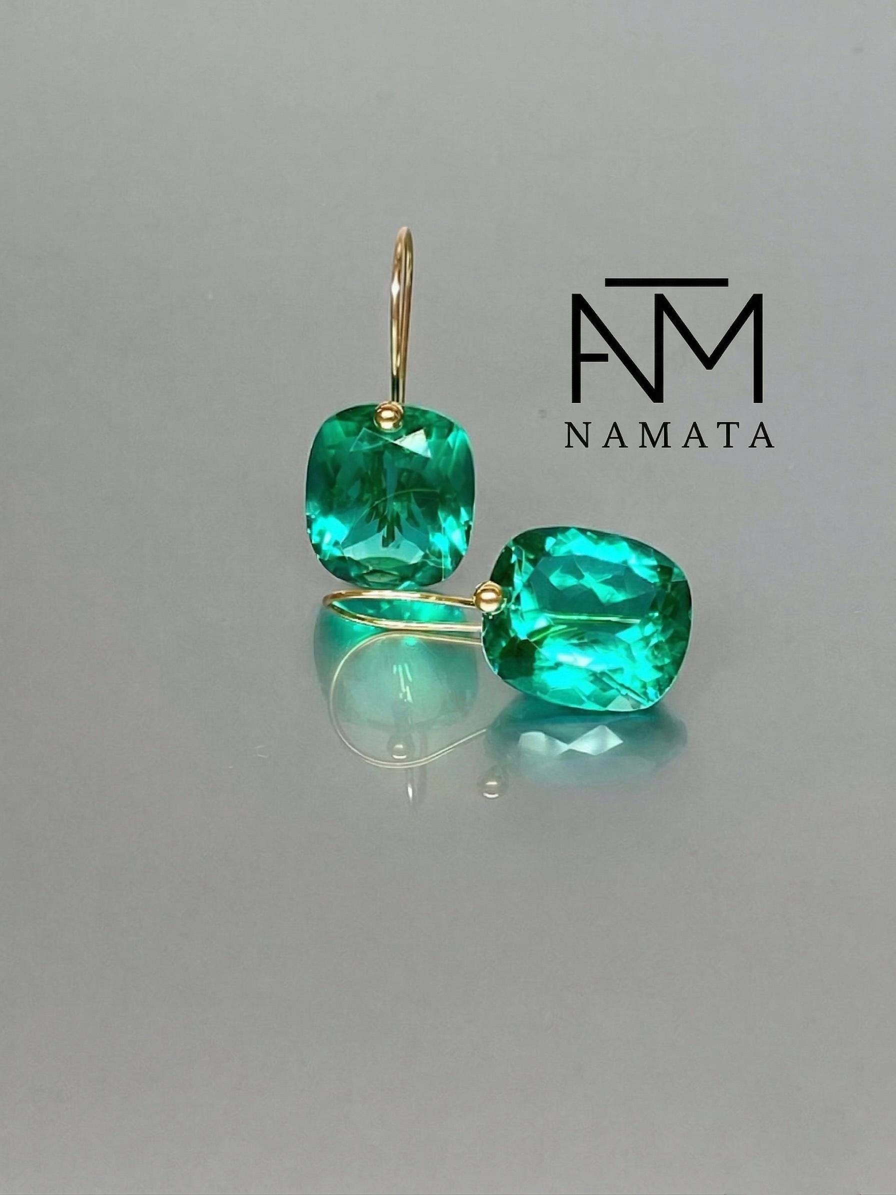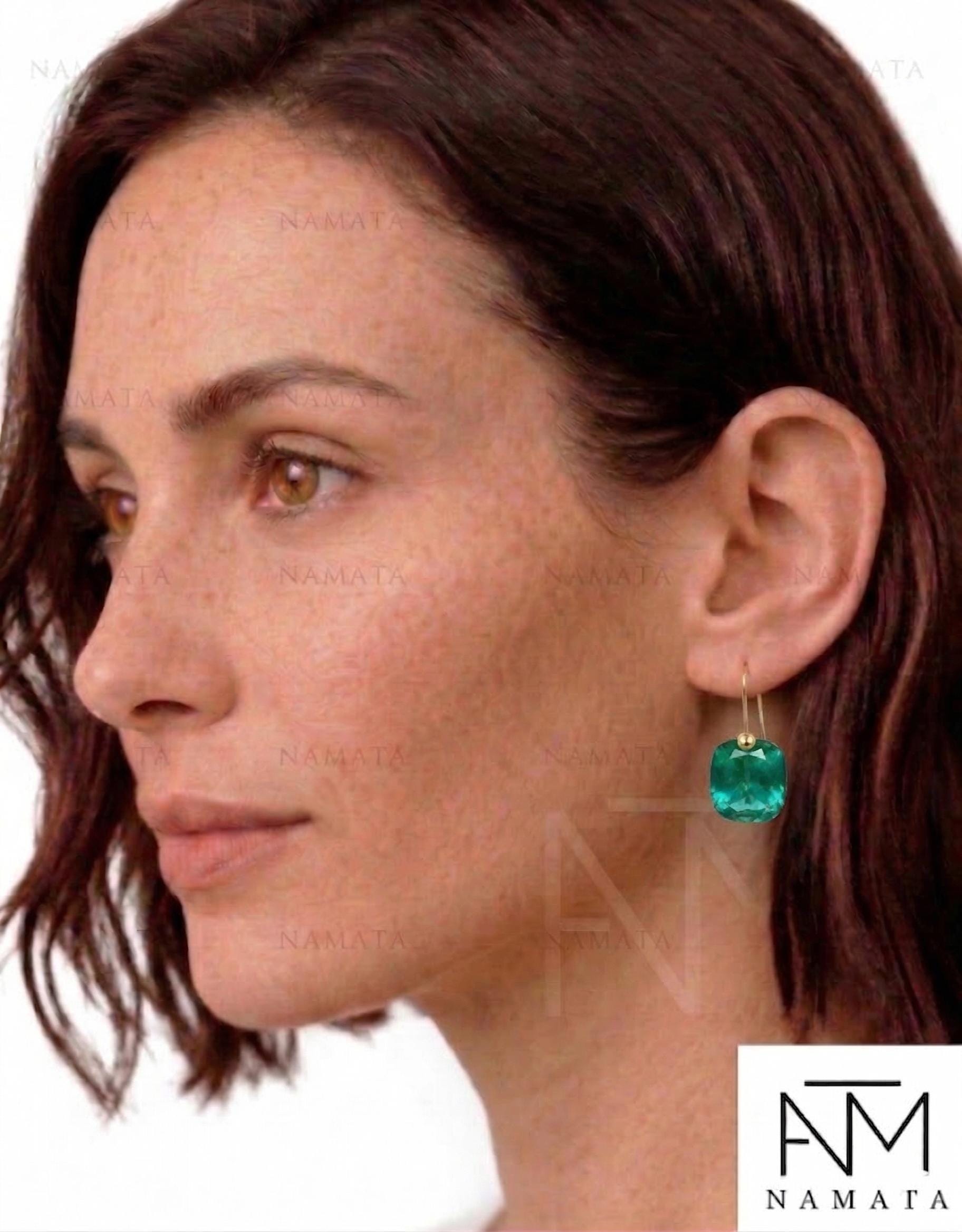 Beautiful Colombian emerald earrings in Brilliant drops. The faceted rectangle drops have a gorgeous Caribean ocean green color that brings lots of depth to the stone and reflects light beautifully. The fancy drops are expertly attached to ear wires made of either 24K Gold Vermeil or 14K SOLID GOLD, adding a touch of opulence to their elegance.