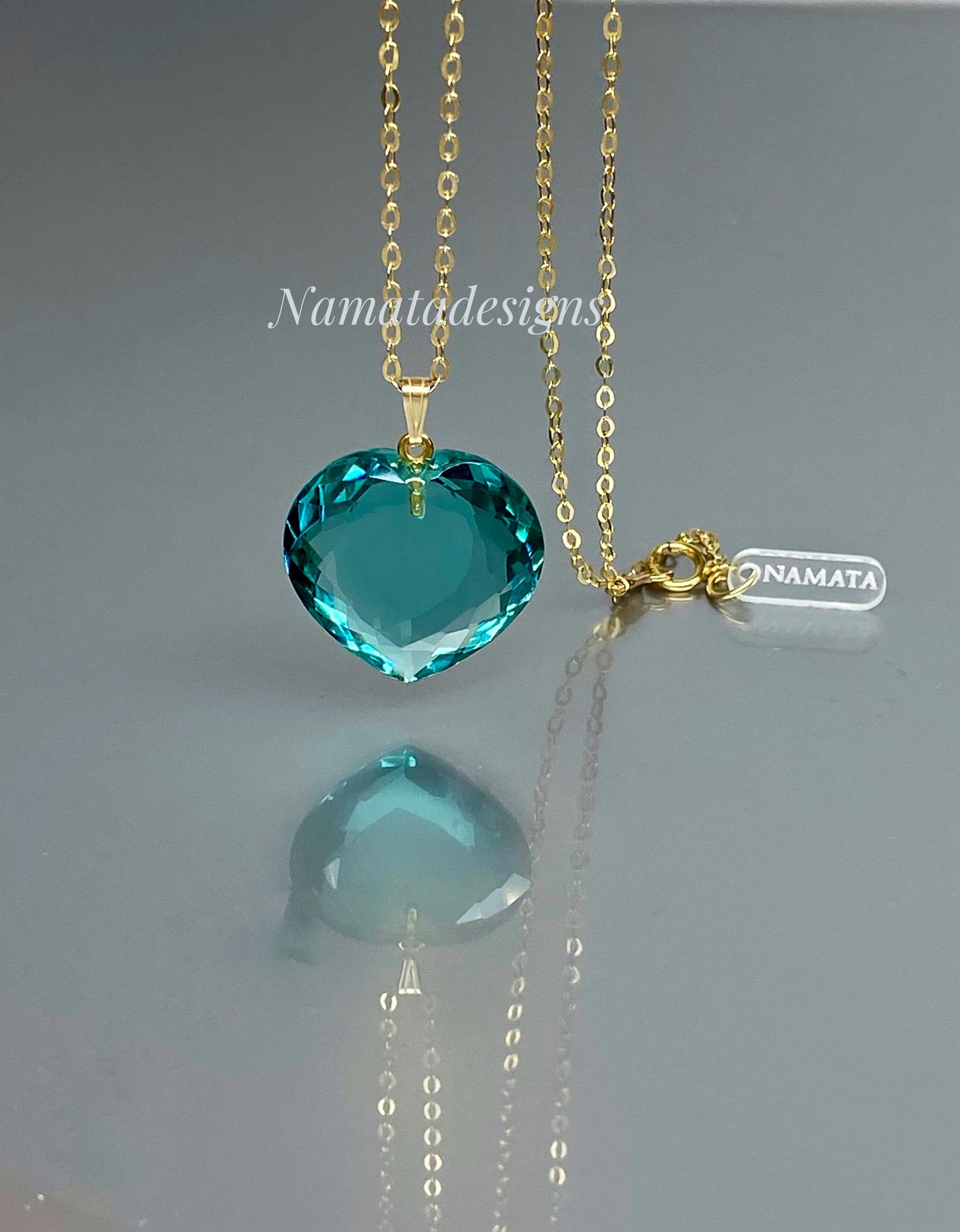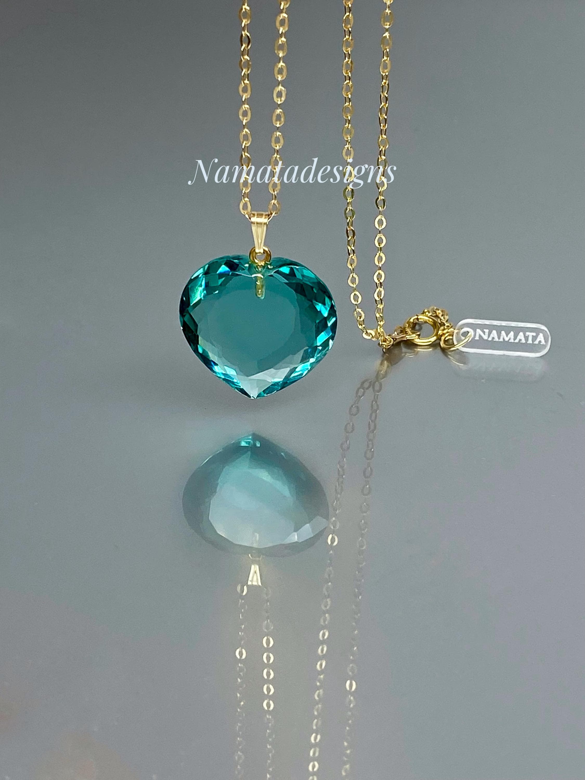 Stunning Paraiba Tourmaline heart pendant necklace, sparkling with brilliance. The flawlessly faceted heart-shaped pendant showcases an aqua-green-blue color, creating depth within the stone and reflecting light in a beautiful dance. This exquisite pendant is elegantly strung on 14K SOLID GOLD, offering versatility for layering or making a captivating statement when worn alone.