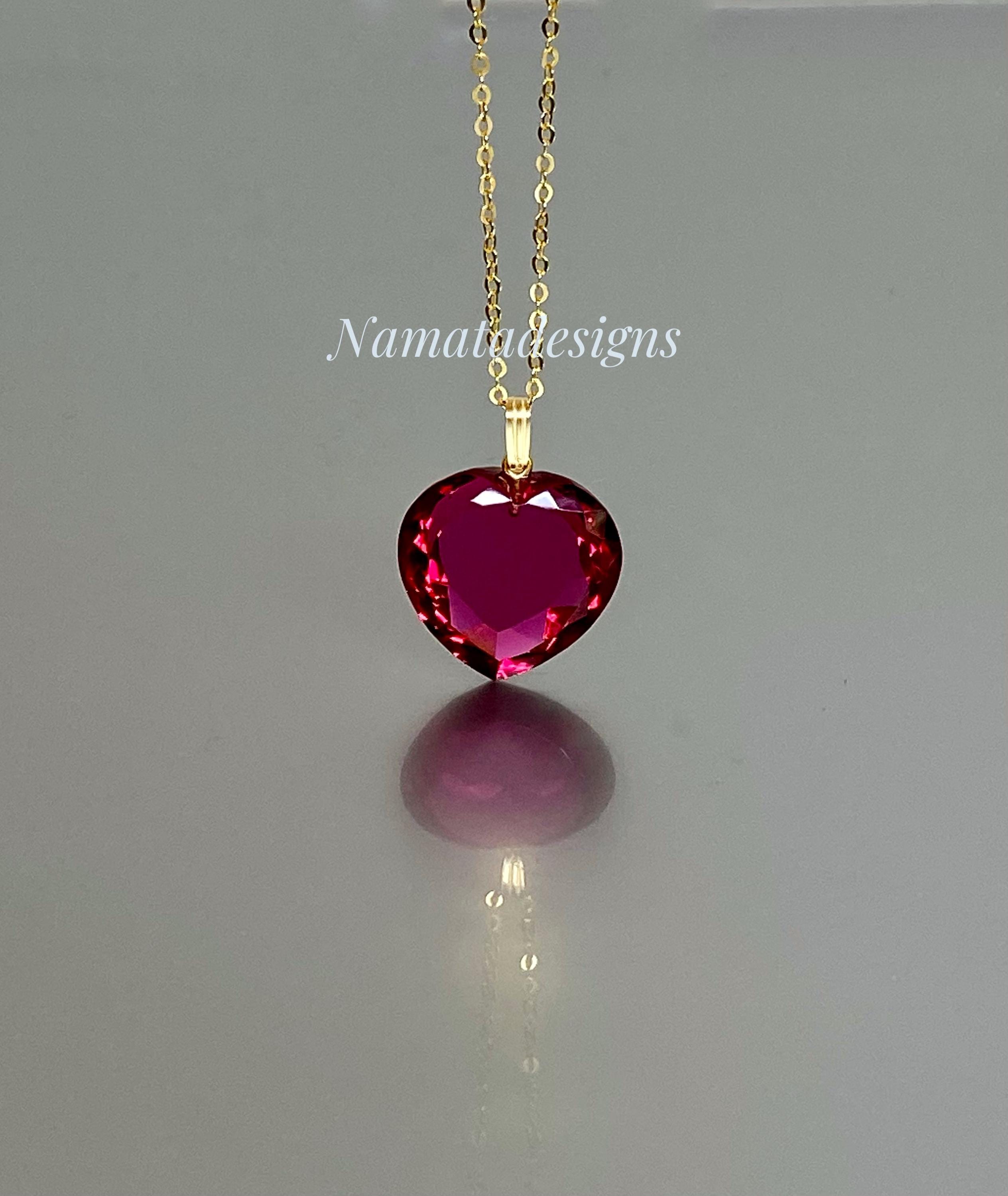 Gorgeous sparkly rubellite tourmaline pendant necklace. The Faceted heart-shaped pendant is flawless and has the most vivid pink-red color that brings lots of depth to the stone and reflects light beautifully. The pendant is strung on a 14K SOLID GOLD chain. It is perfect for layering or looks great when worn alone.