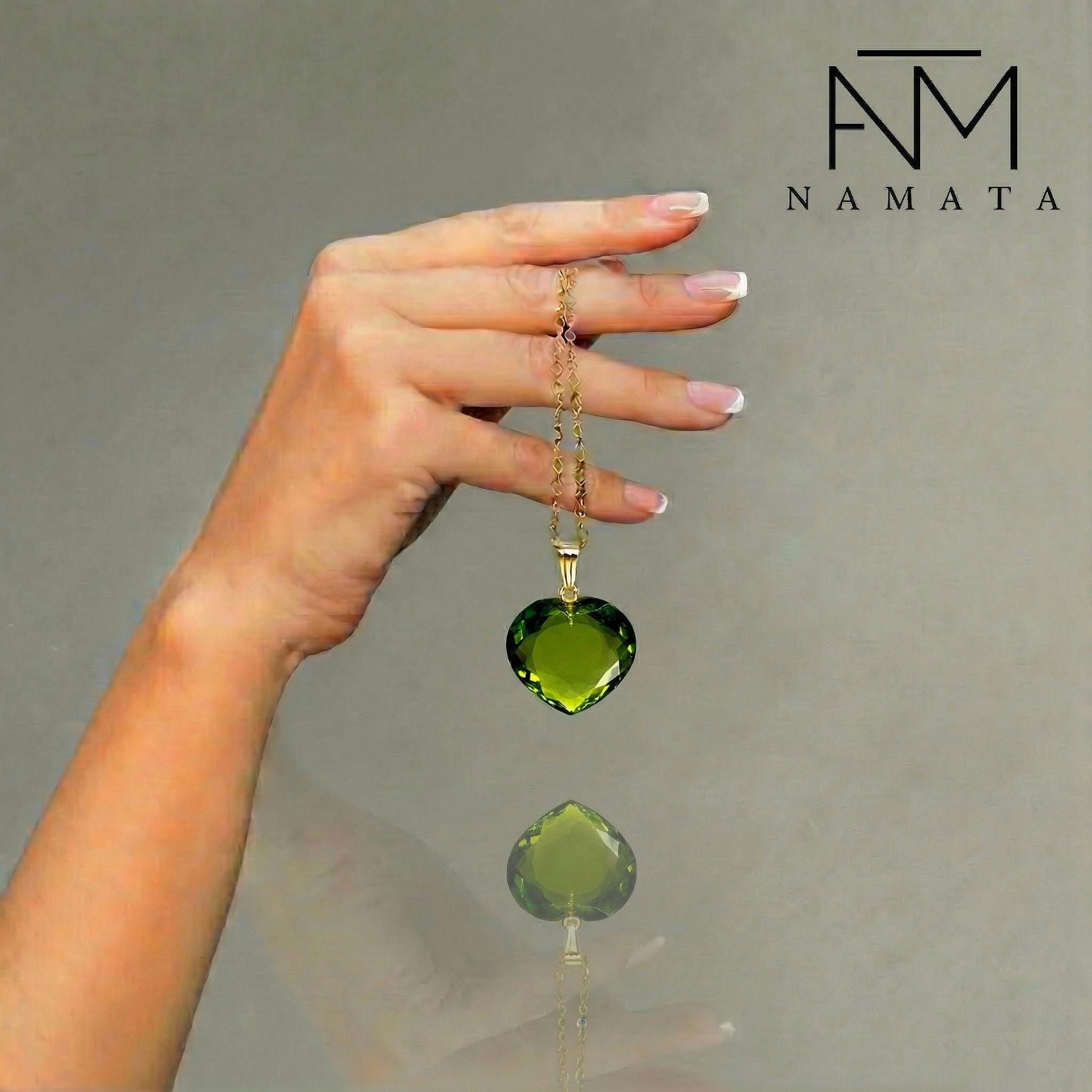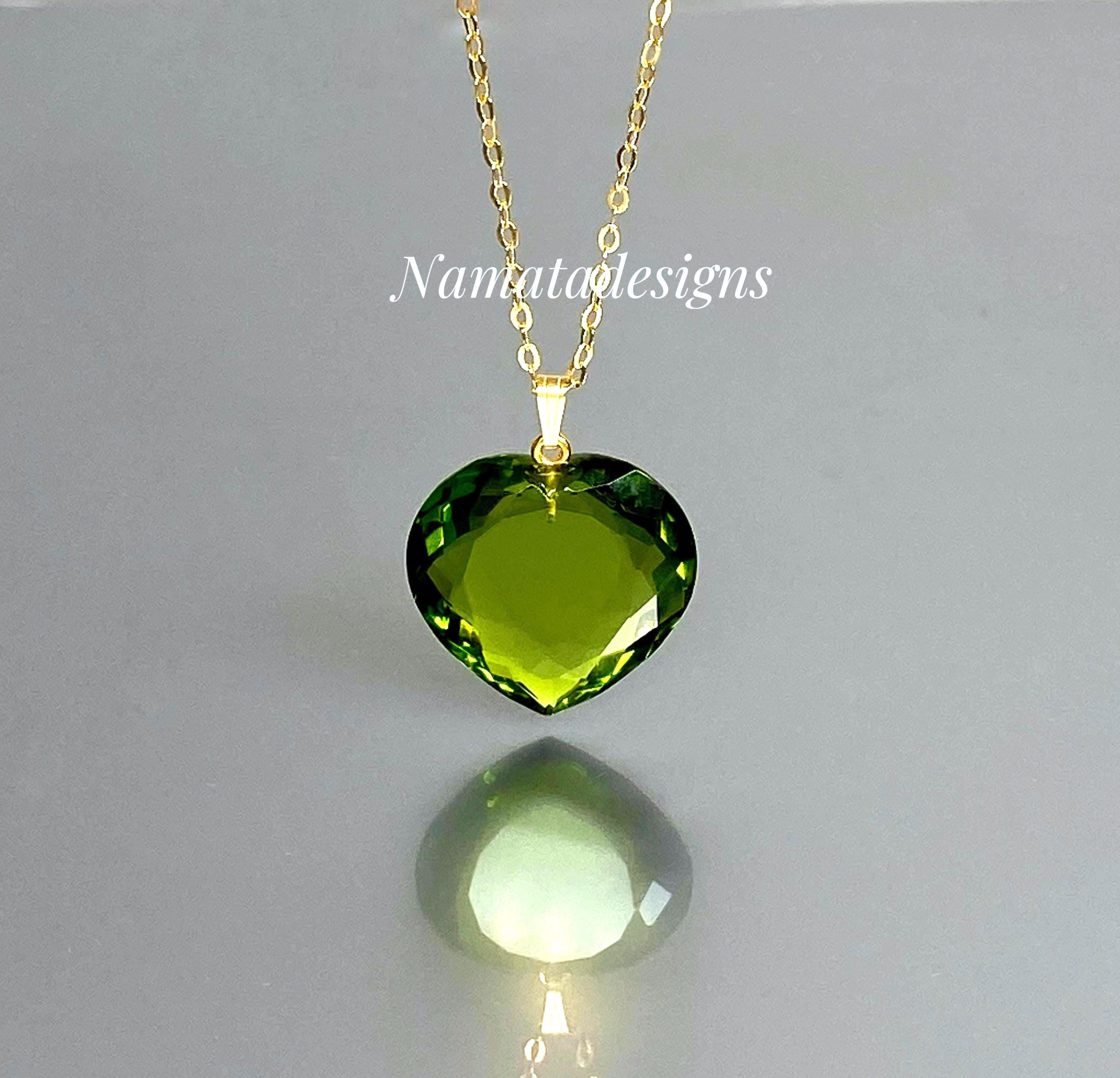 Stunning peridot large heart pendant necklace, radiating with sparkle. The flawlessly faceted heart-shaped pendant boasts a vivid green color that adds depth to the stone and beautifully reflects light. Suspended gracefully on a 14K SOLID GOLD chain, this necklace is perfect for layering or makes a striking statement when worn alone.