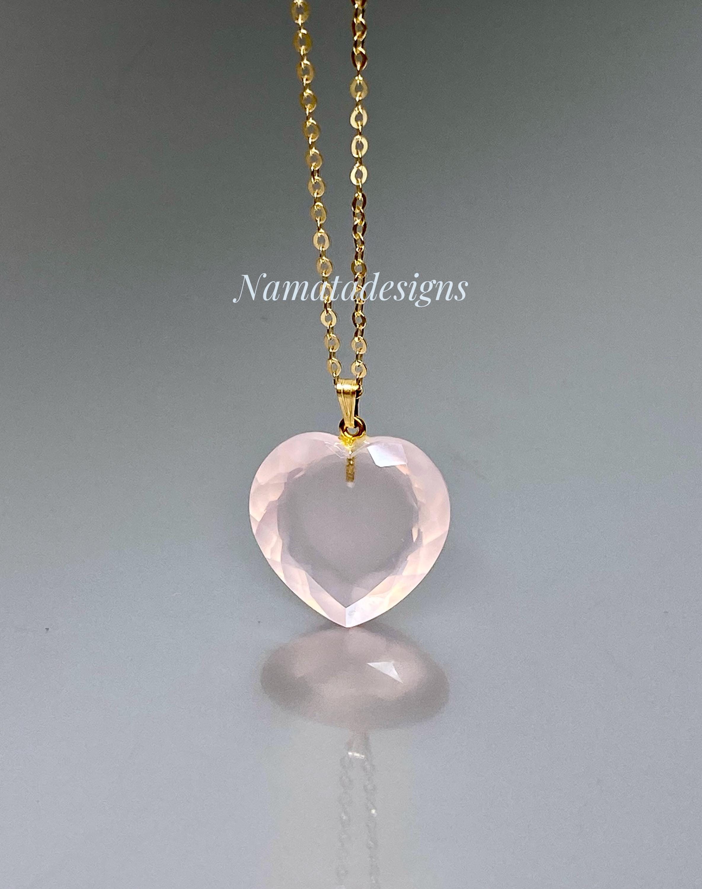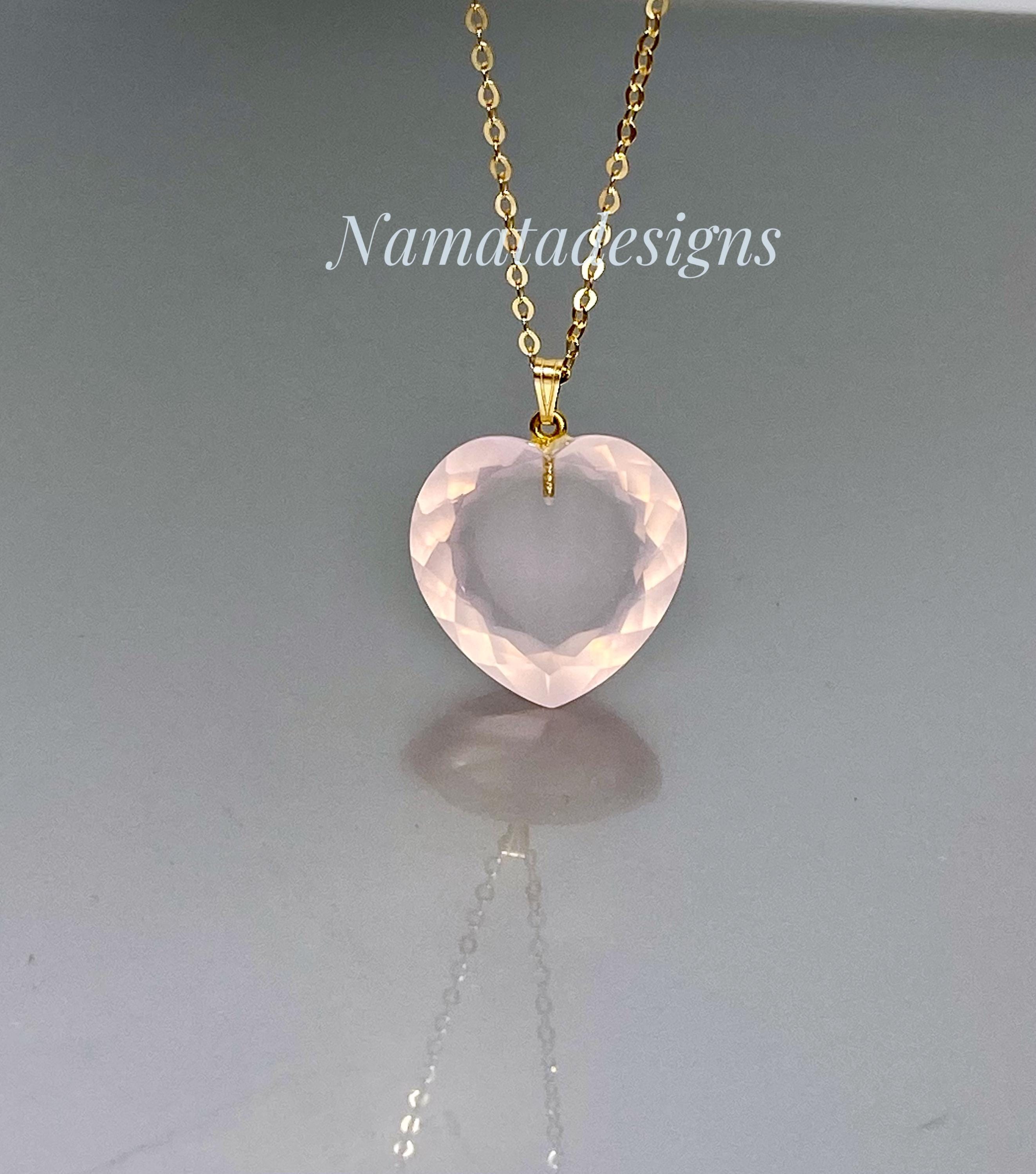 Gorgeous sparkly faceted natural rose quartz heart earrings. The faceted heart-shaped pendant has a beautiful pale pink color, is eye-clean, and reflects light beautifully. The pendant is strung on a 14K gold-filled/ Sterling Silver chain. It is perfect for layering or looks great when worn alone.