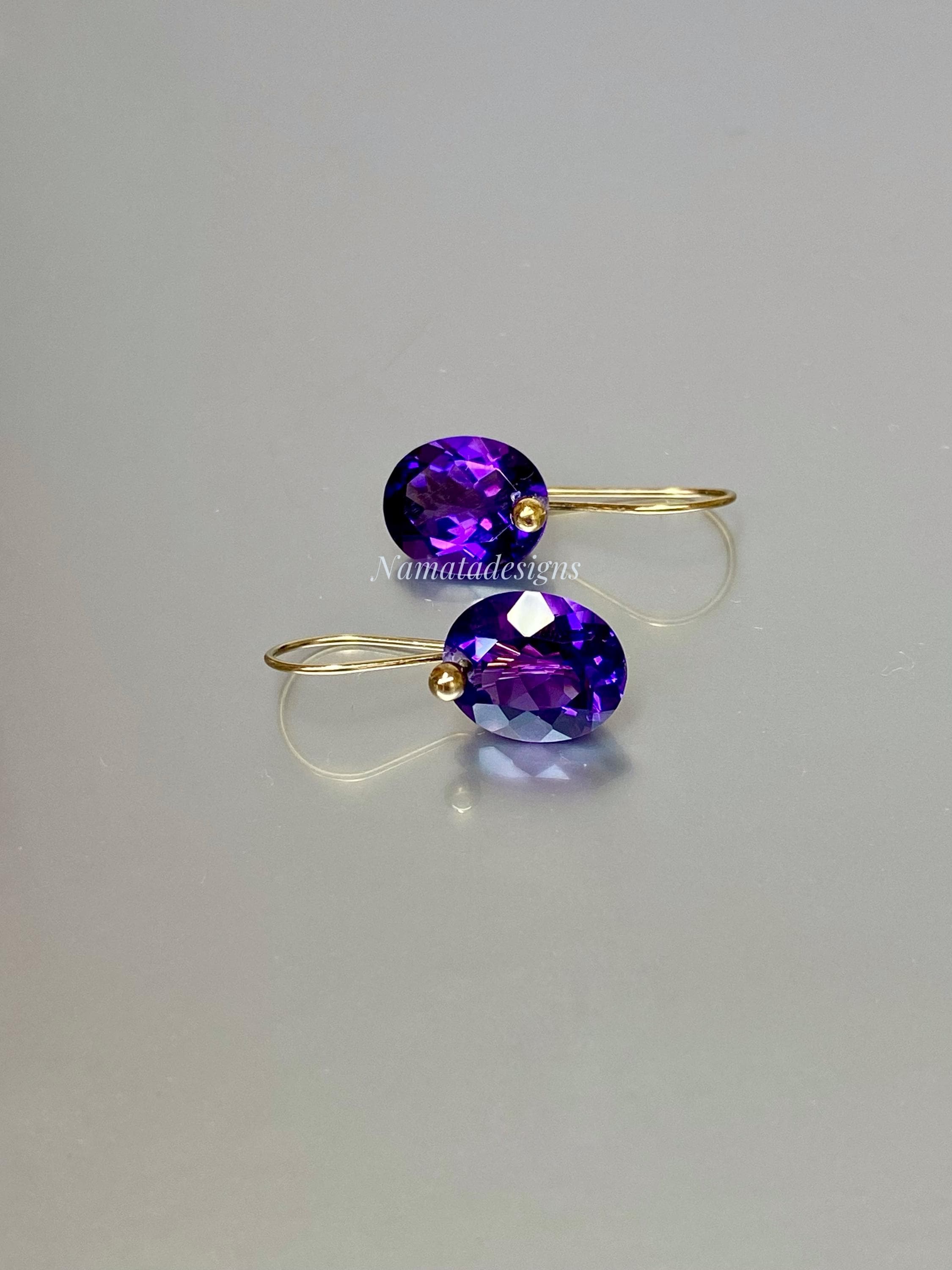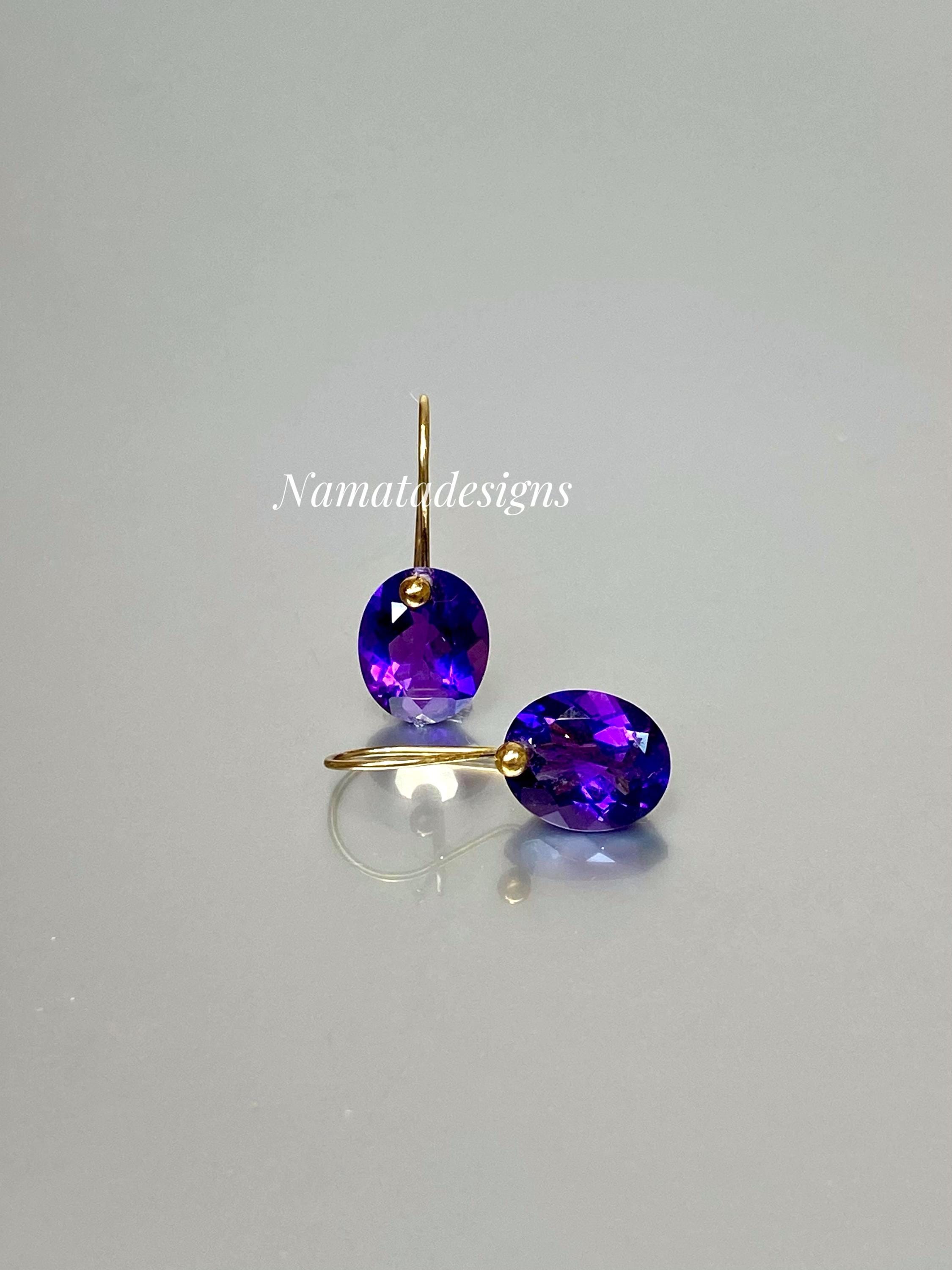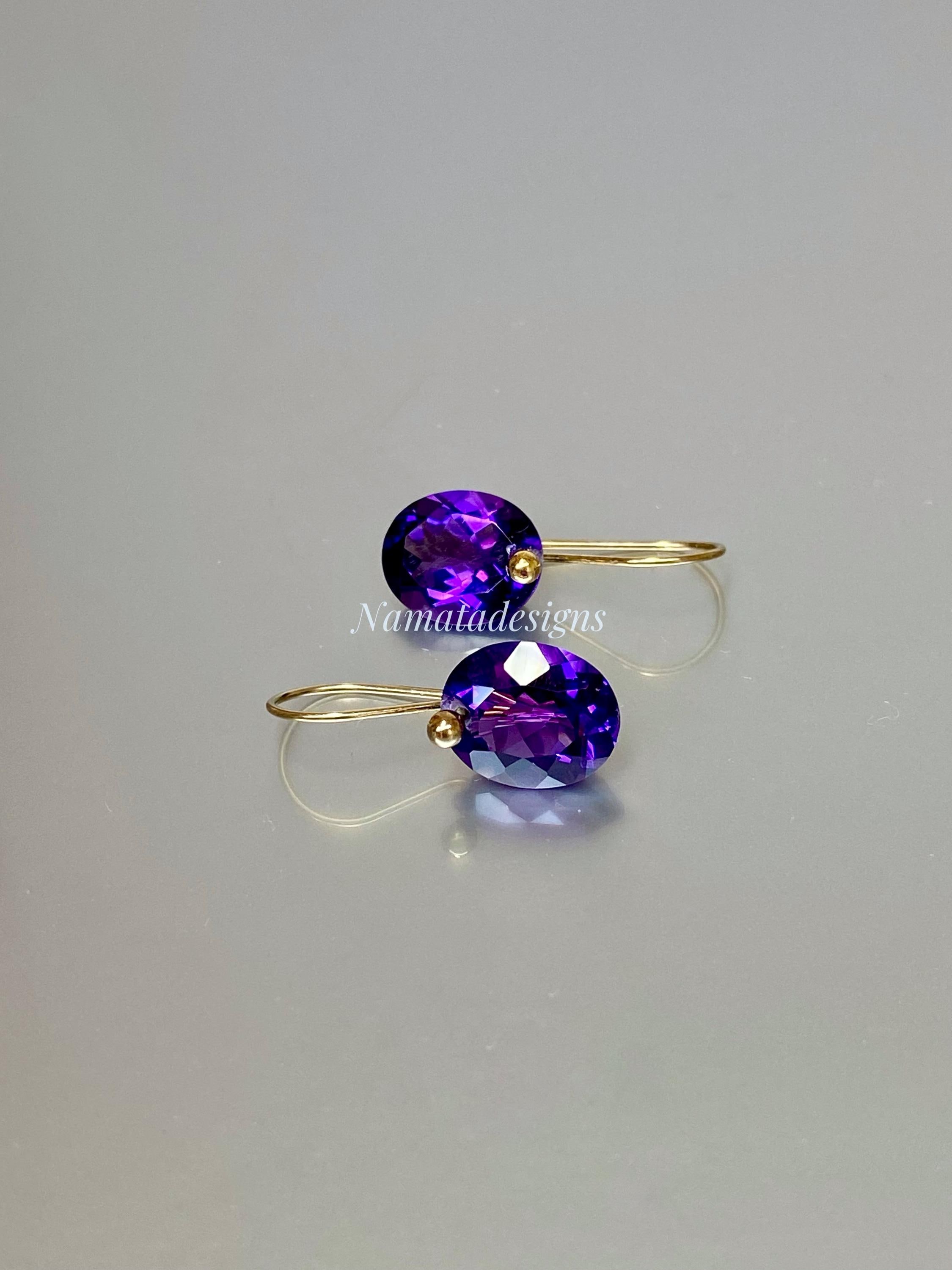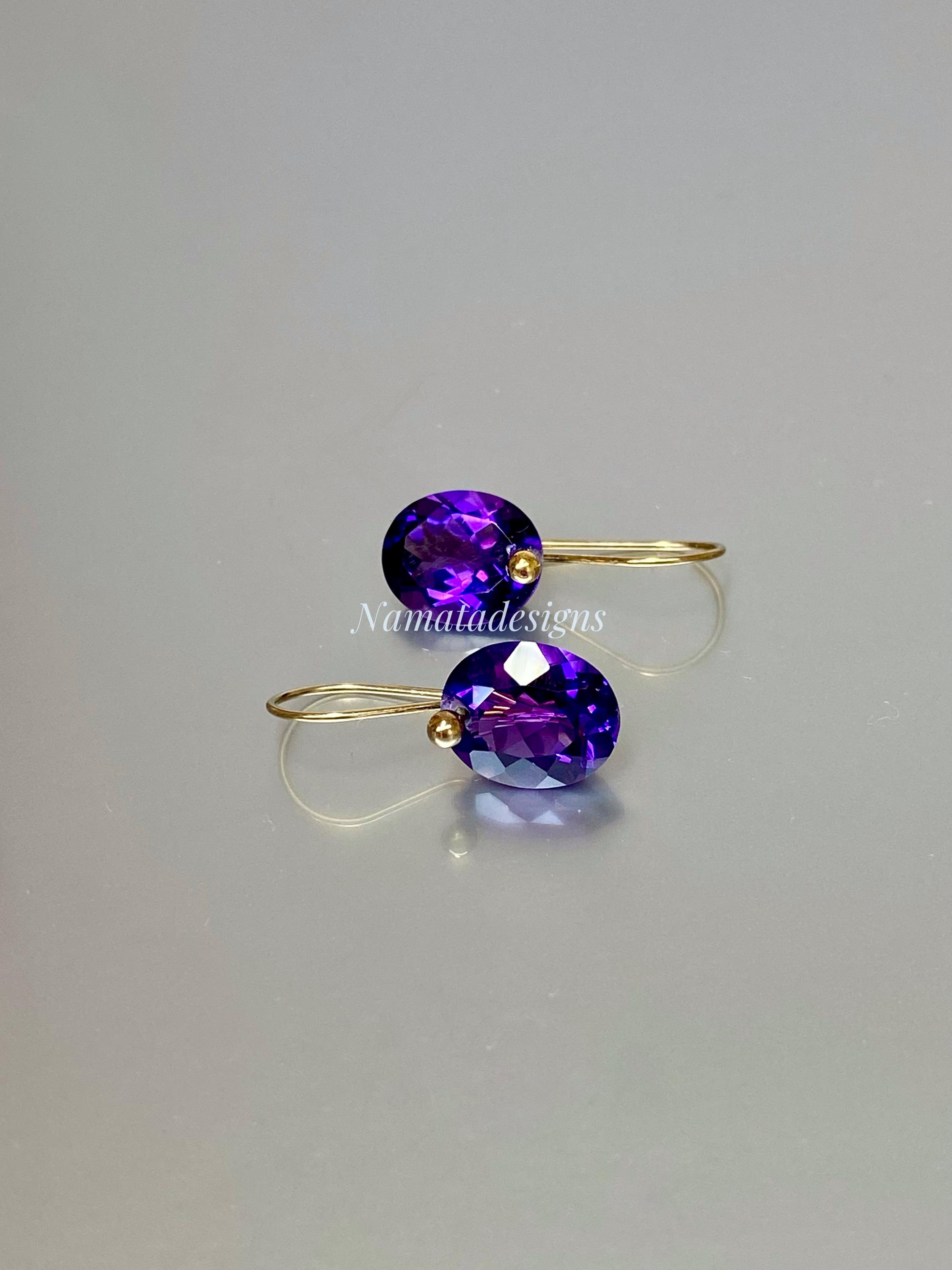 Gorgeous Purple Amethyst oval earrings. The faceted oval drops are flawless and eye-clean and have a beautiful vivid clear deep purple, bringing depth to the stone and reflecting light beautifully. The fancy drops are expertly attached to ear wires of either Sterling Silver, 24K Gold Vermeil, or 14K/18K SOLID GOLD, adding a touch of opulence to their elegance. They are lightweight and perfect for everyday wear.