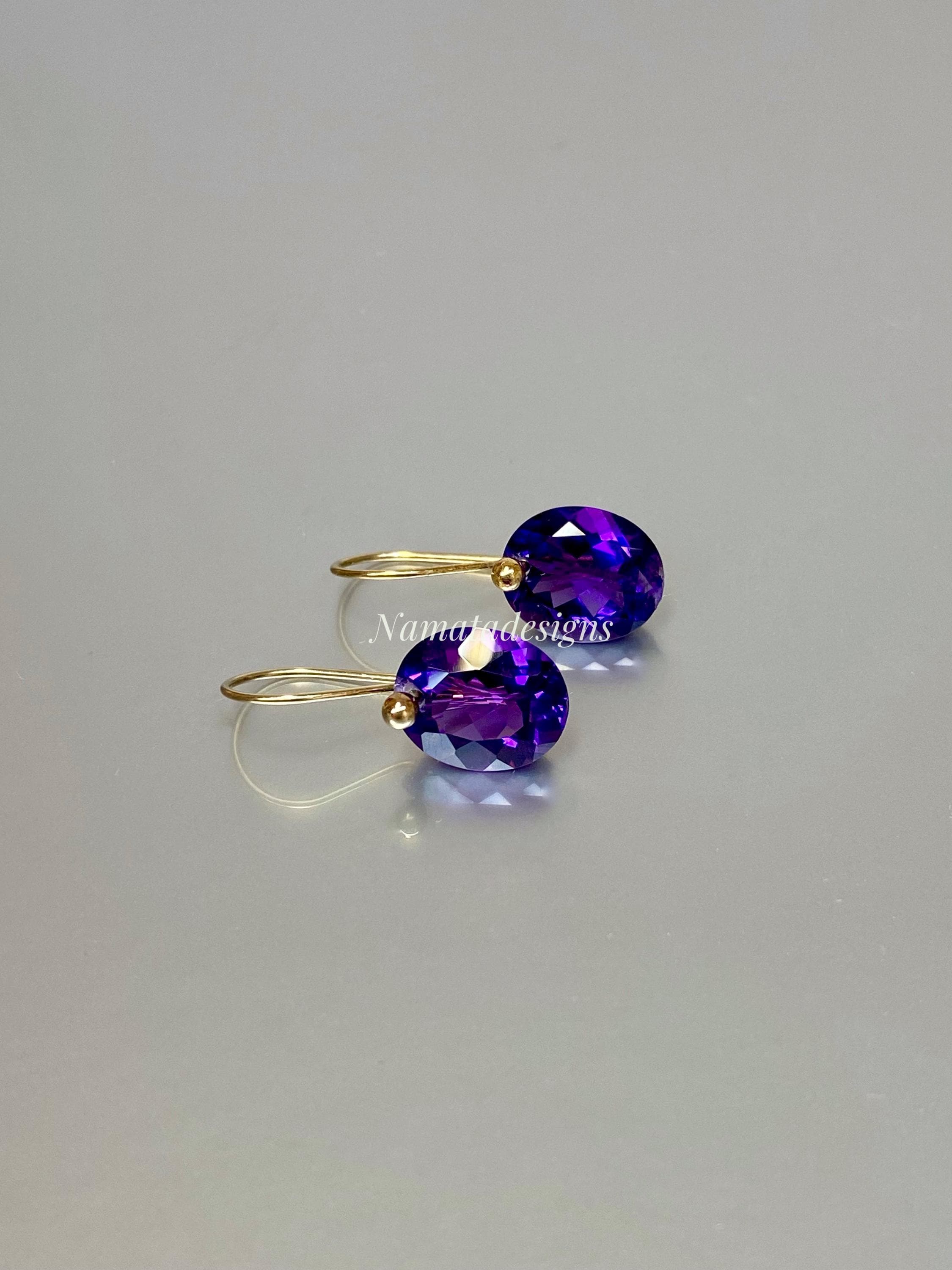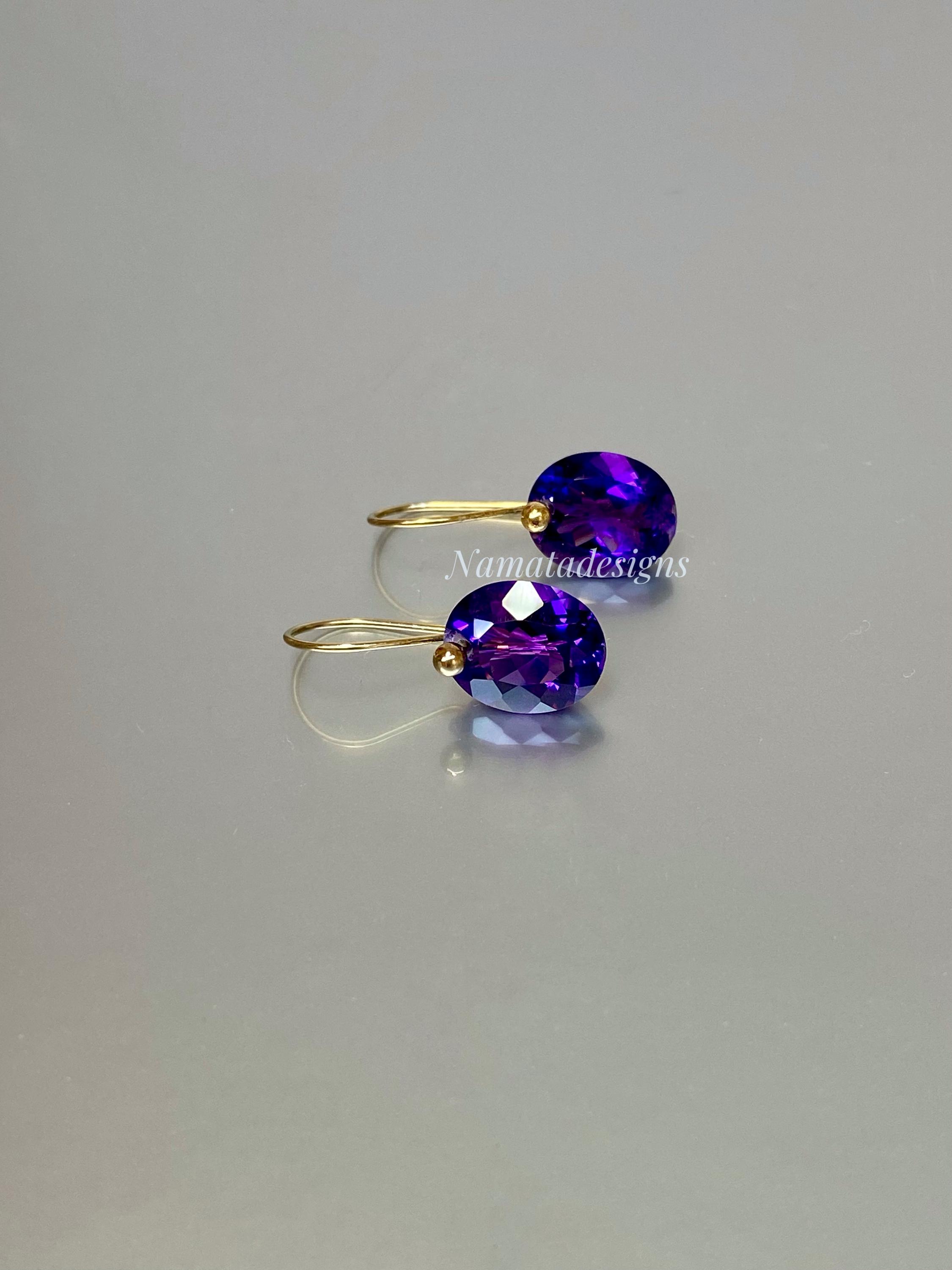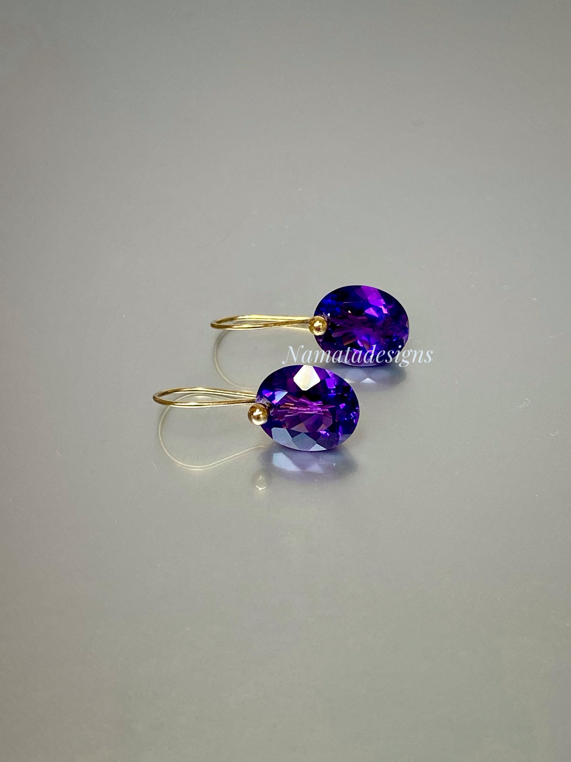 Gorgeous Purple Amethyst oval earrings. The faceted oval drops are flawless and eye-clean and have a beautiful vivid clear deep purple, bringing depth to the stone and reflecting light beautifully. The fancy drops are expertly attached to ear wires of either Sterling Silver, 24K Gold Vermeil, or 14K/18K SOLID GOLD, adding a touch of opulence to their elegance. They are lightweight and perfect for everyday wear.
