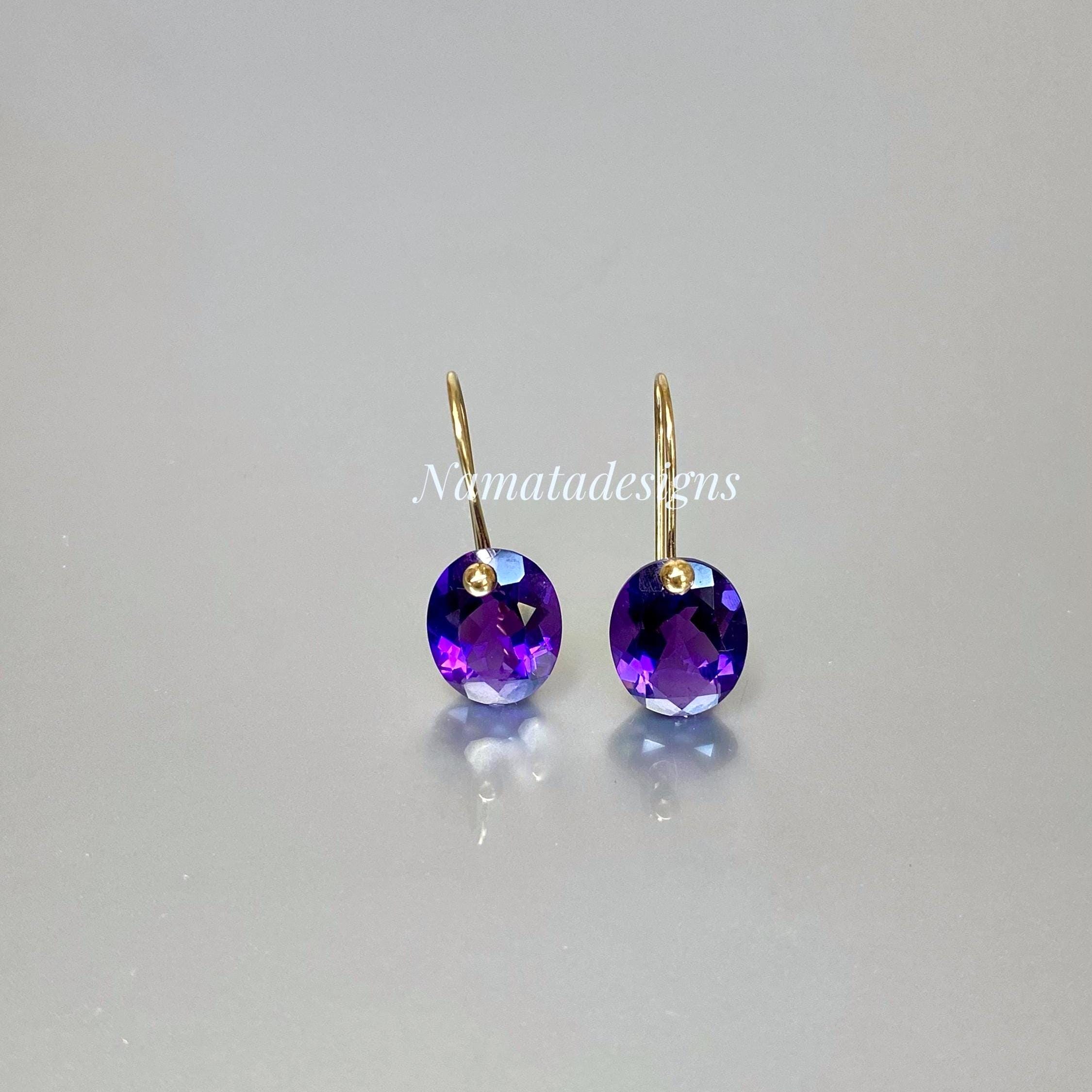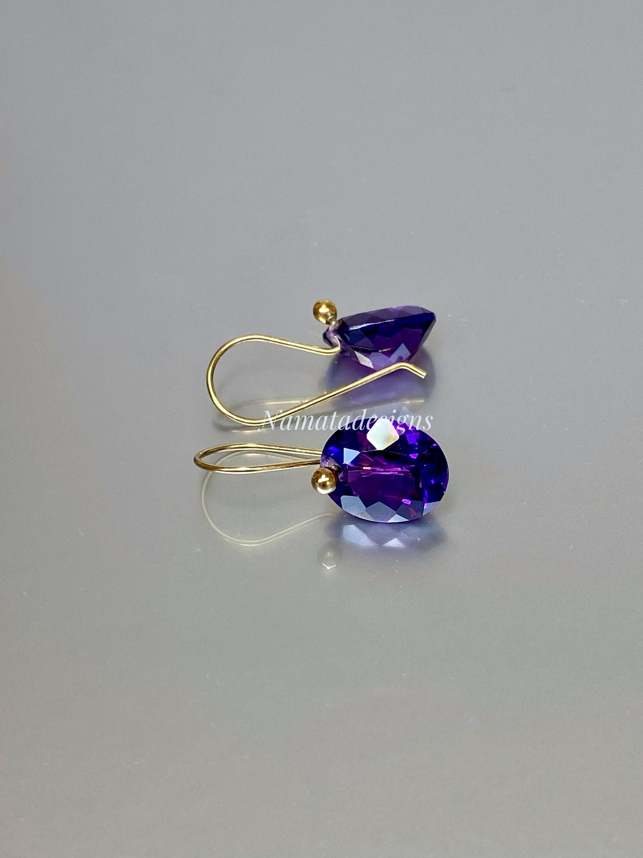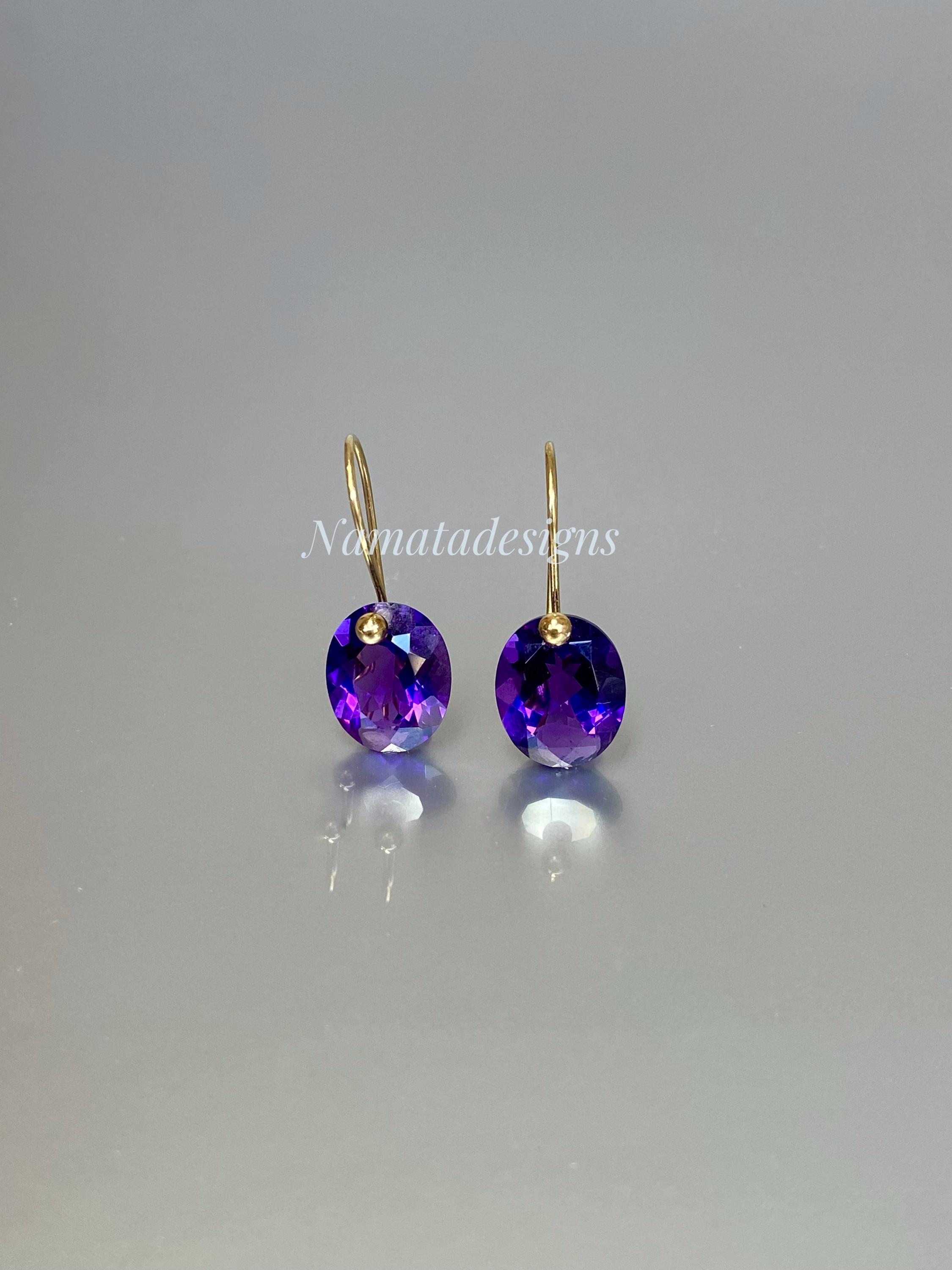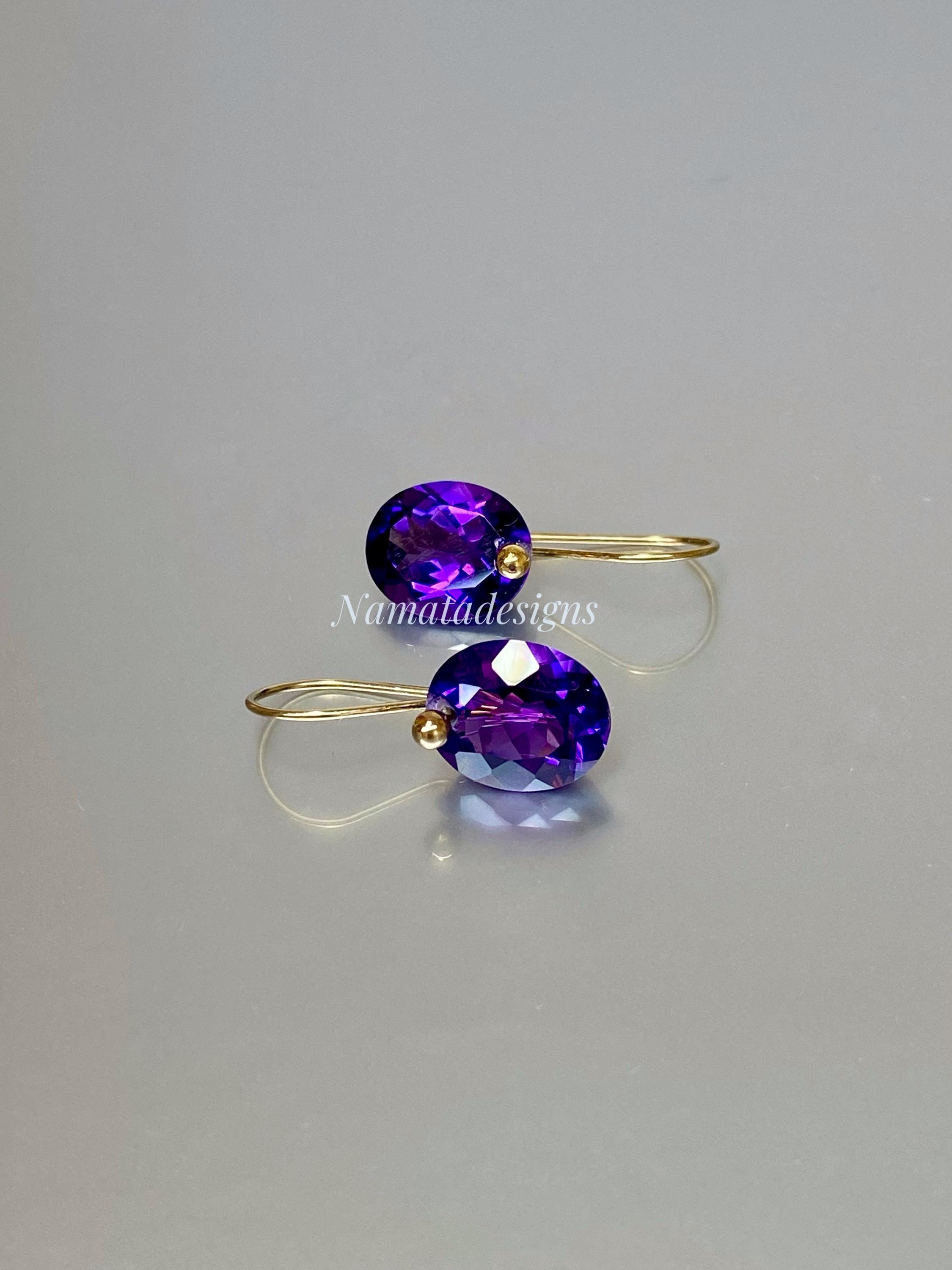 Gorgeous Purple Amethyst oval earrings. The faceted oval drops are flawless and eye-clean and have a beautiful vivid clear deep purple, bringing depth to the stone and reflecting light beautifully. The fancy drops are expertly attached to ear wires of either Sterling Silver, 24K Gold Vermeil, or 14K/18K SOLID GOLD, adding a touch of opulence to their elegance. They are lightweight and perfect for everyday wear.