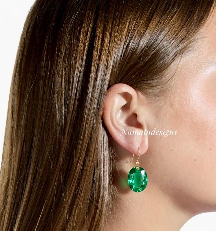 Colombian emerald drop earrings. The faceted oval drops have a gorgeous Caribean ocean green color, bringing depth to the stone and reflecting light beautifully. The fancy drops are expertly attached to ear wires of either Sterling Silver, 24K Gold Vermeil, or 14K/18K SOLID GOLD, adding a touch of opulence to their elegance.