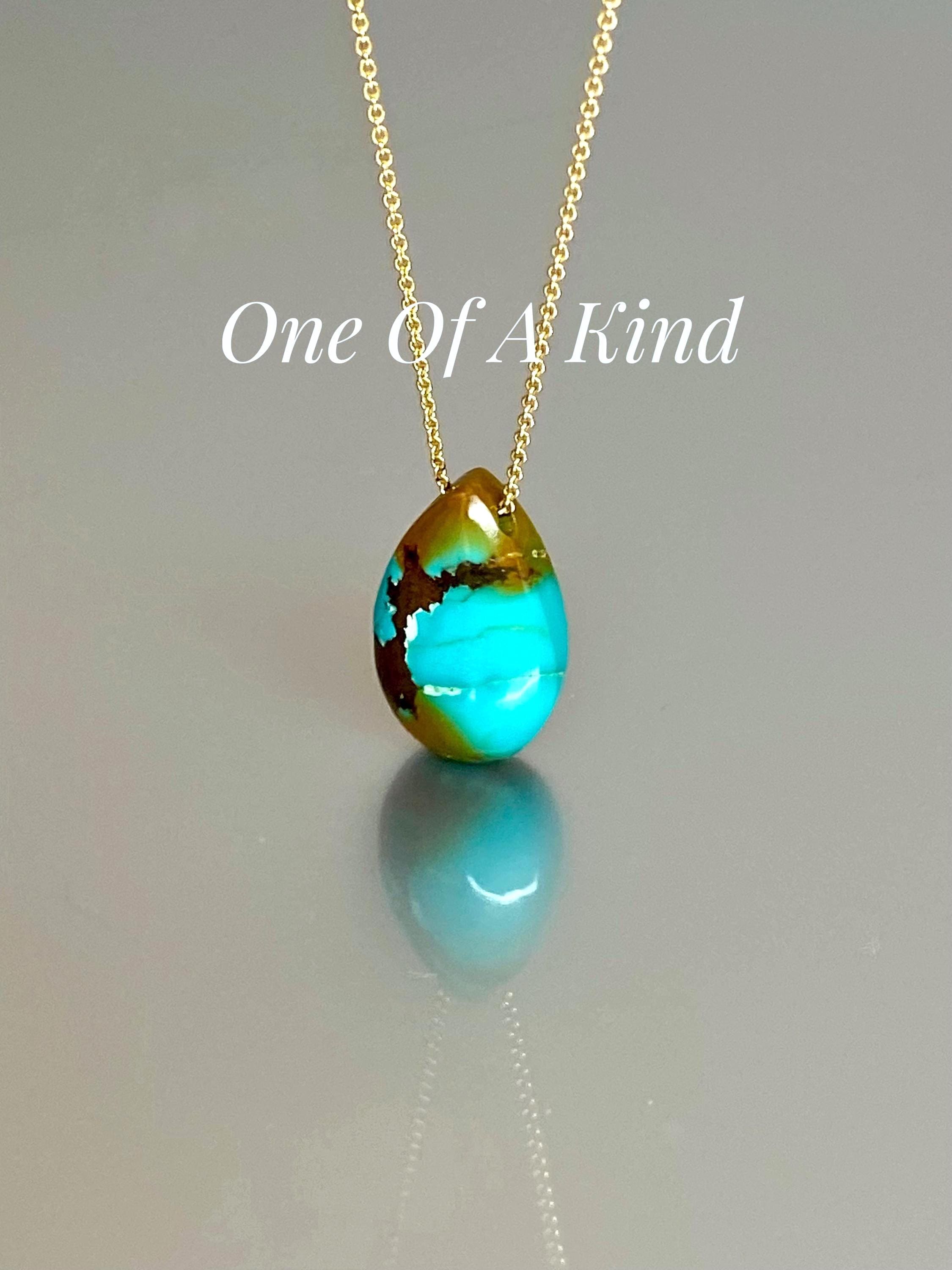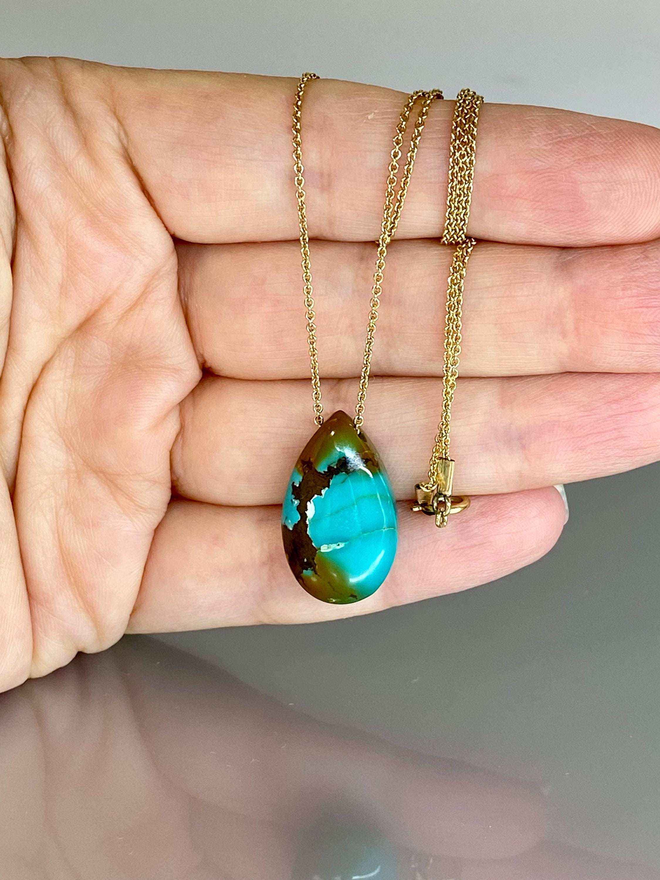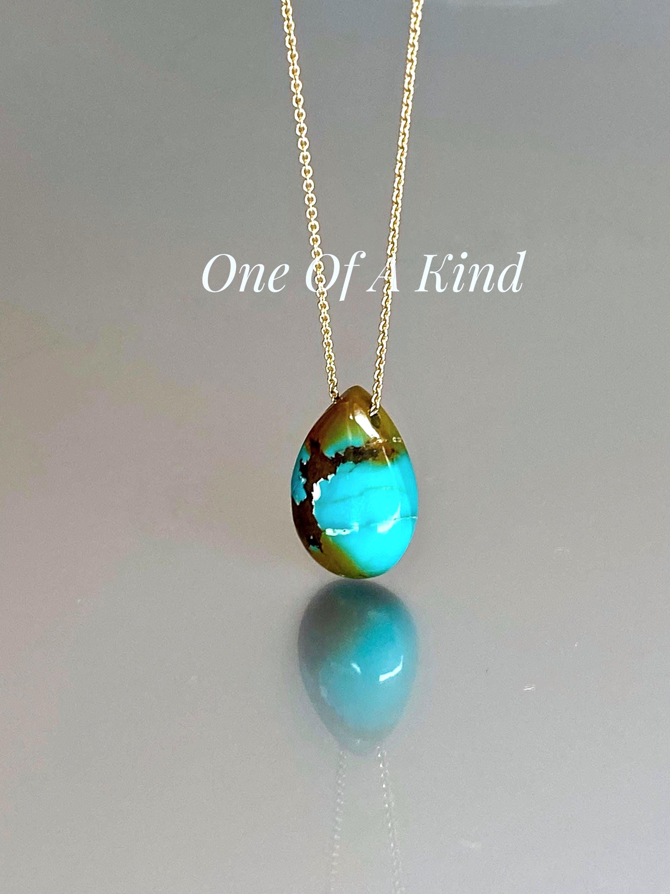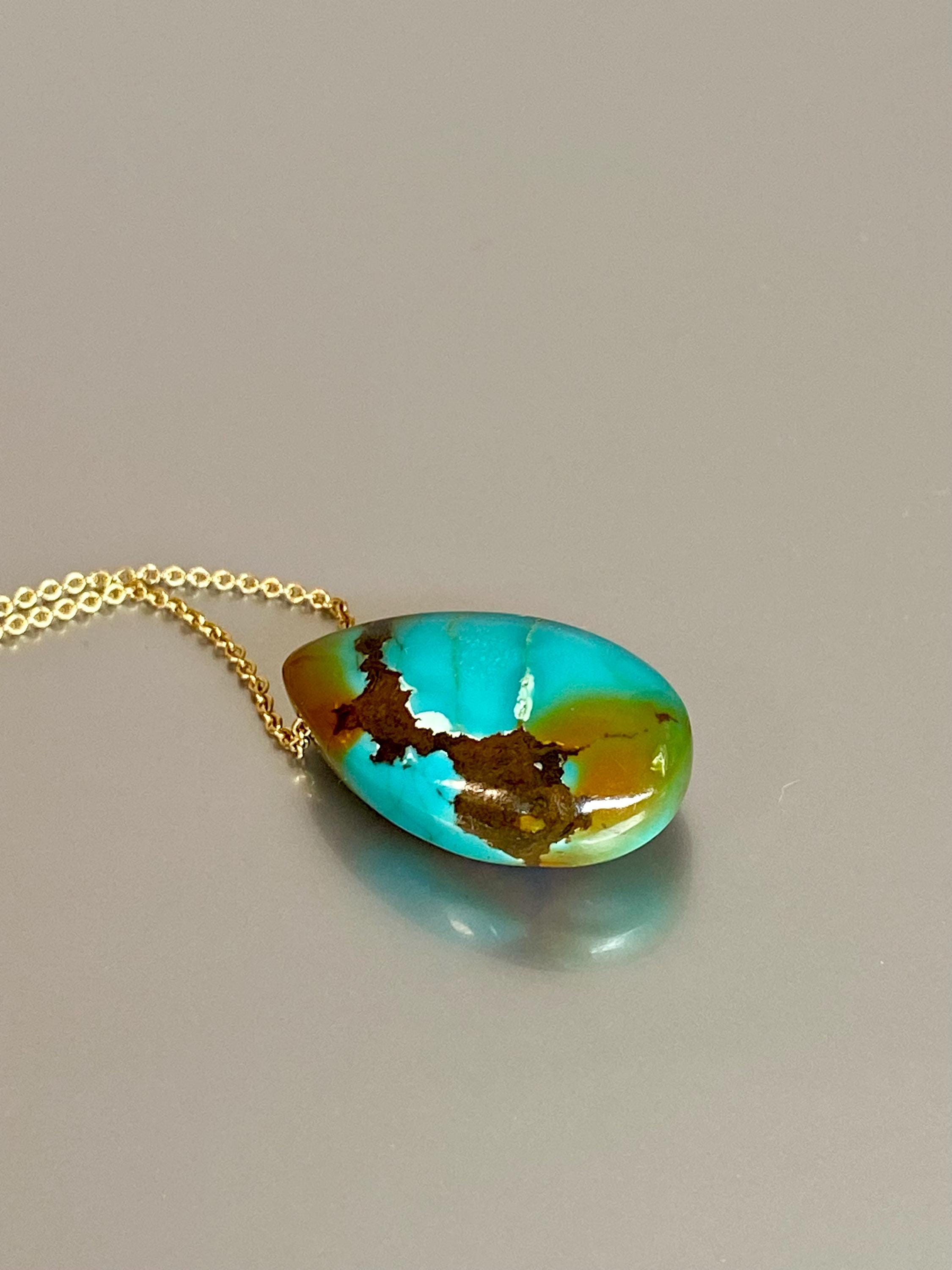 Gorgeous natural turquoise pendant necklace with the most STUNNING vibrant colors of blue, turquoise, and rusty brown that resemble the colors of the Caribbean Sea. The turquoise pendant is unique and lightweight. The pendant is strung on a 14K gold-filled chain. It is perfect for layering or looks great when worn alone.