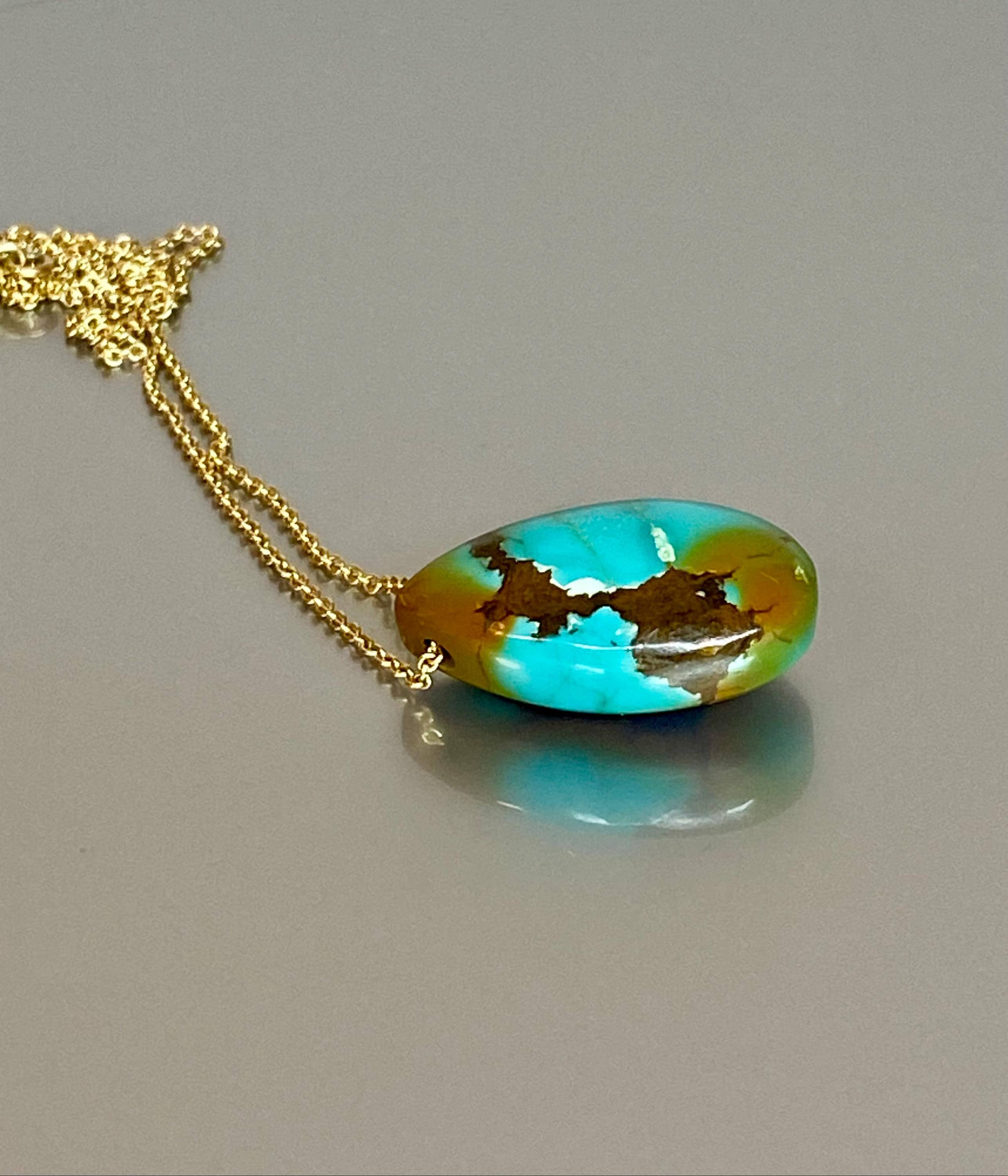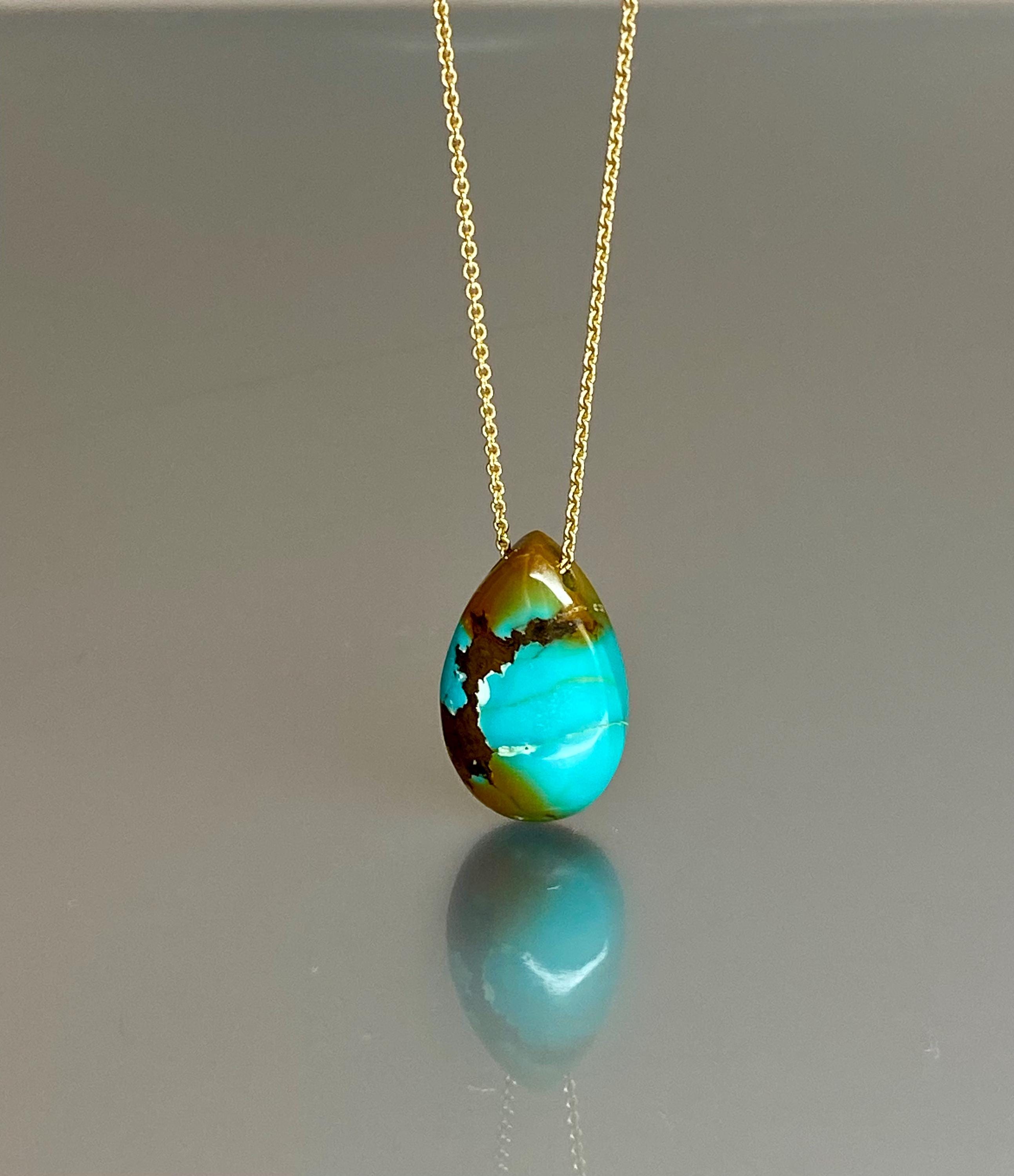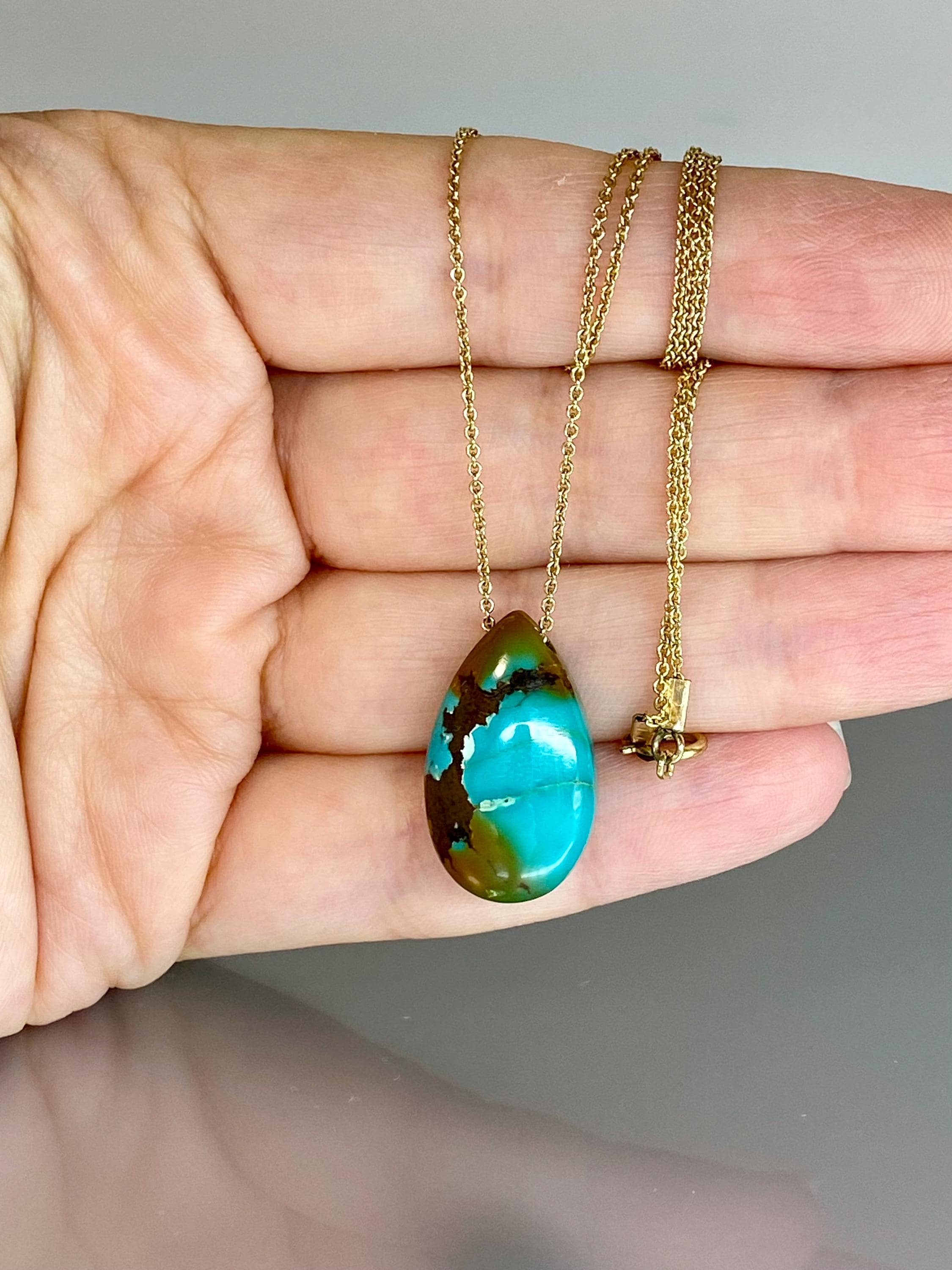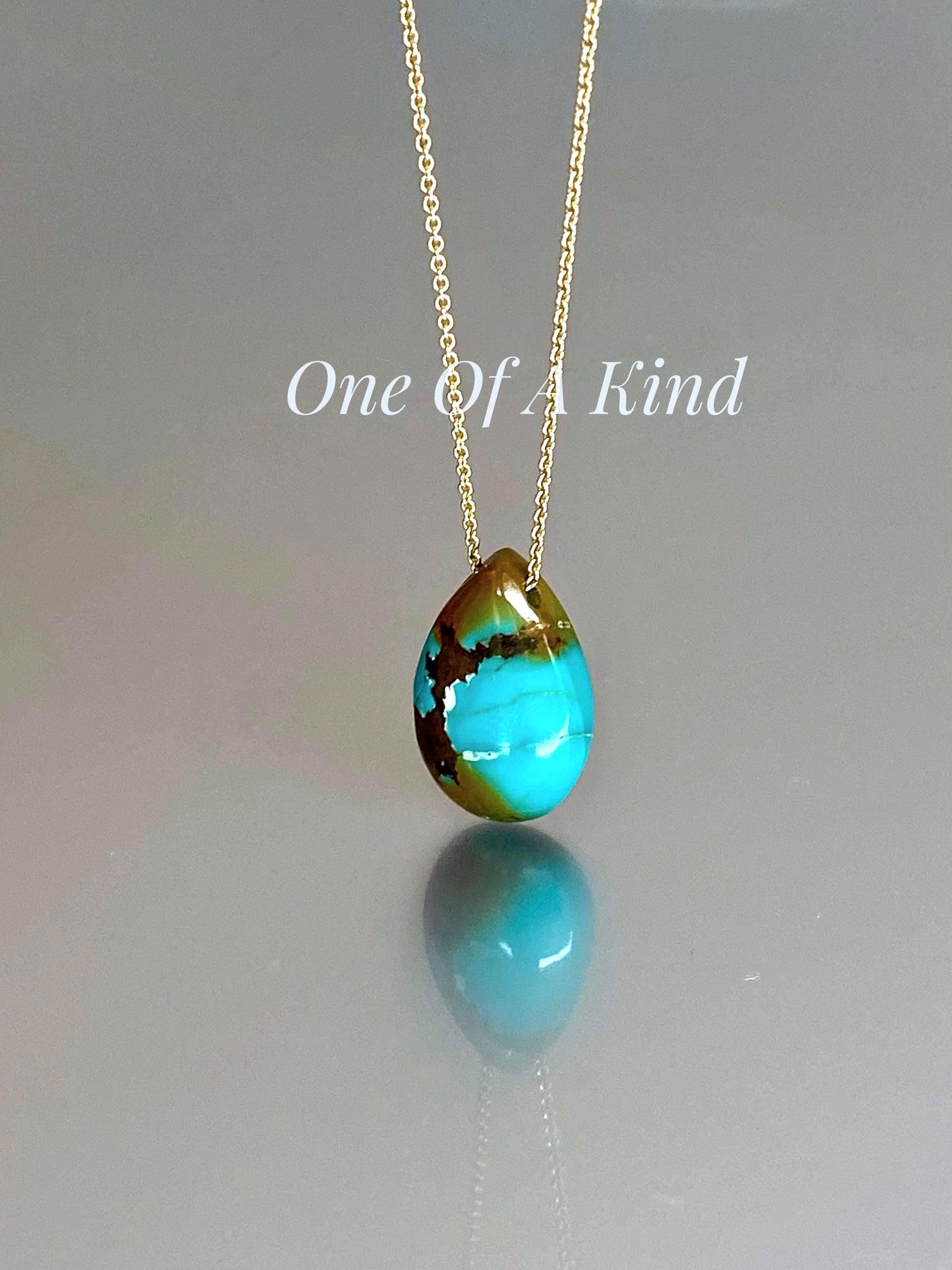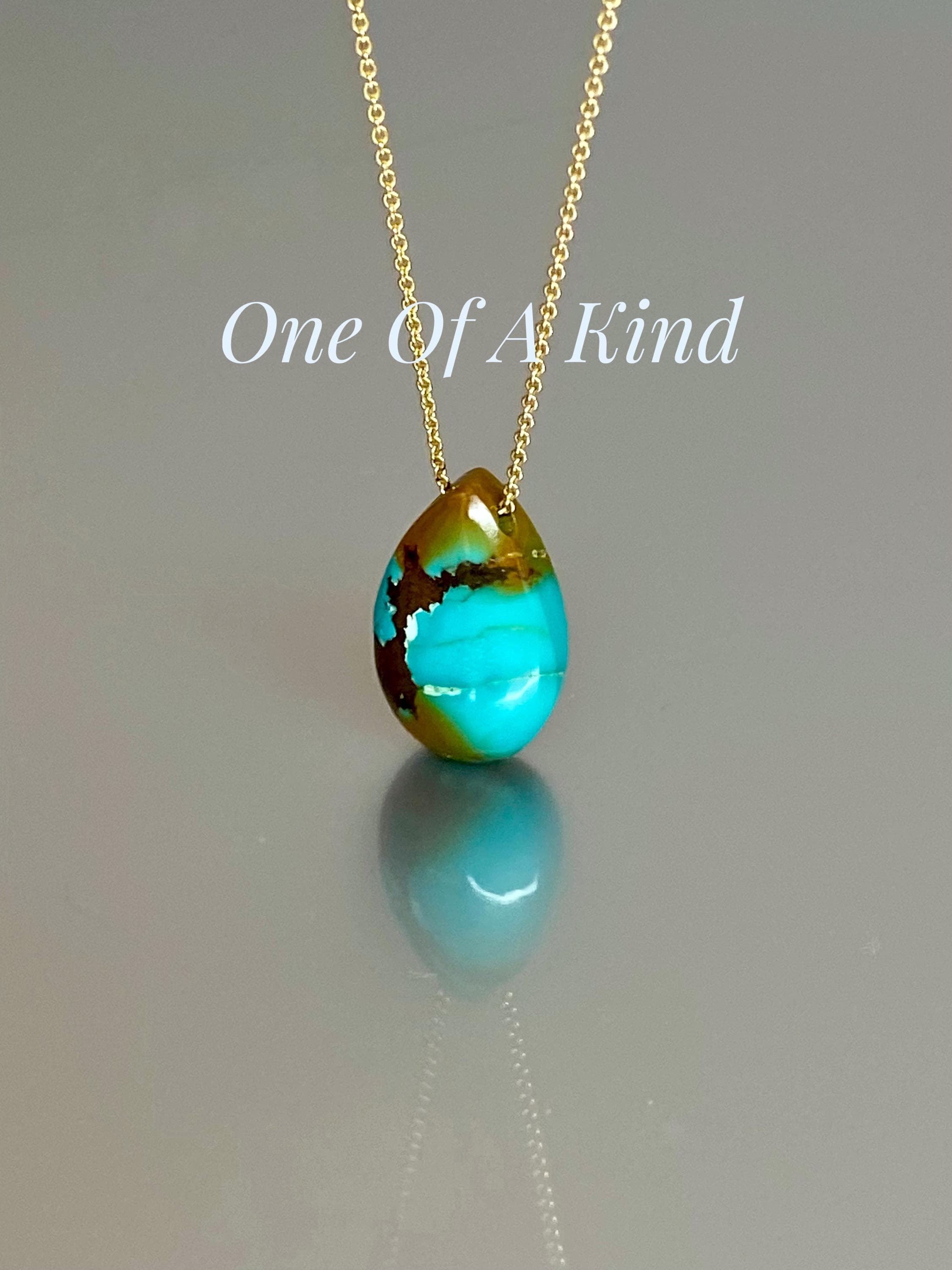 Gorgeous natural turquoise pendant necklace with the most STUNNING vibrant colors of blue, turquoise, and rusty brown that resemble the colors of the Caribbean Sea. The turquoise pendant is unique and lightweight. The pendant is strung on a 14K gold-filled chain. It is perfect for layering or looks great when worn alone.