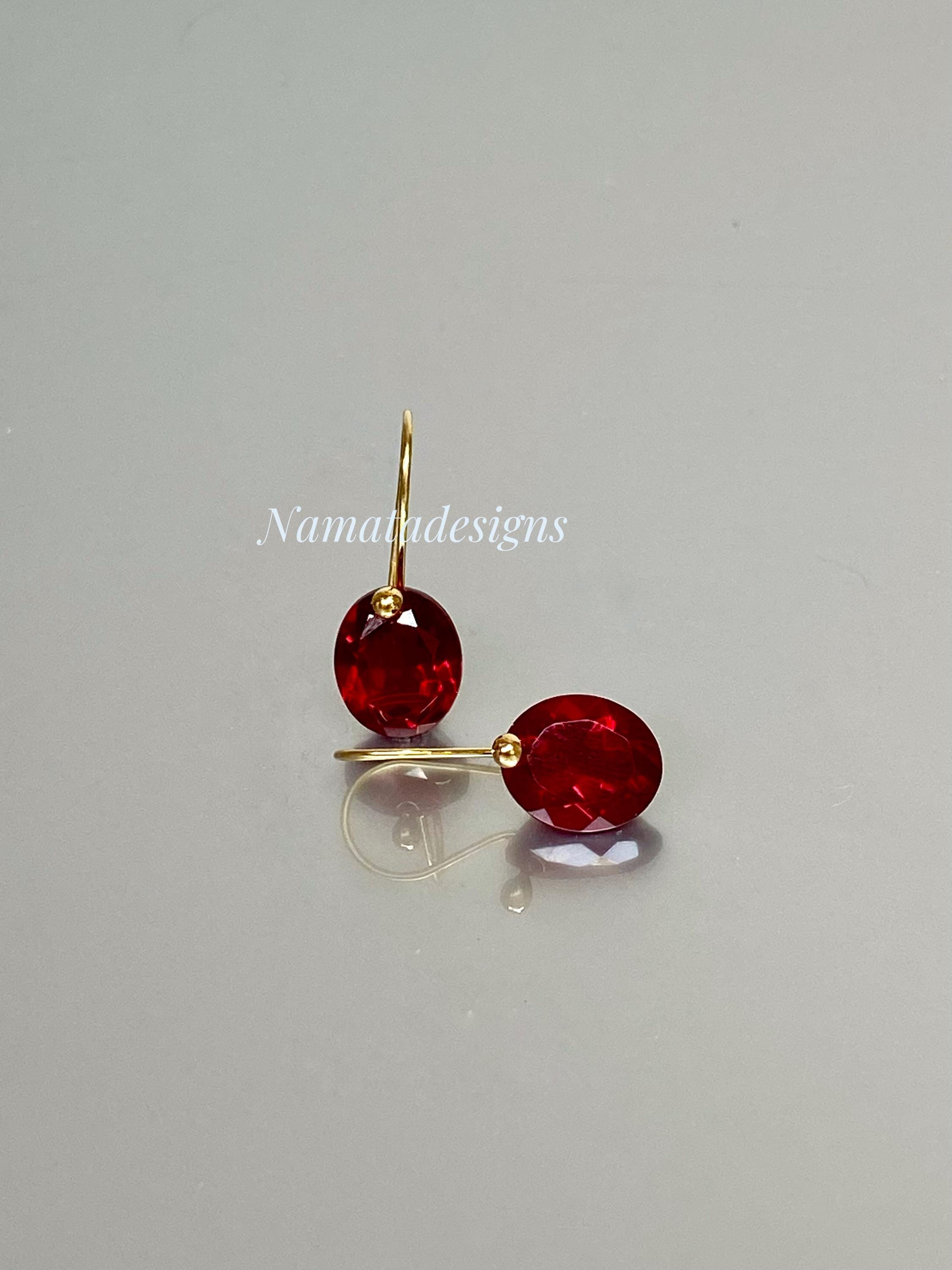 These beautiful red ruby earrings feature faceted oval ruby drops in a deep wine-red color that shines brilliantly in the light. The 12 mm rectangular stones are facted drops for maximum sparkle, and the earrings hang 1.1" total.