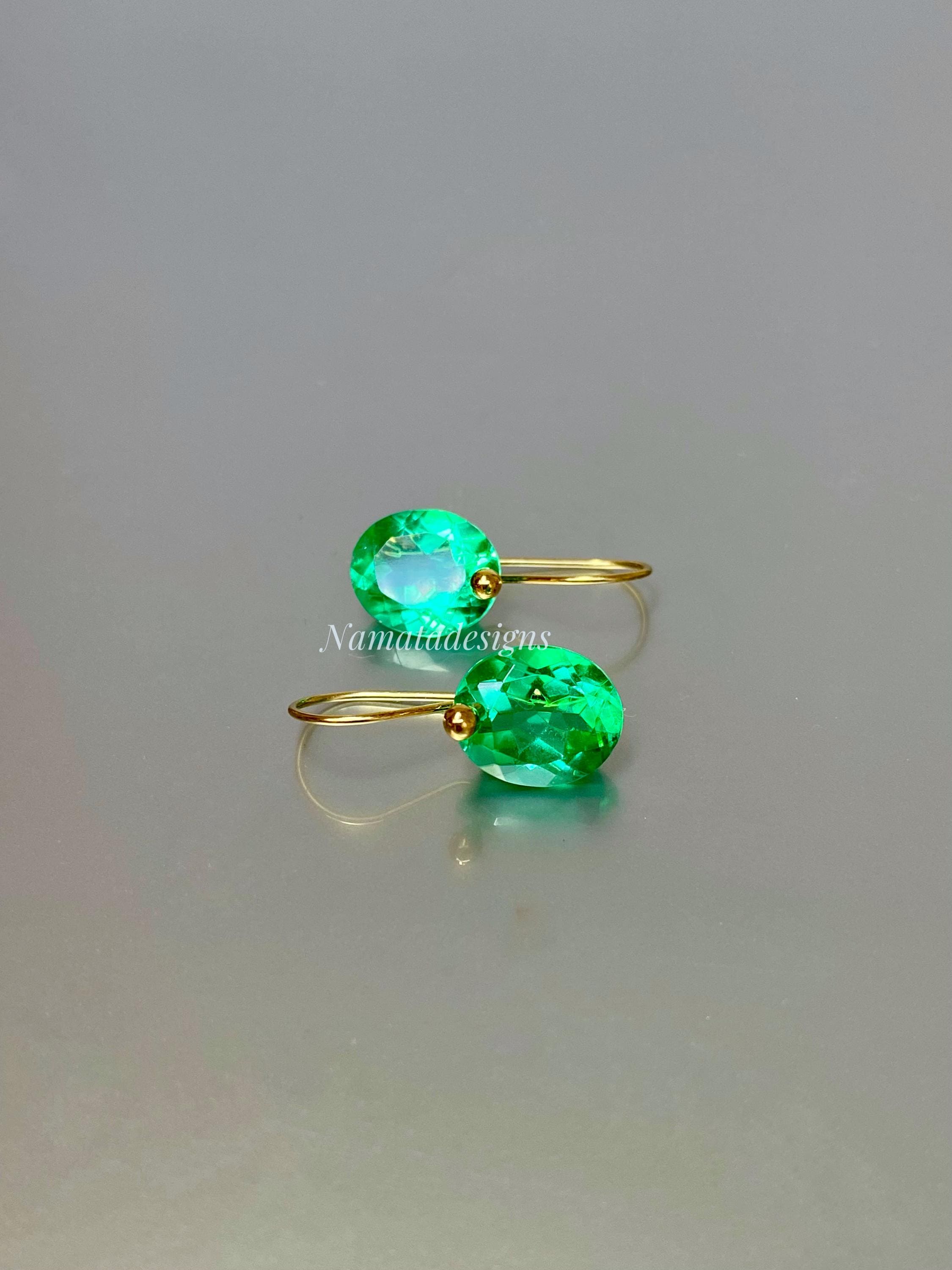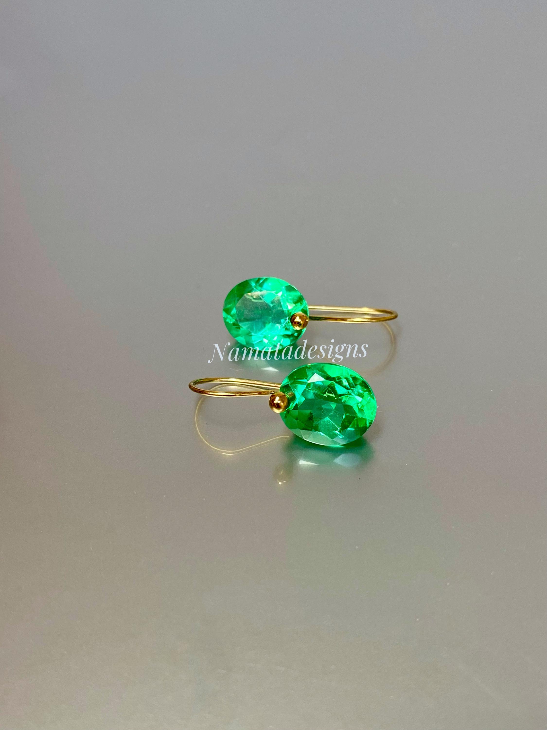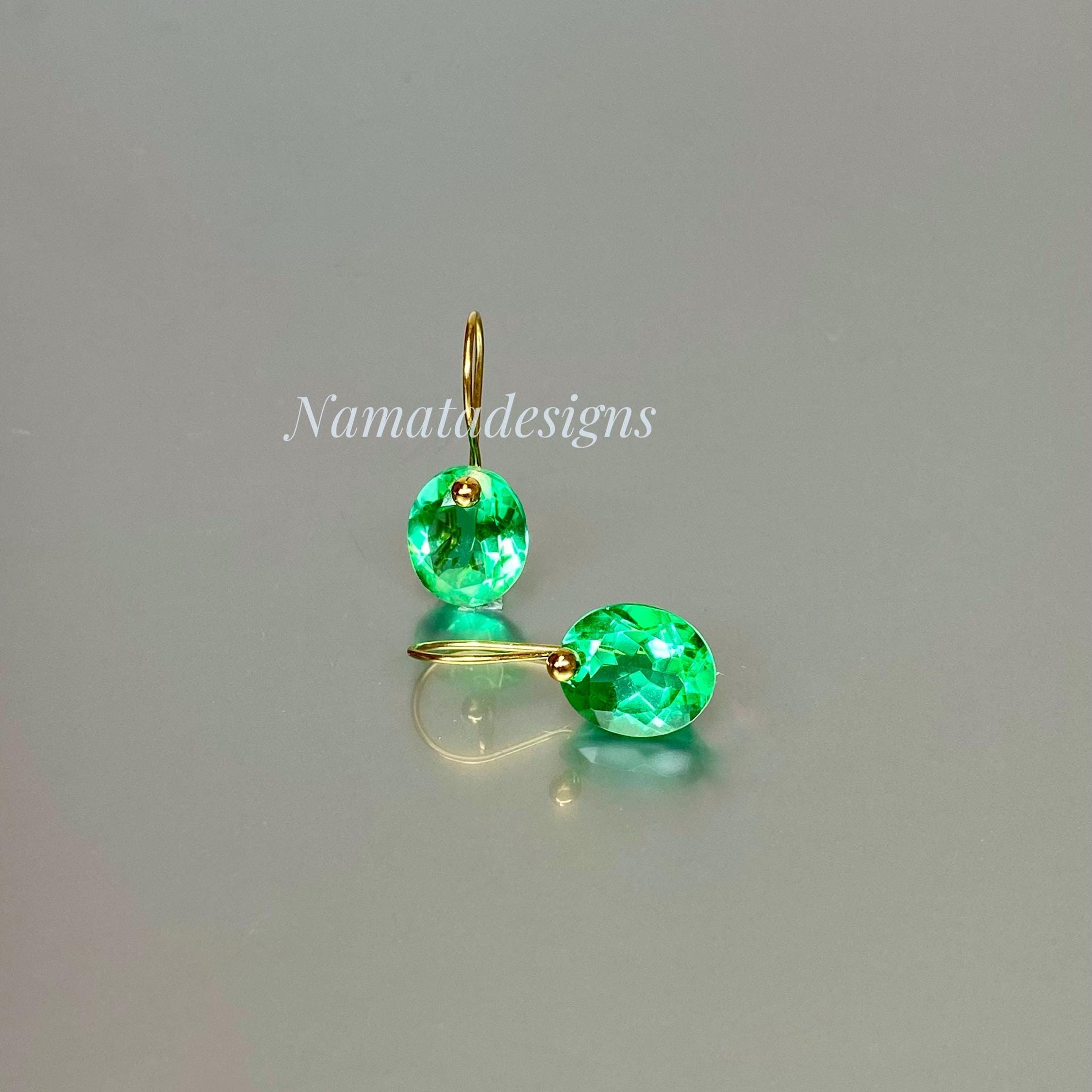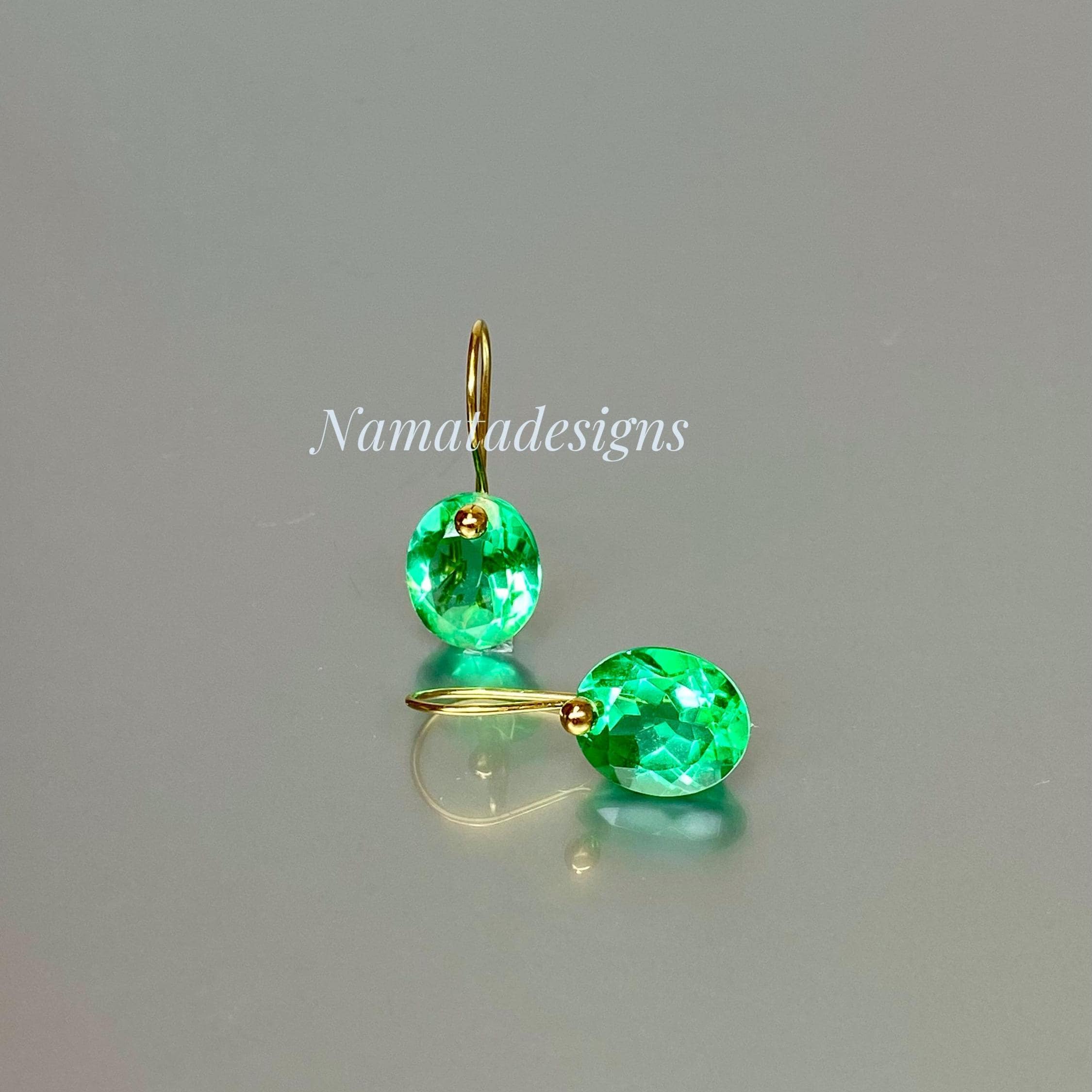 Gorgeous Colombian emerald dangle earrings. These elegant 12 mm oval drops have a beutfull, Caribbean ocean vibrant green color, bringing depth to the stone and reflecting light beautifully. The earrings hang 1.1" total.