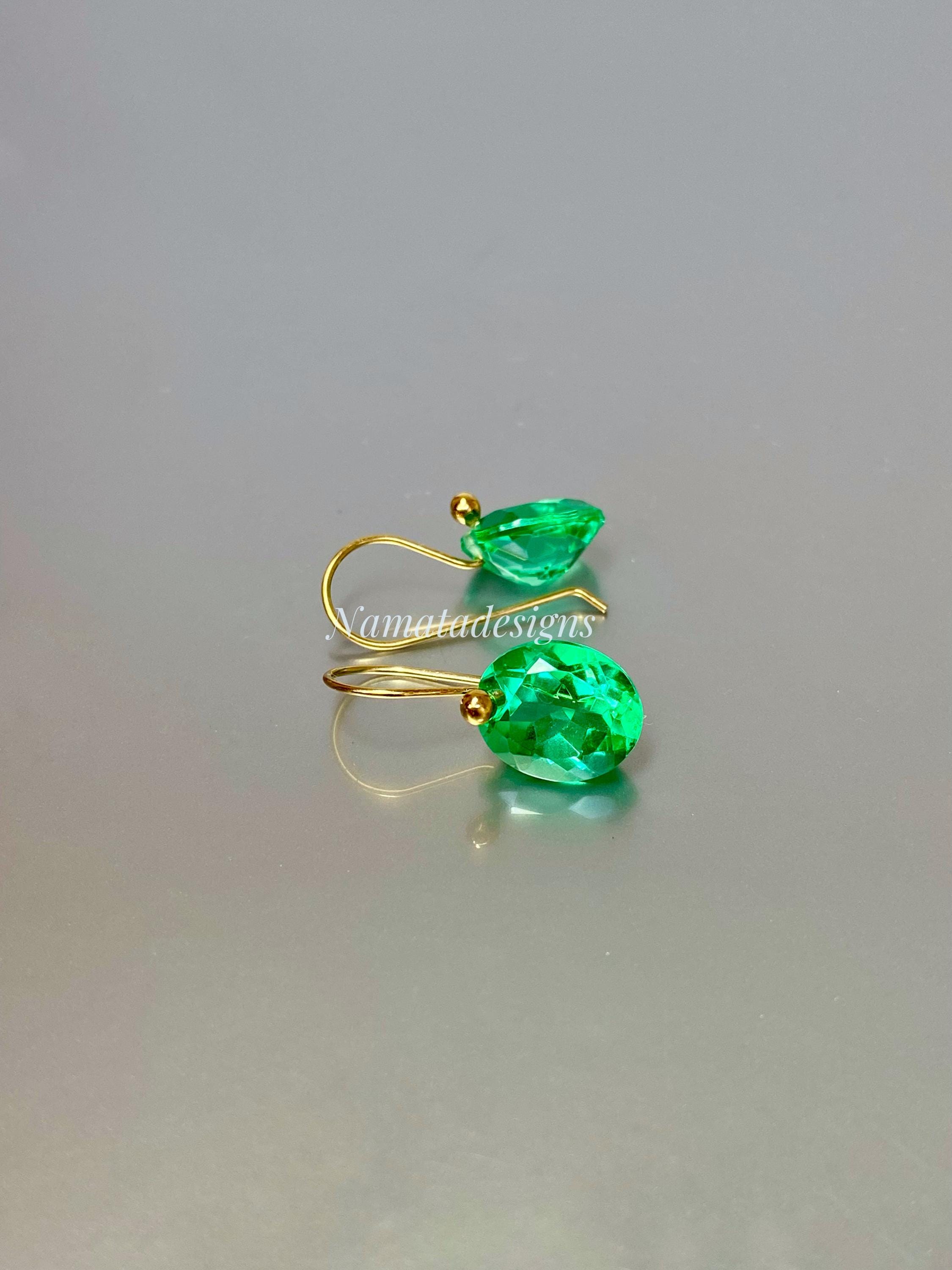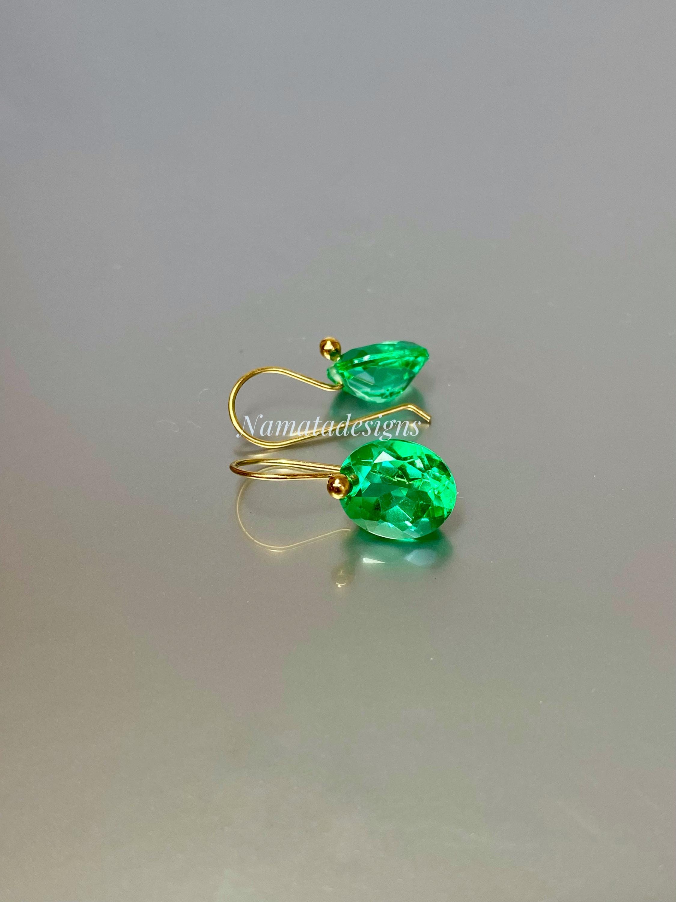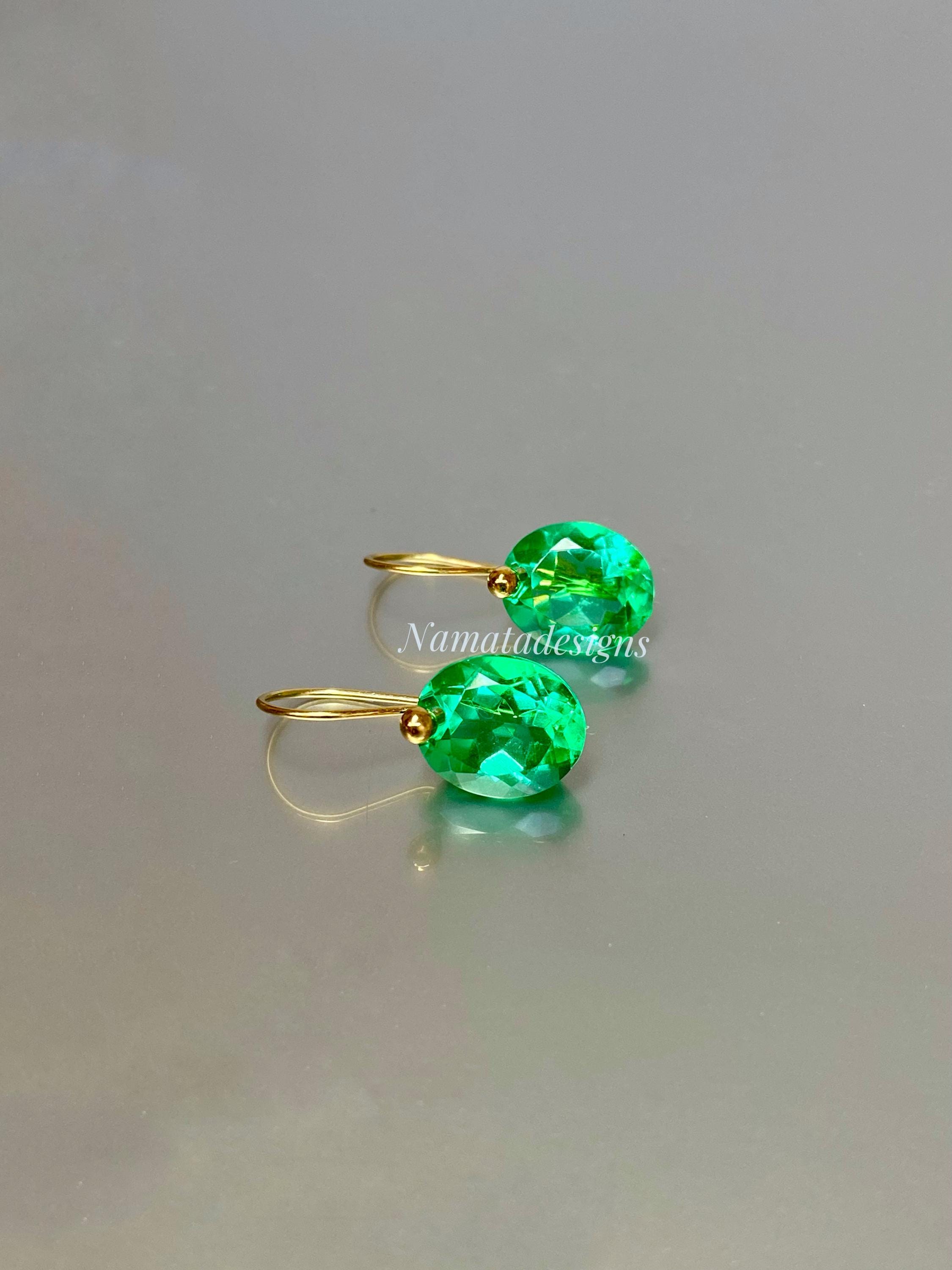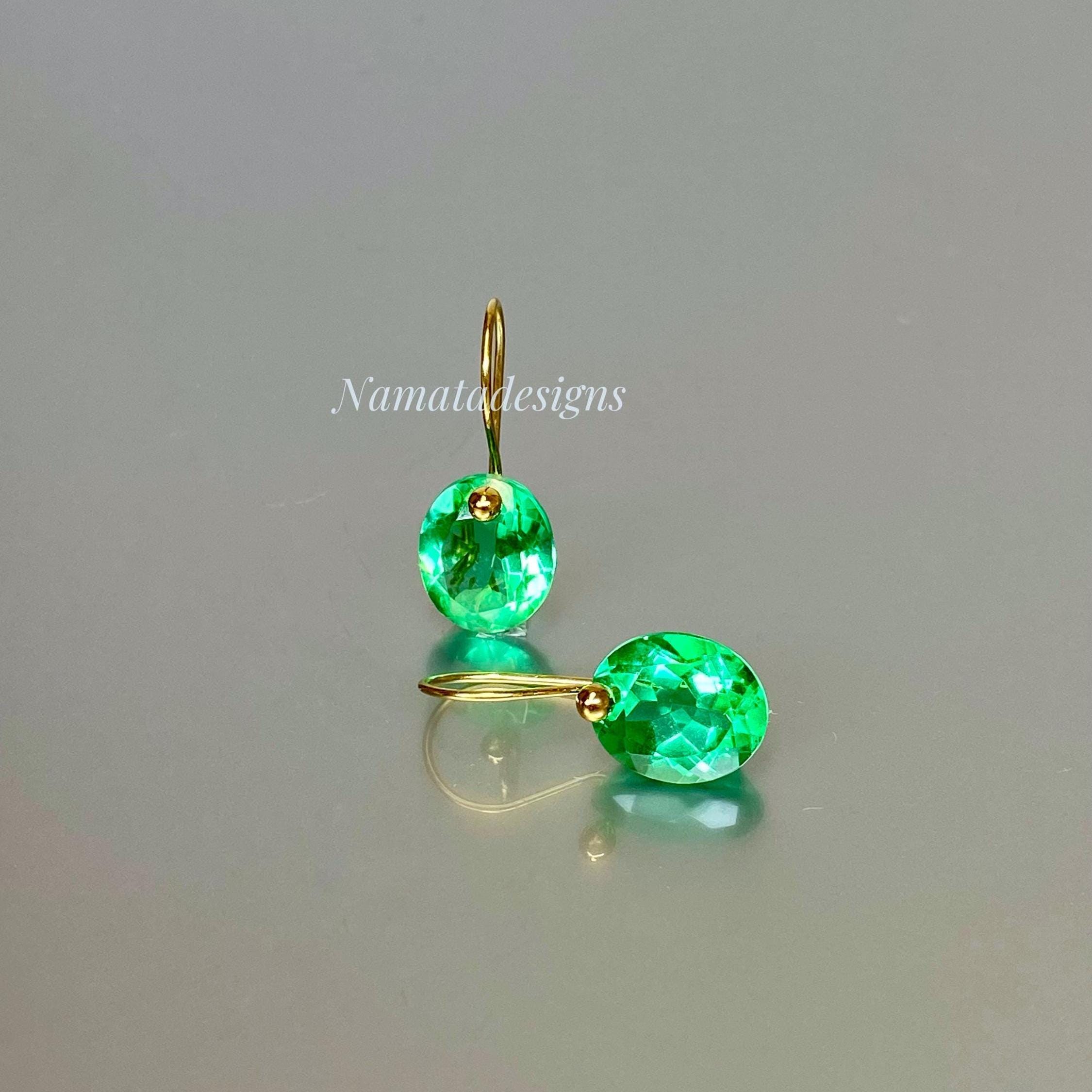 Gorgeous Colombian emerald dangle earrings. These elegant 12 mm oval drops have a beutfull, Caribbean ocean vibrant green color, bringing depth to the stone and reflecting light beautifully. The earrings hang 1.1" total.