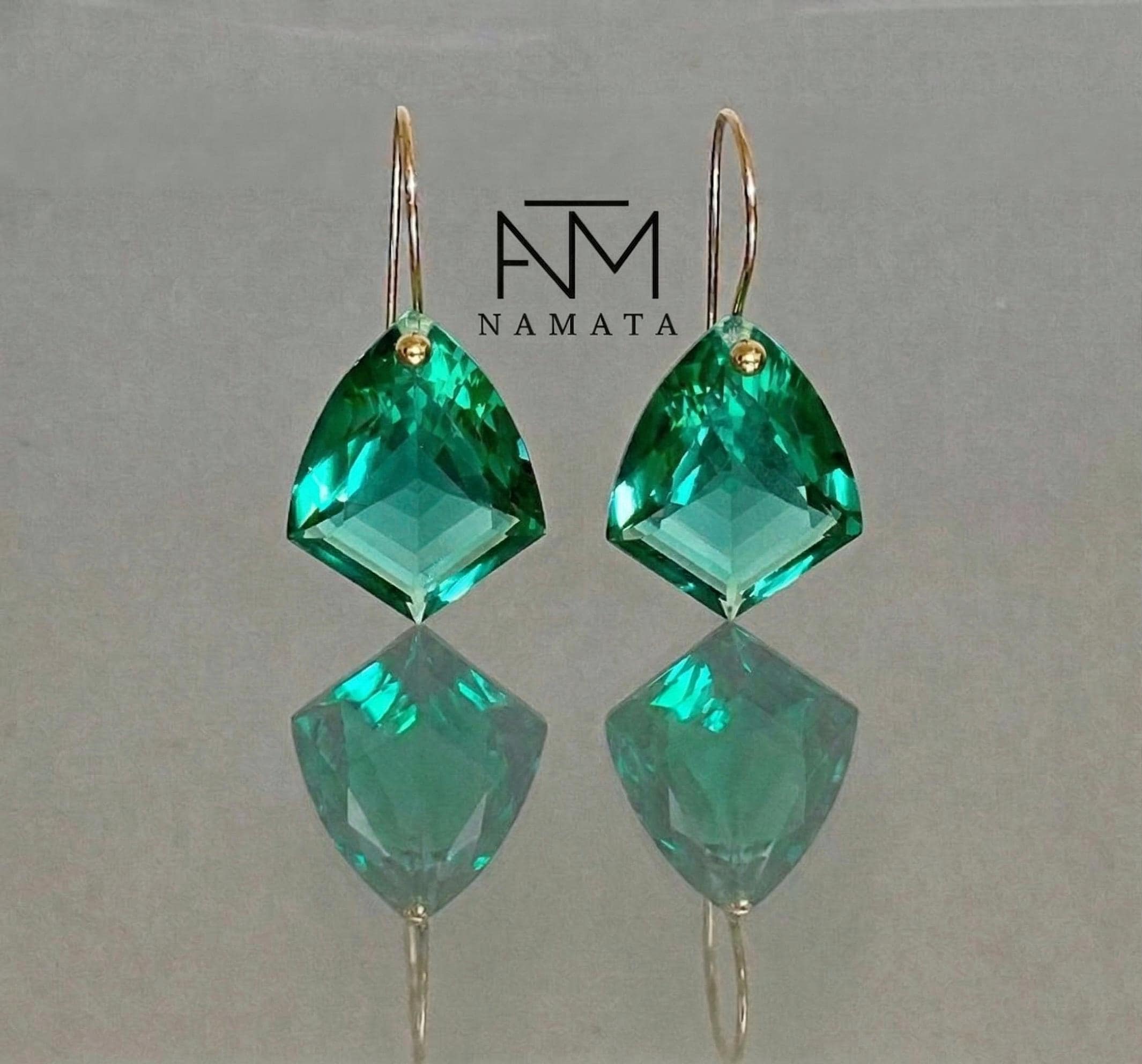 Beautiful Colombian emerald earrings in Brilliant drops. The faceted unique drops have a gorgeous Caribean ocean green color that brings lots of depth to the stone and reflects light beautifully. The fancy drops are attached to 24K Gold Vermeil/ 14K Solid gold ear wires.