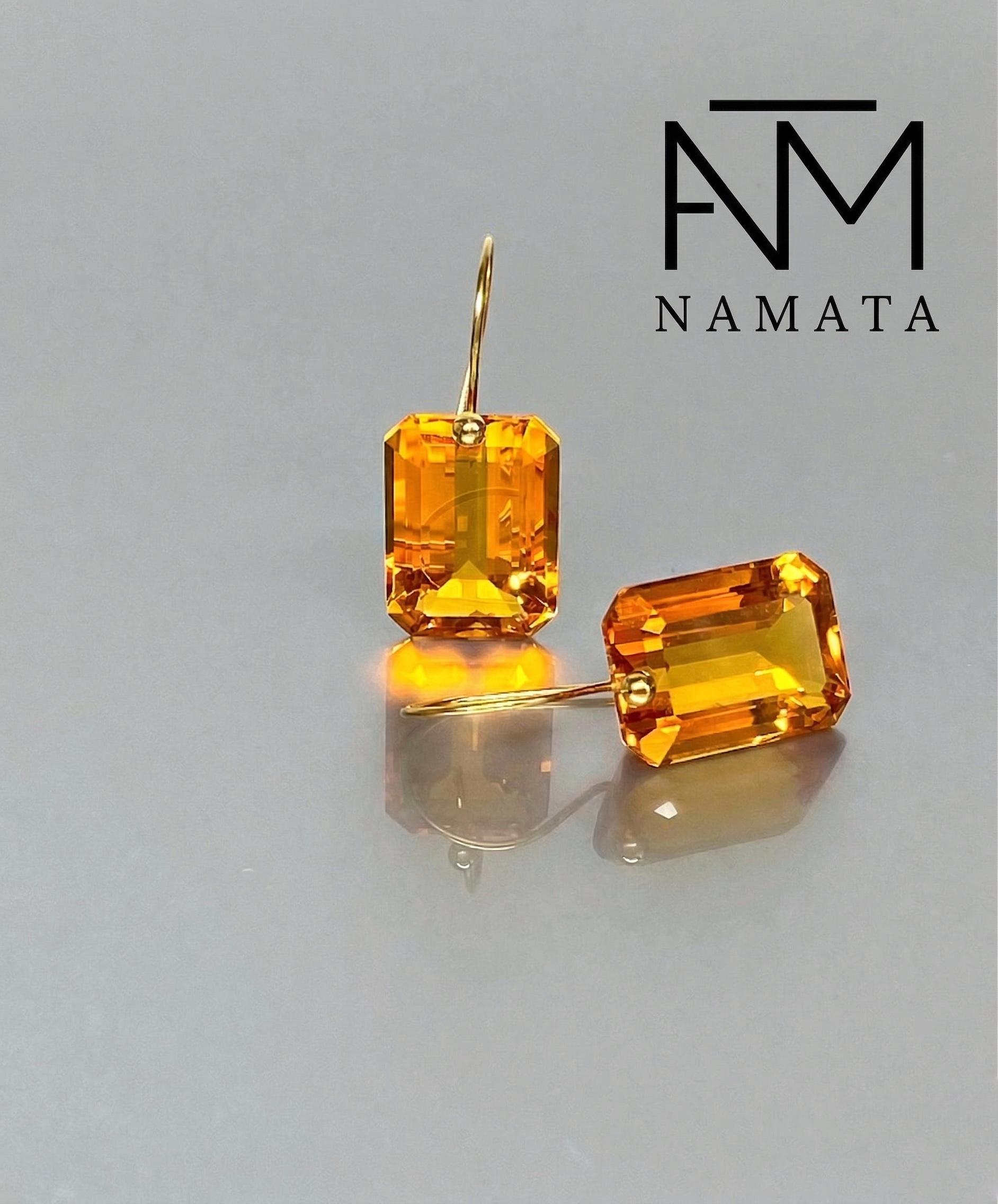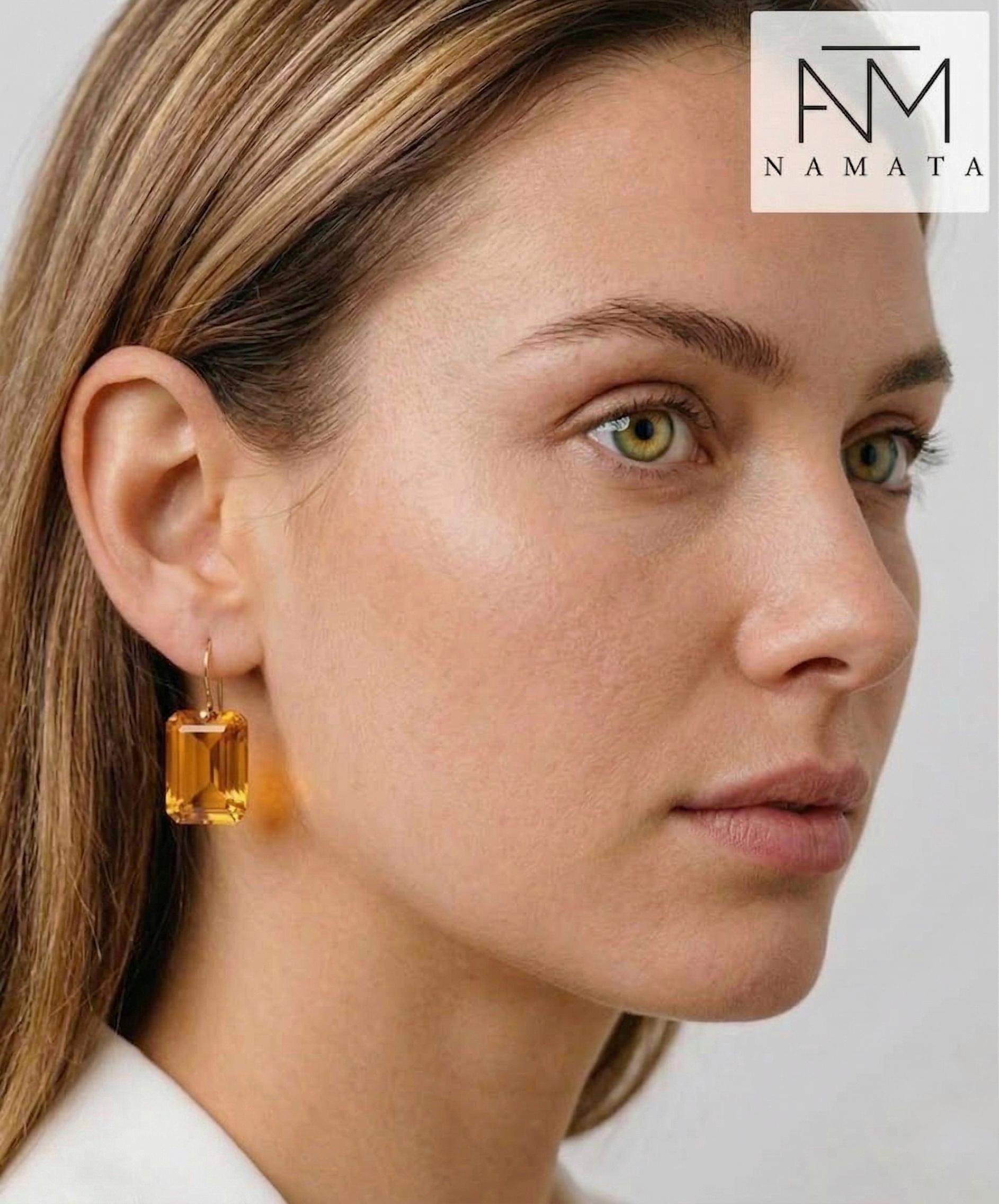 Beautiful Madeira Citrine earrings featuring brilliant drop-shaped pendants. The faceted rectangular drops cast a deep golden sunshine-yellow color.