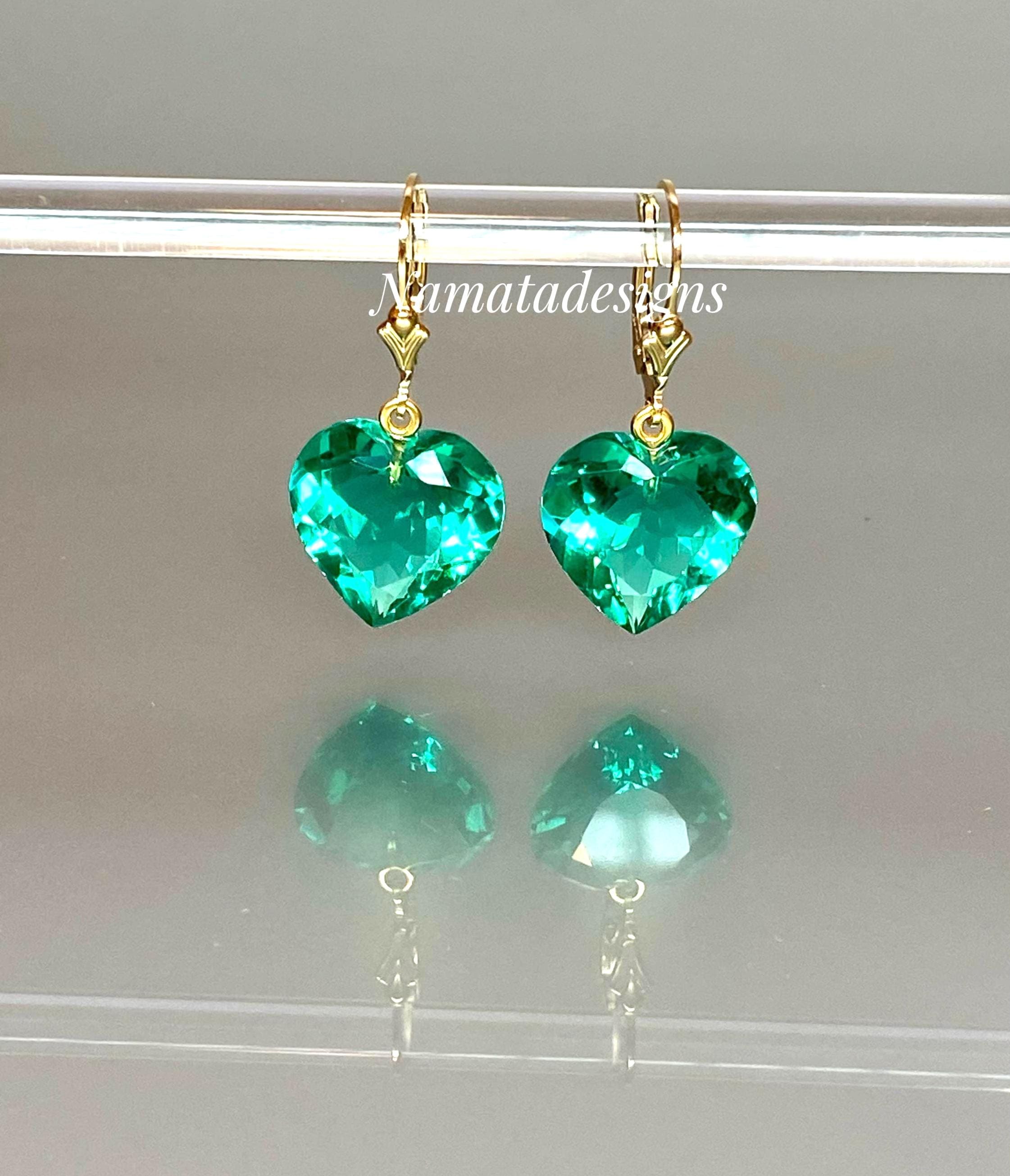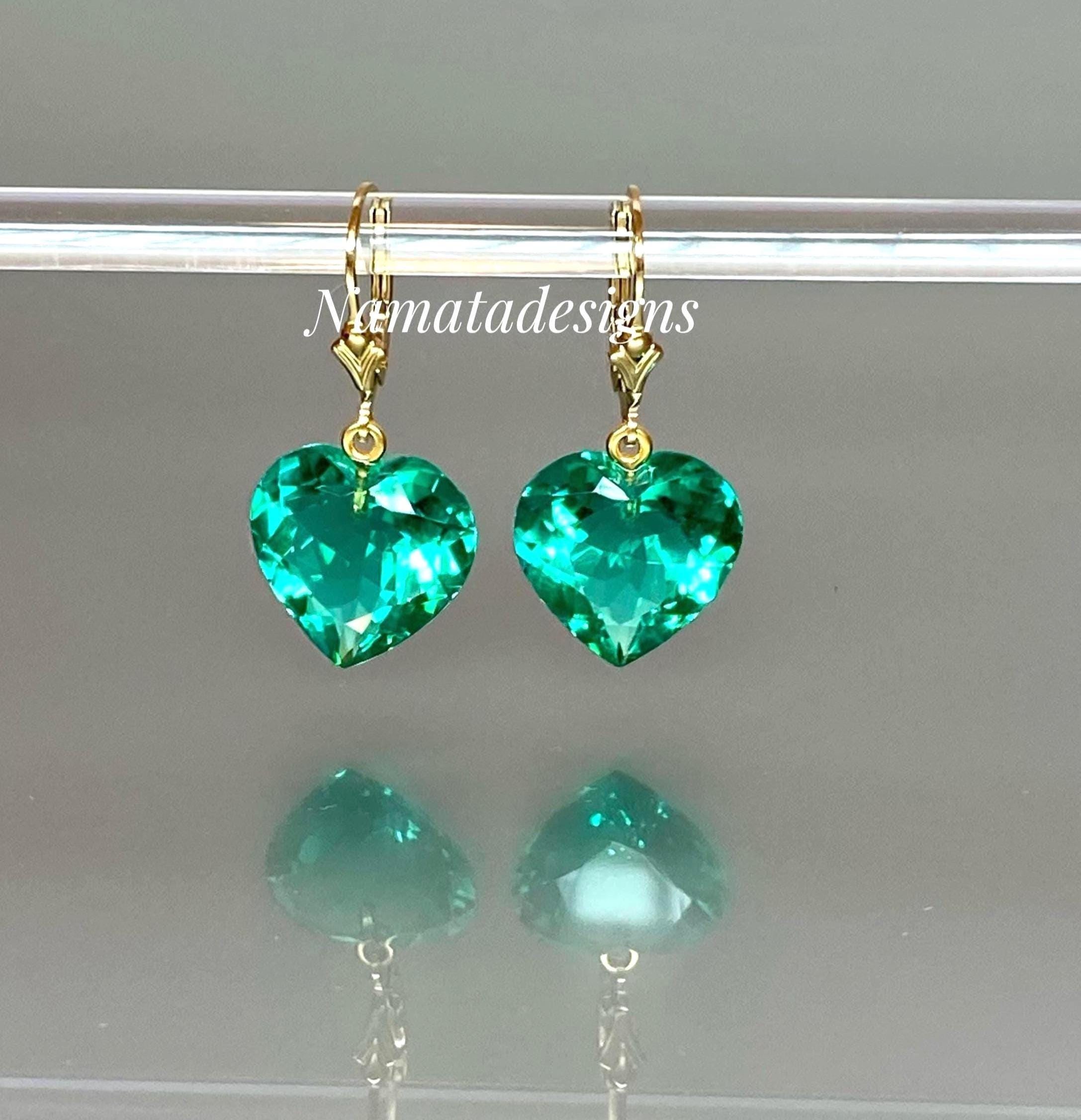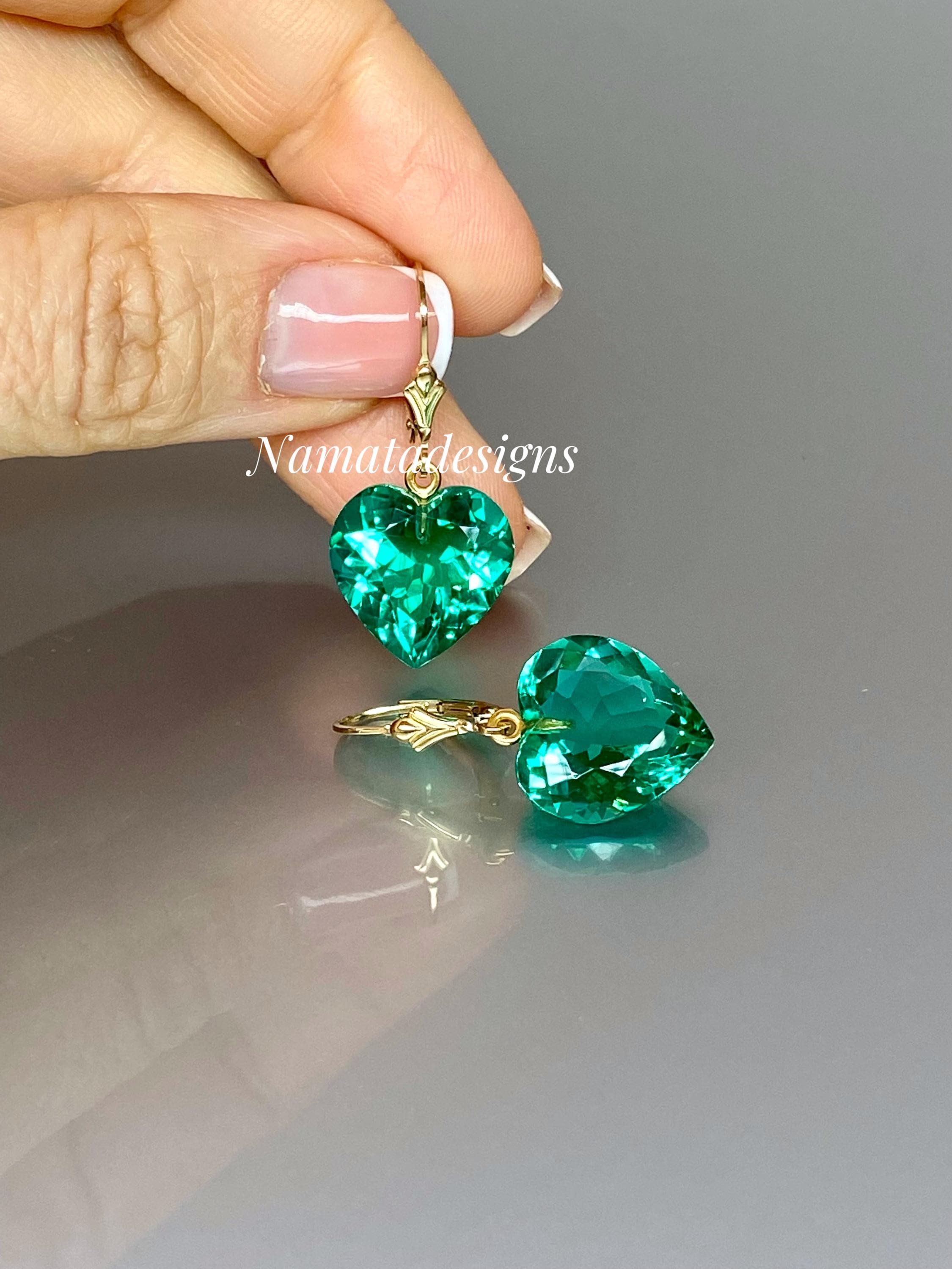 14K Gold Colombian Emerald Heart Earrings, October Birthstone, Heart Earrings, Emerald Jewelry Gift For Her, Mothers Day Gift.