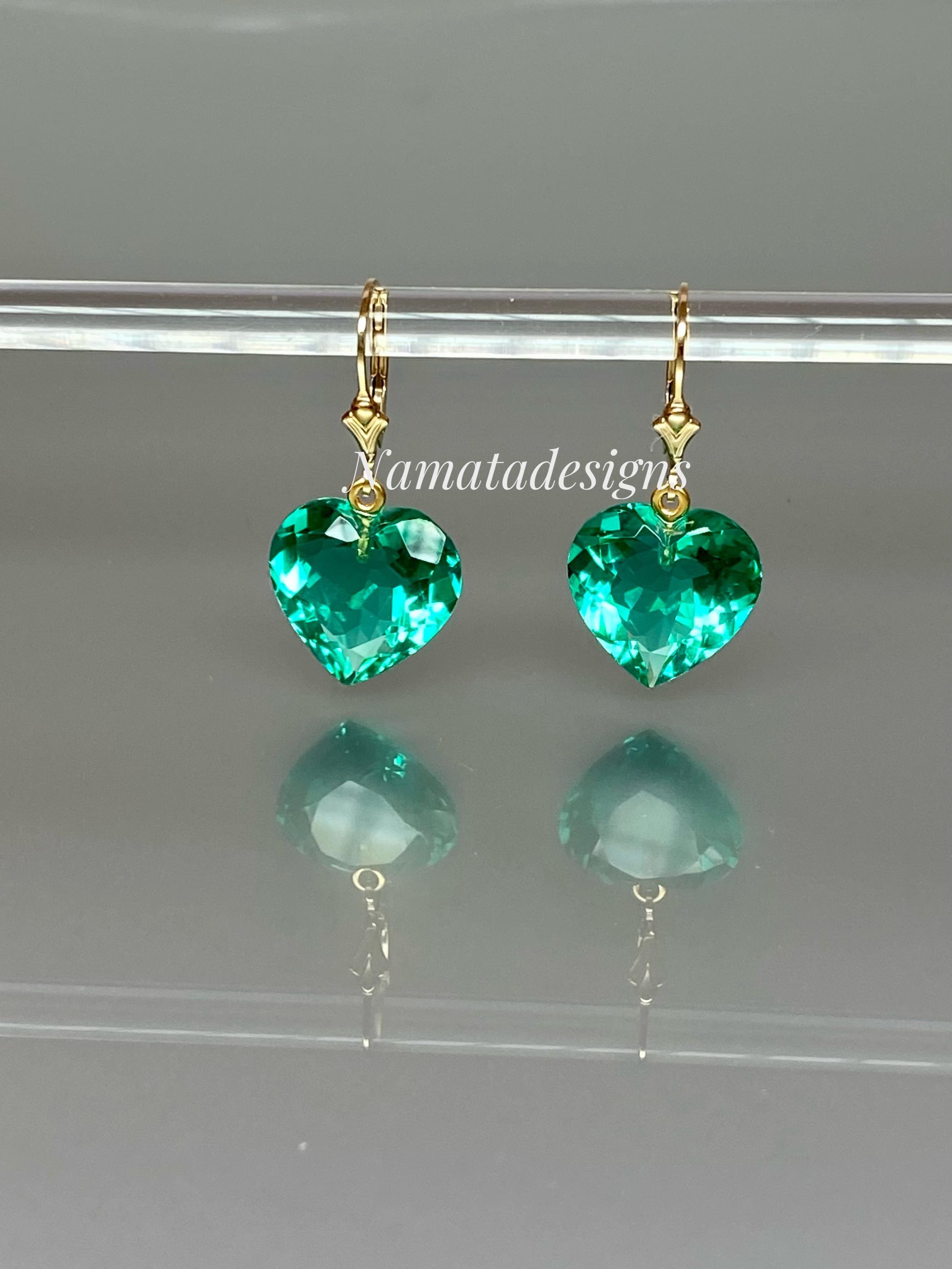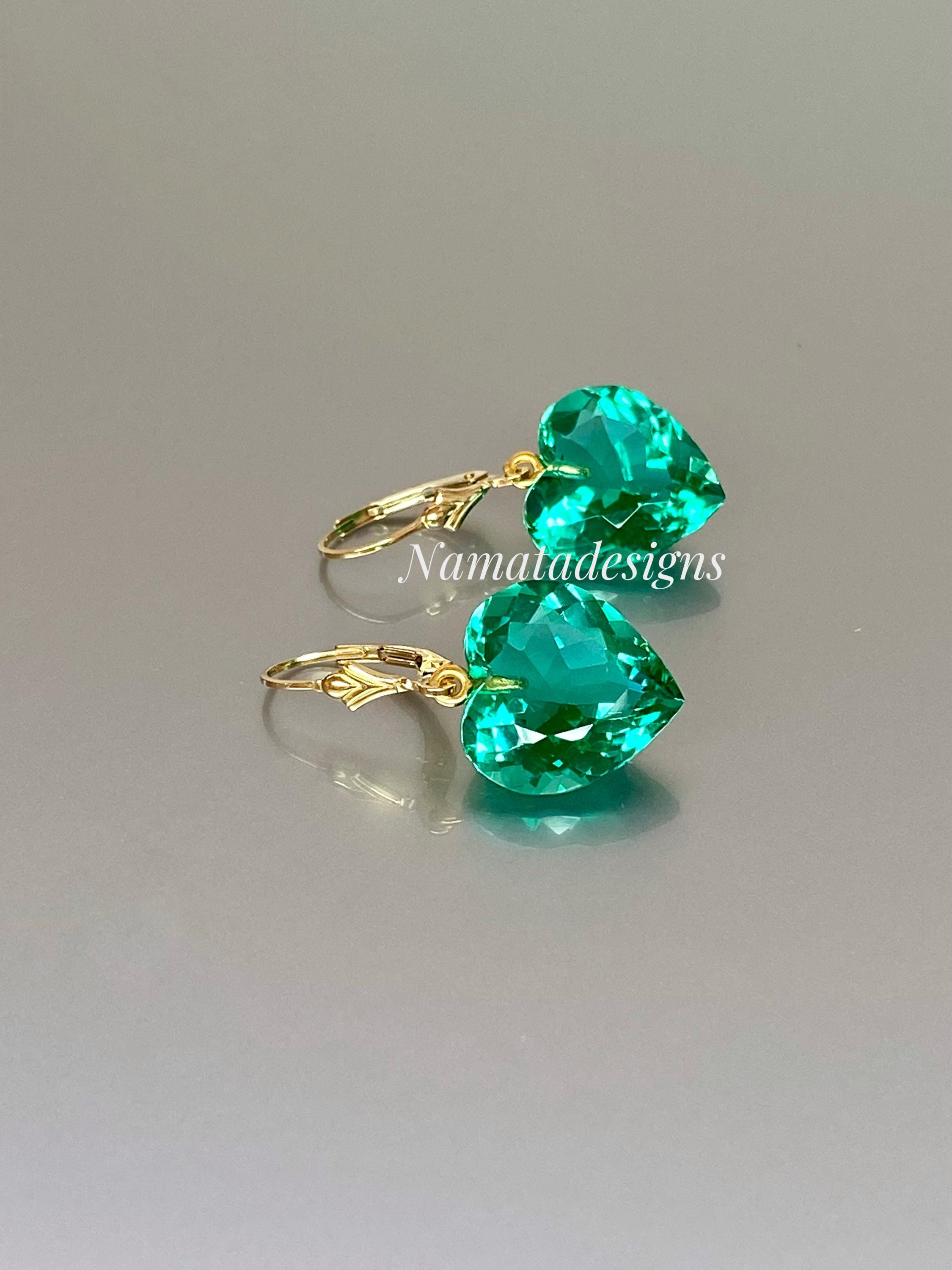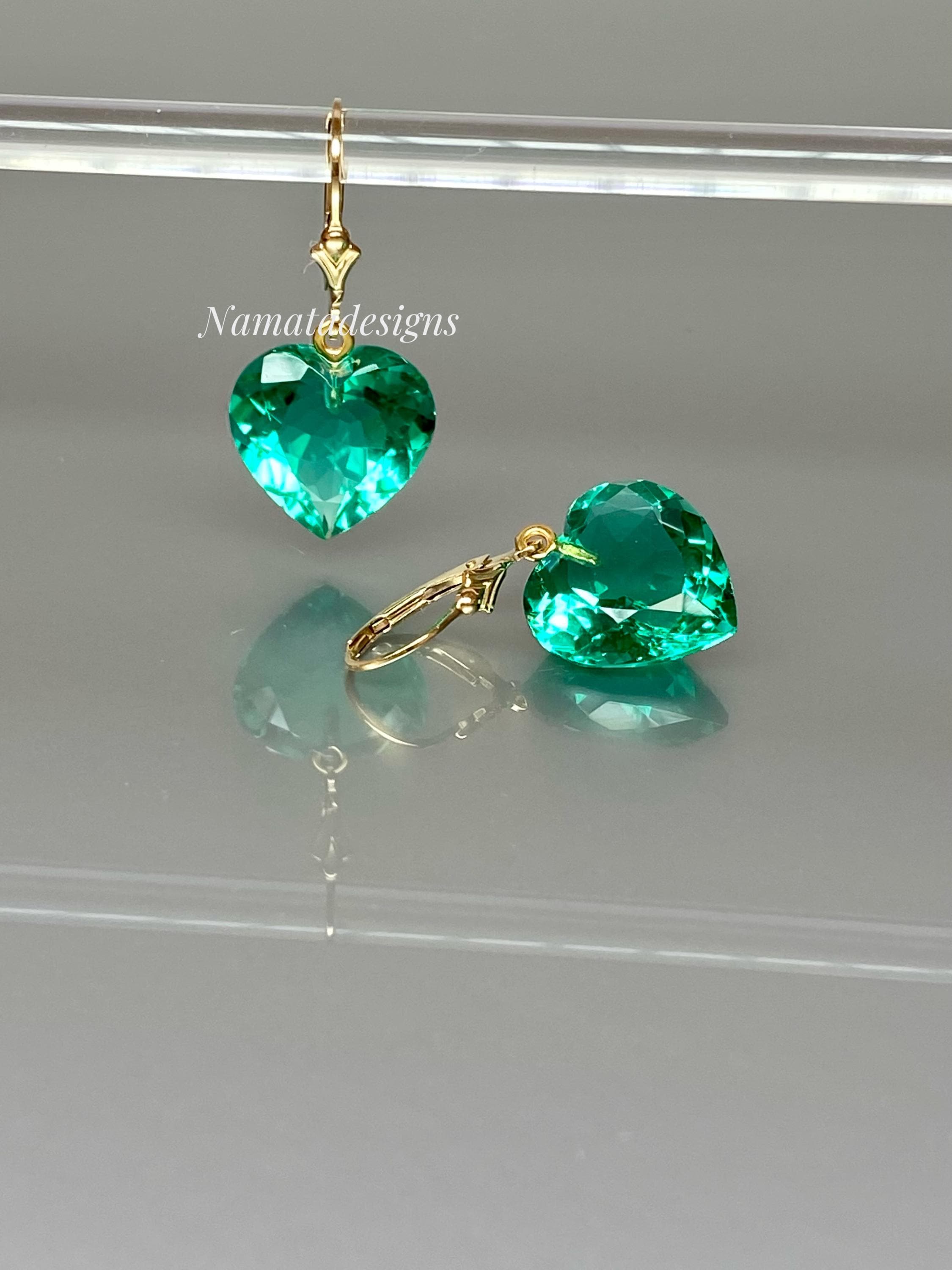 Gorgeous sparkly Colombian Emerald earrings heart earrings. The Faceted heart shape drops are flawless and have a Caribean ocean green color that brings lots of depth to the stone and reflects lights beautifully. The drops are attached to secure 24K Gold vermei lever backs. The earrings are elegant and have a luxurious look.