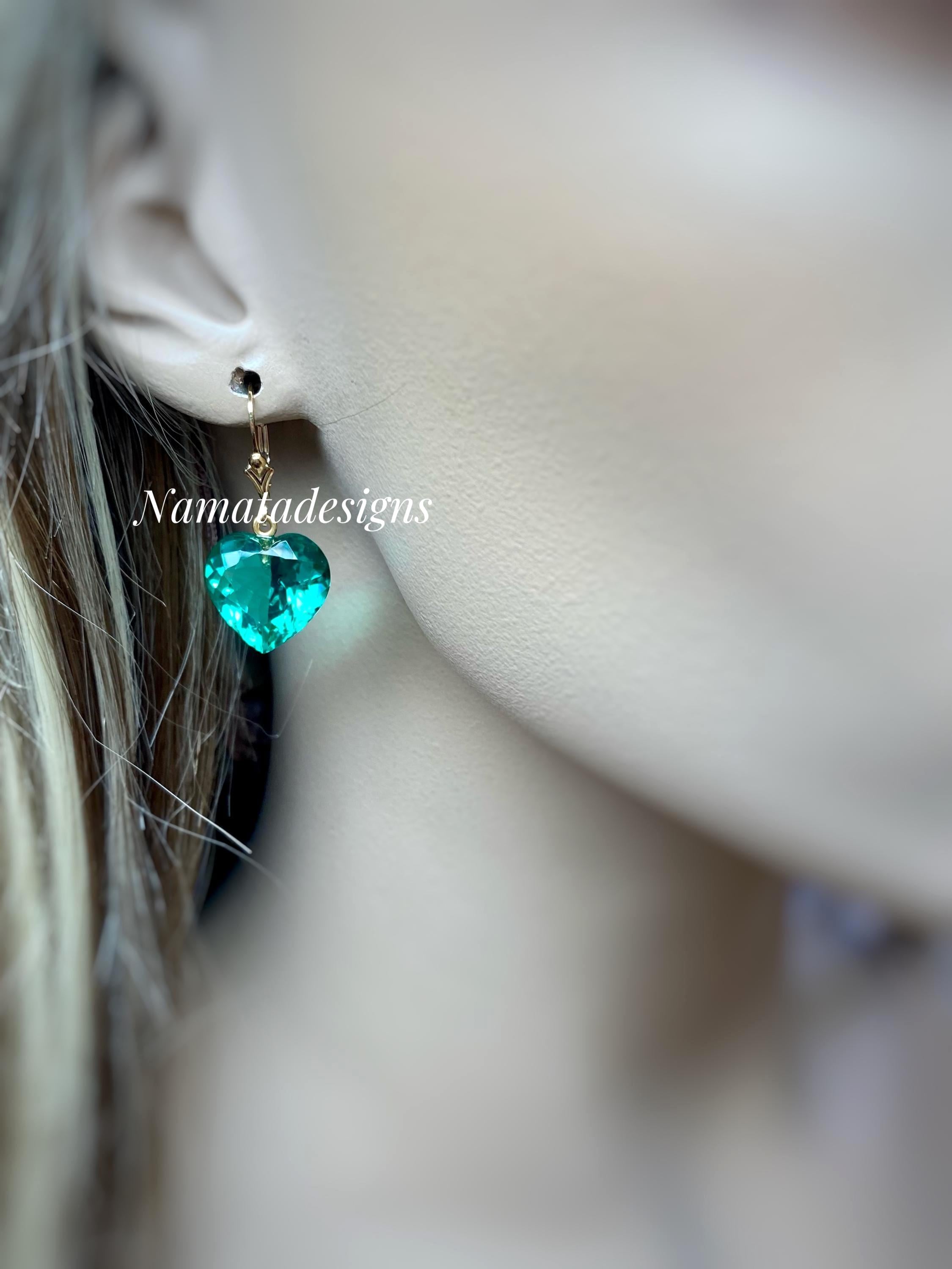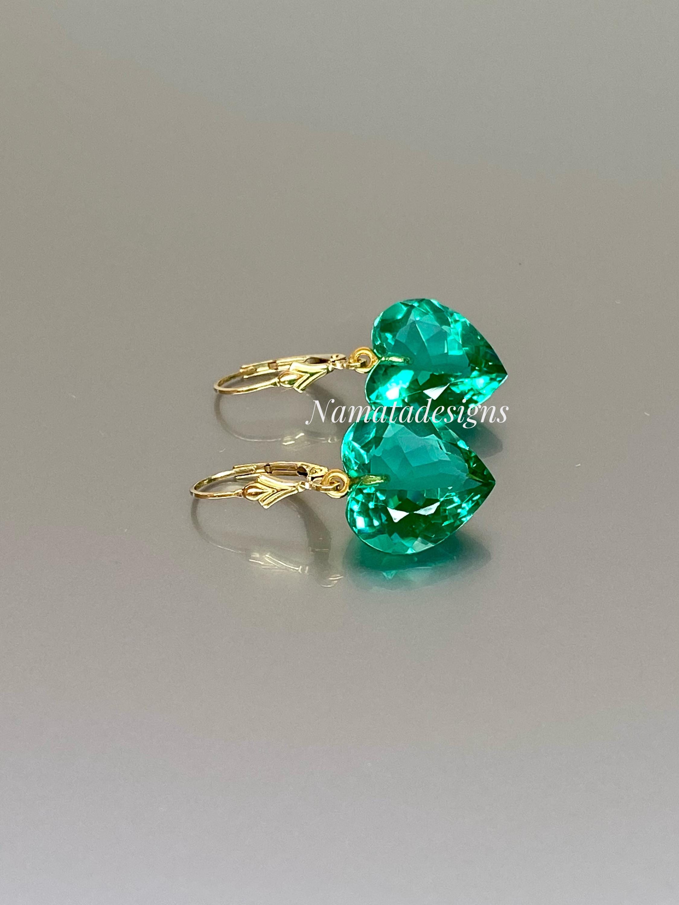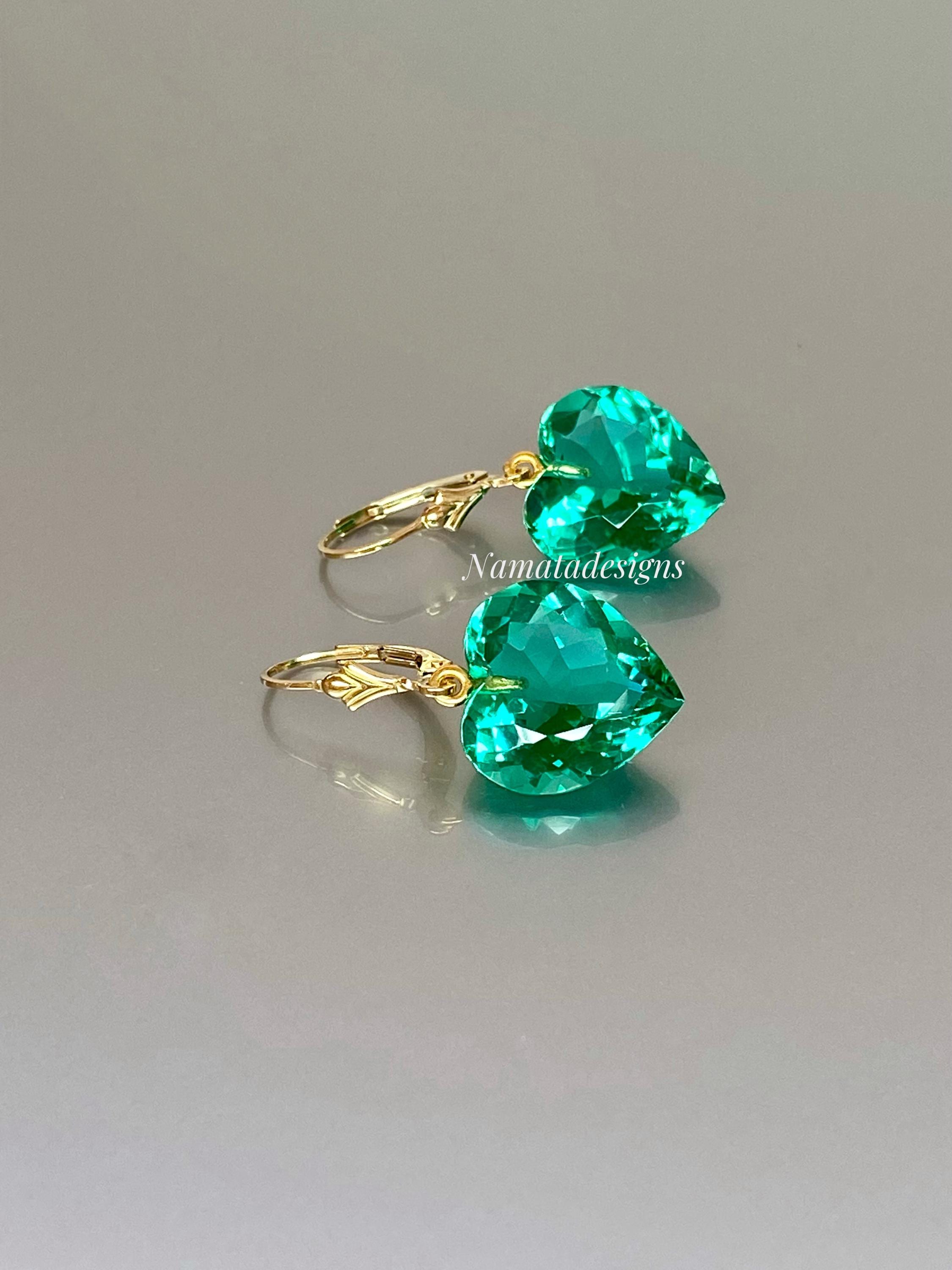 Gorgeous sparkly Colombian Emerald earrings heart earrings. The Faceted heart shape drops are flawless and have a Caribean ocean green color that brings lots of depth to the stone and reflects lights beautifully. The drops are attached to secure 24K Gold vermei lever backs. The earrings are elegant and have a luxurious look.