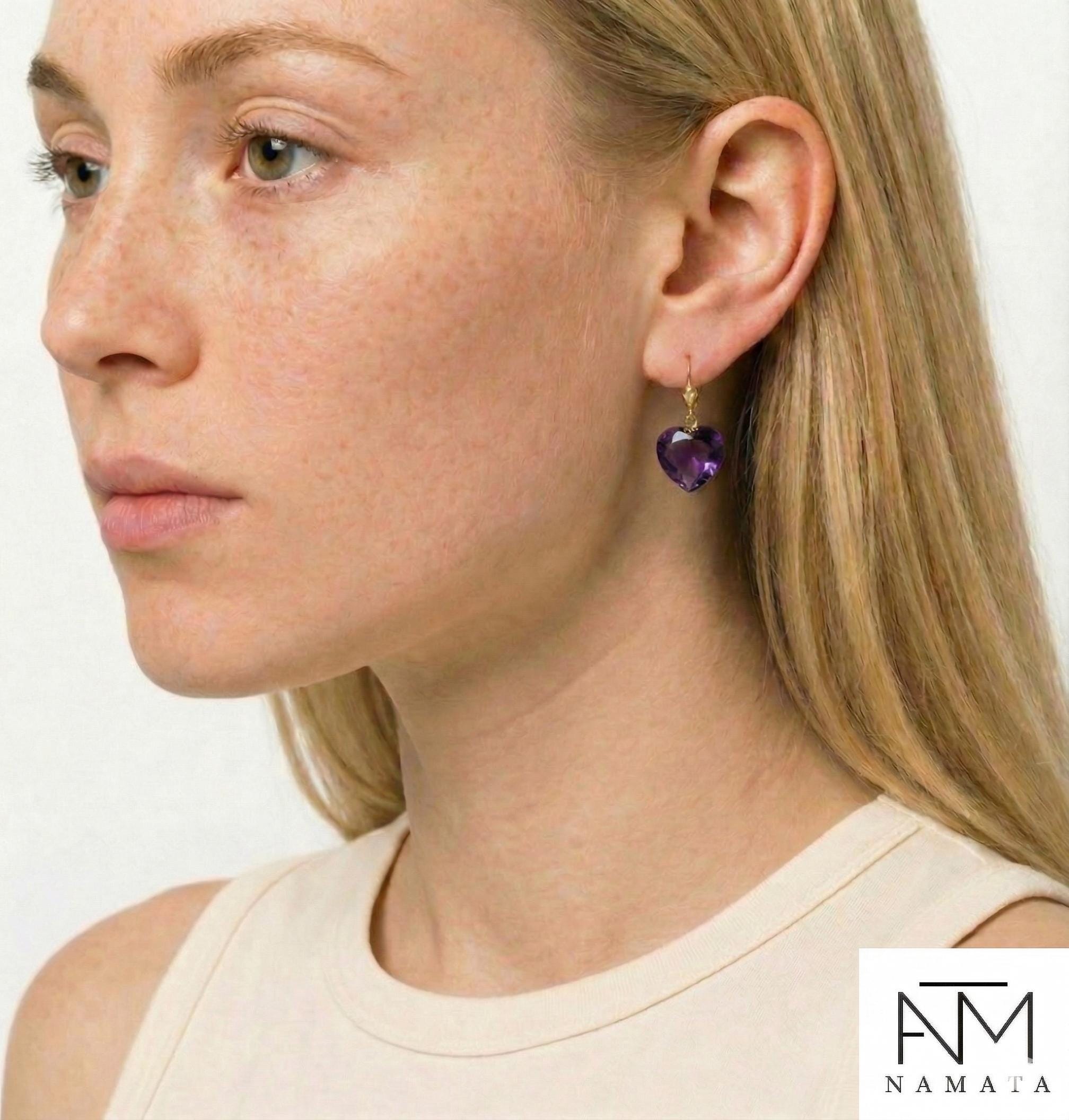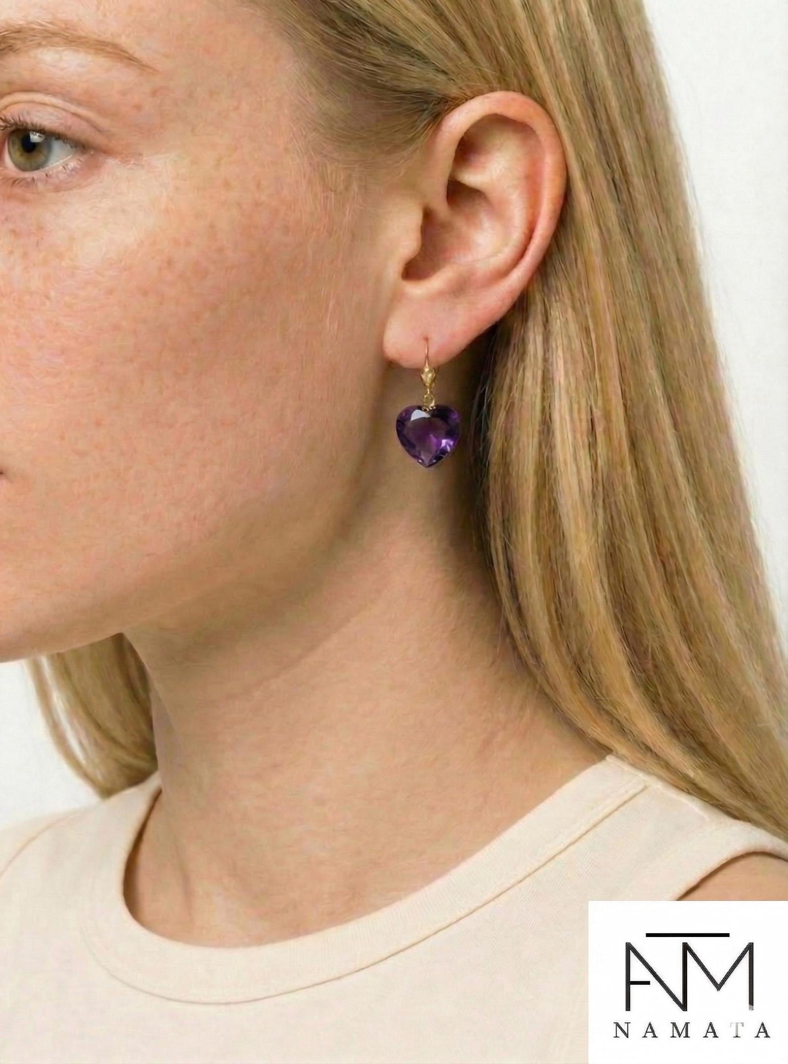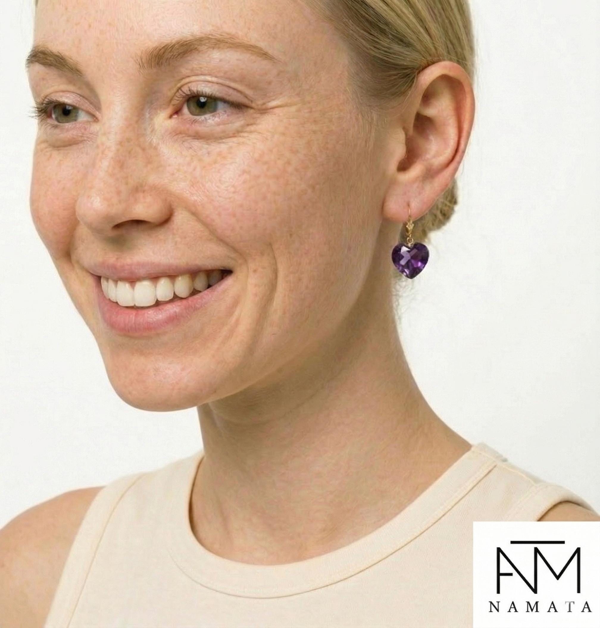 Gorgeous sparkly purple amethyst heart earrings. The Faceted heart shape drops are flawless and have beautiful vivid clear deep purple. The drops attached to secure 14k gold-filled lever backs. The earrings are minimalist, elegant, and have a luxurious look.