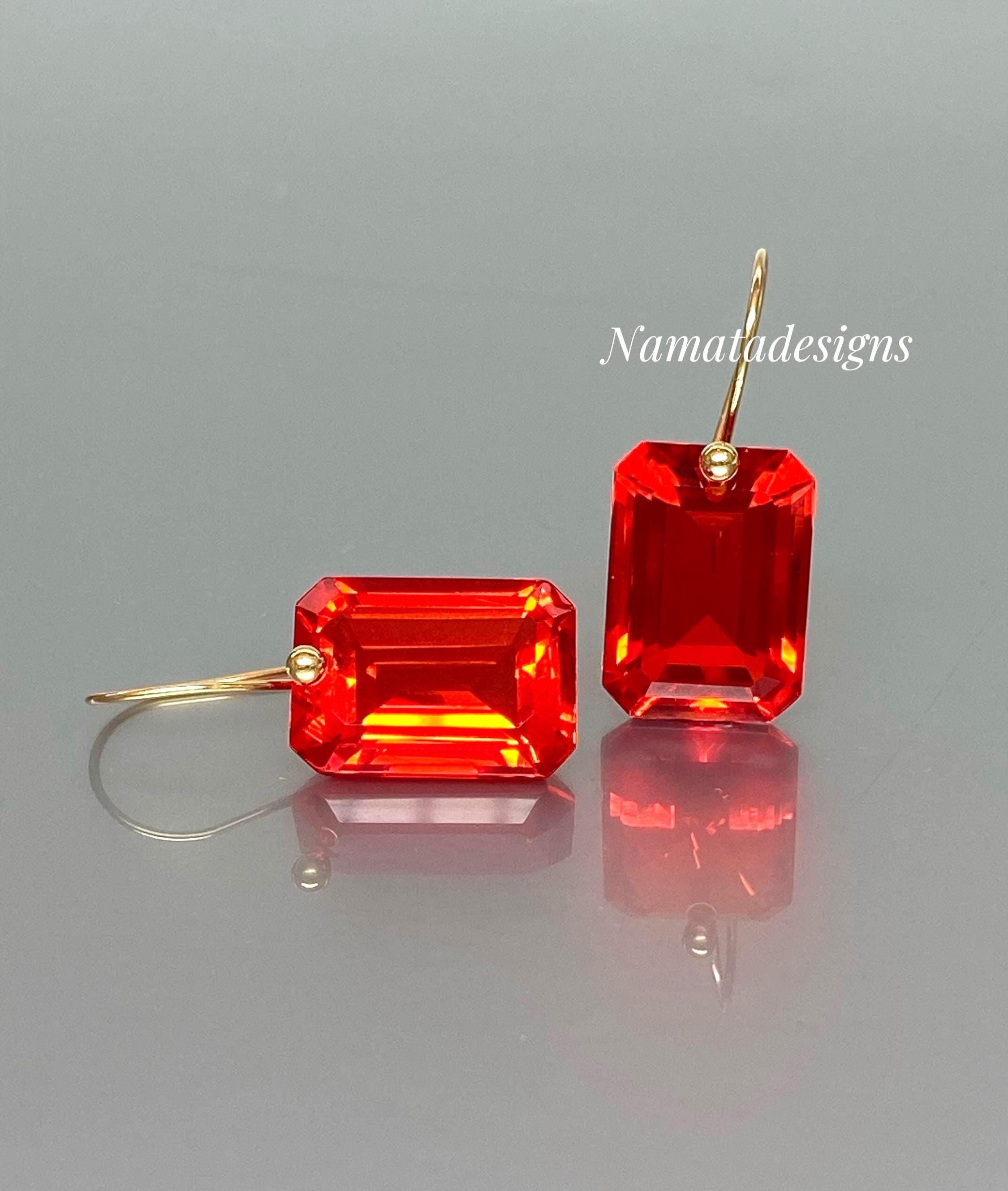 Add a fiery touch to your look with these stunning flame red-orange fire opal drop earrings. The faceted emerald-cut drops are flawless, showcasing a vivid, glowing color that reflects the light beautifully and adds incredible depth.