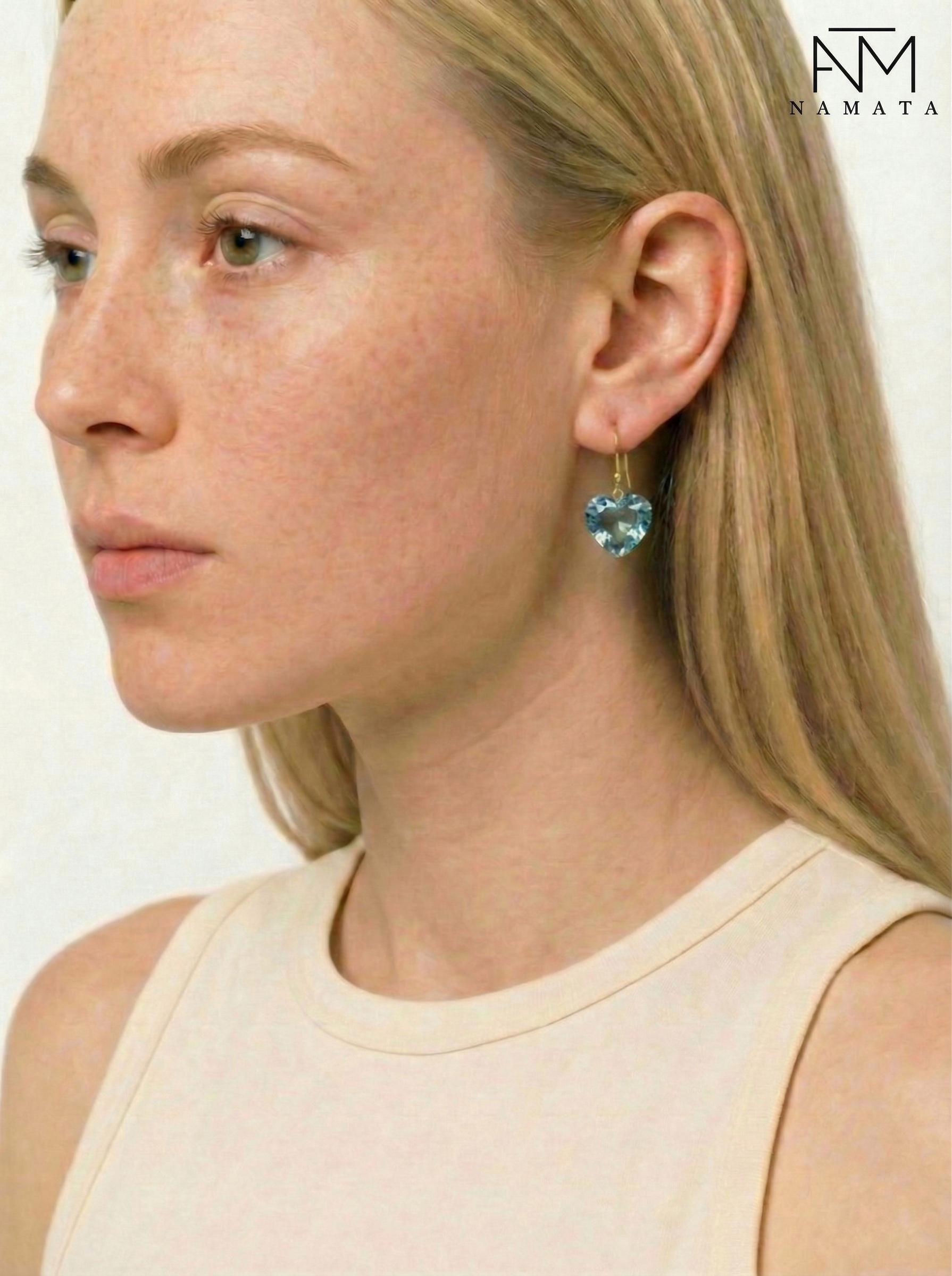 Each earring features a heart-shaped aquamarine, expertly faceted to enhance its fresh blue sparkle, and suspended from 24K gold Vermiel or solid 14K or 18K French ear wires for a delicate, fluid movement. The romantic heart cut meets clean gold lines for a refined yet modern look.