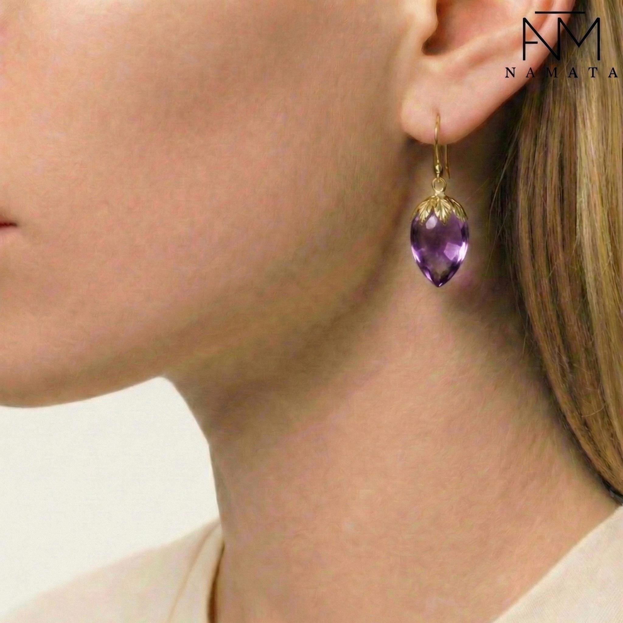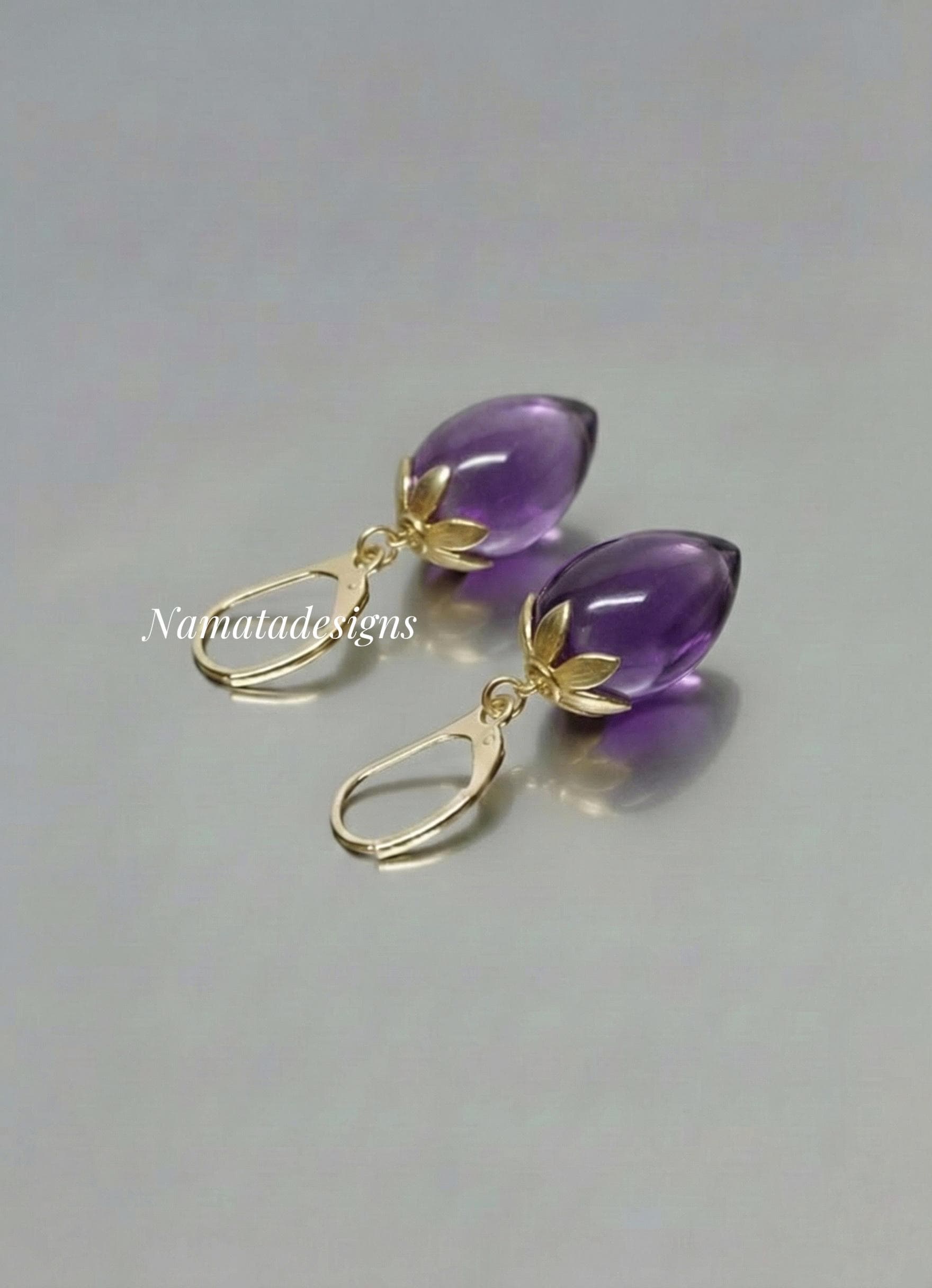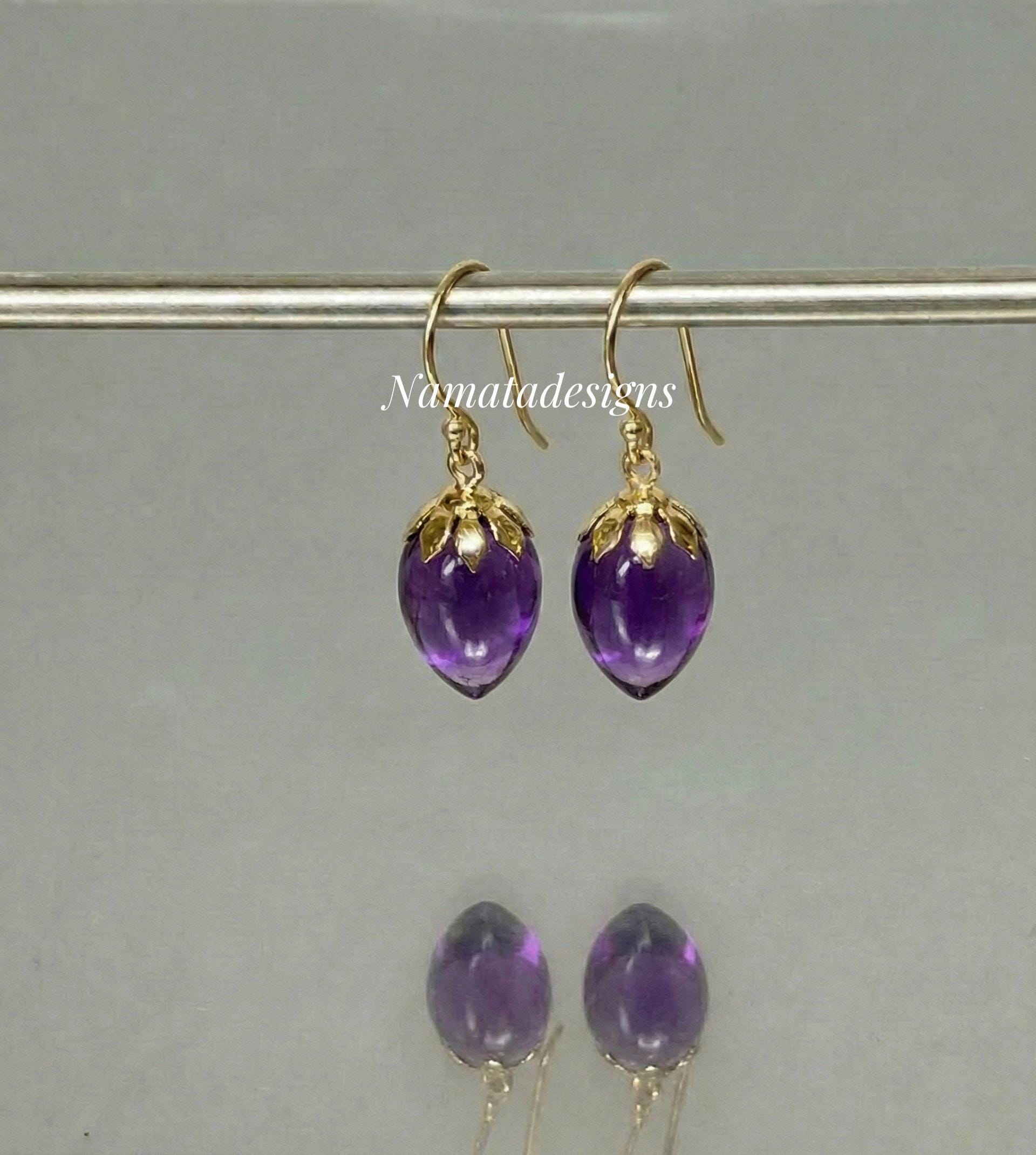 These Amethyst drop earrings feature a smooth teardrop gemstone with a deep violet shine that catches the light beautifully. The design is clean, timeless, and easy to style—elegant for special occasions yet simple enough for daily wear. Choose your favorite finish: classic Sterling Silver, romantic Rose Gold Vermeil, or luxurious 24K Gold Vermeil.