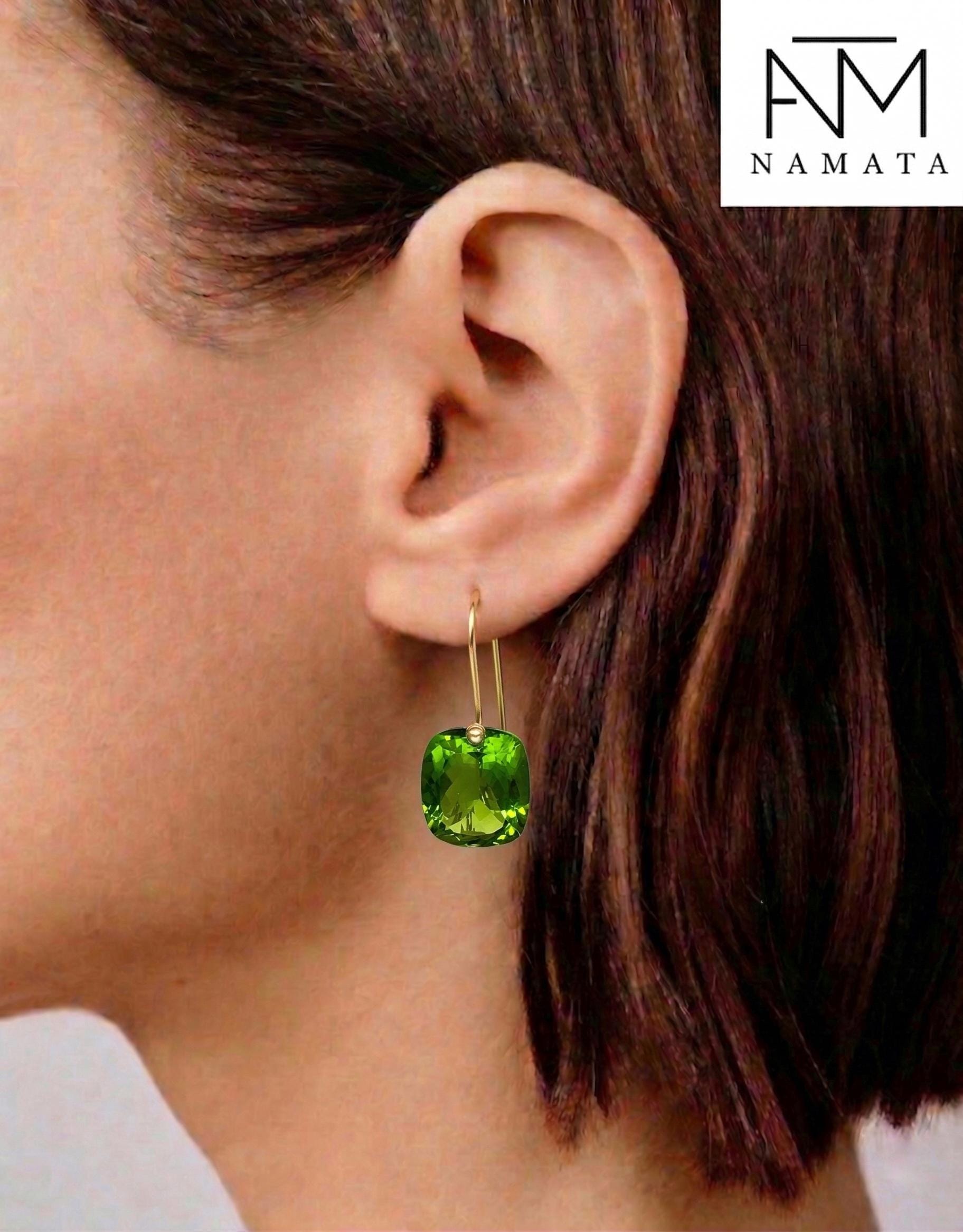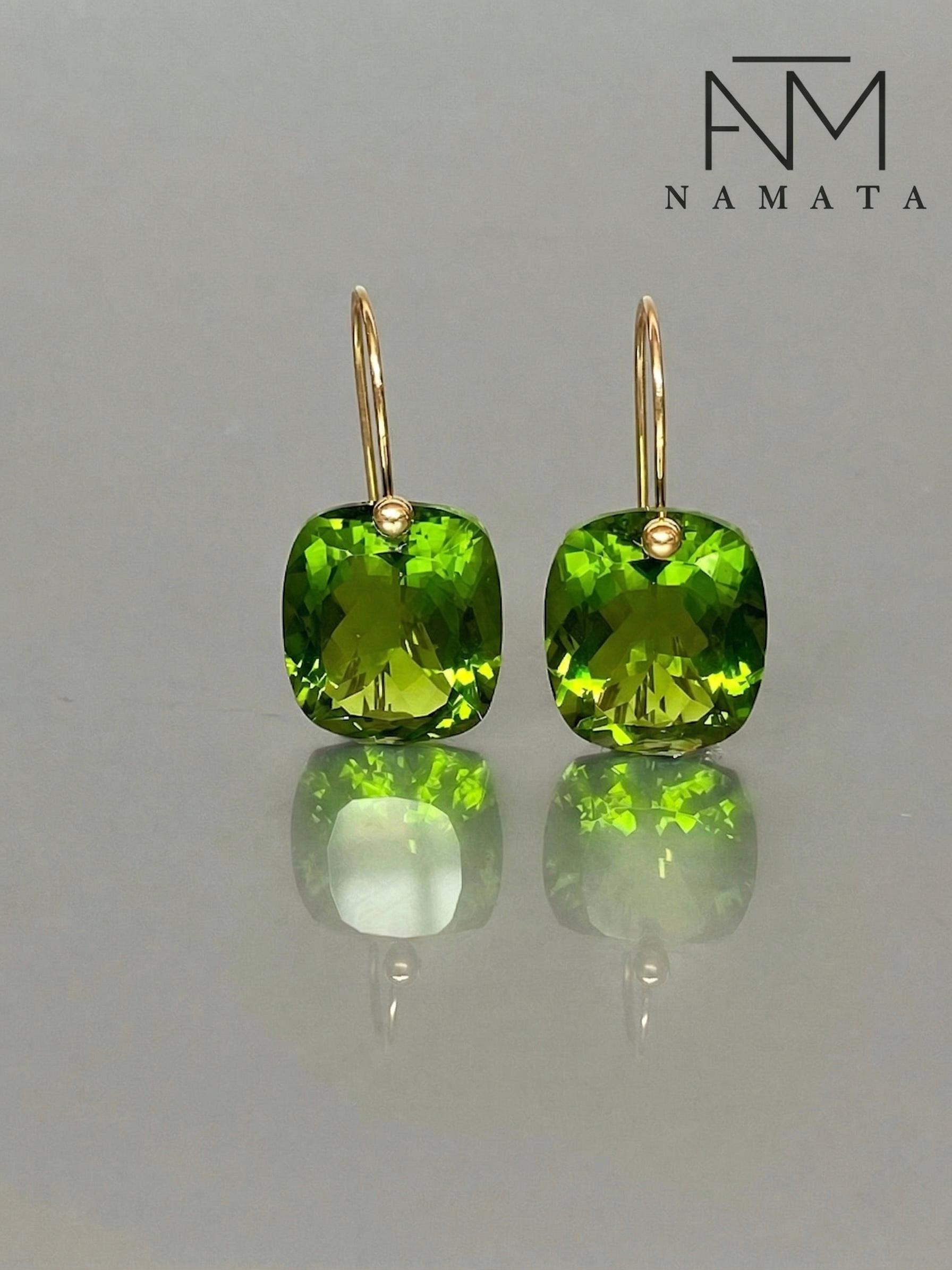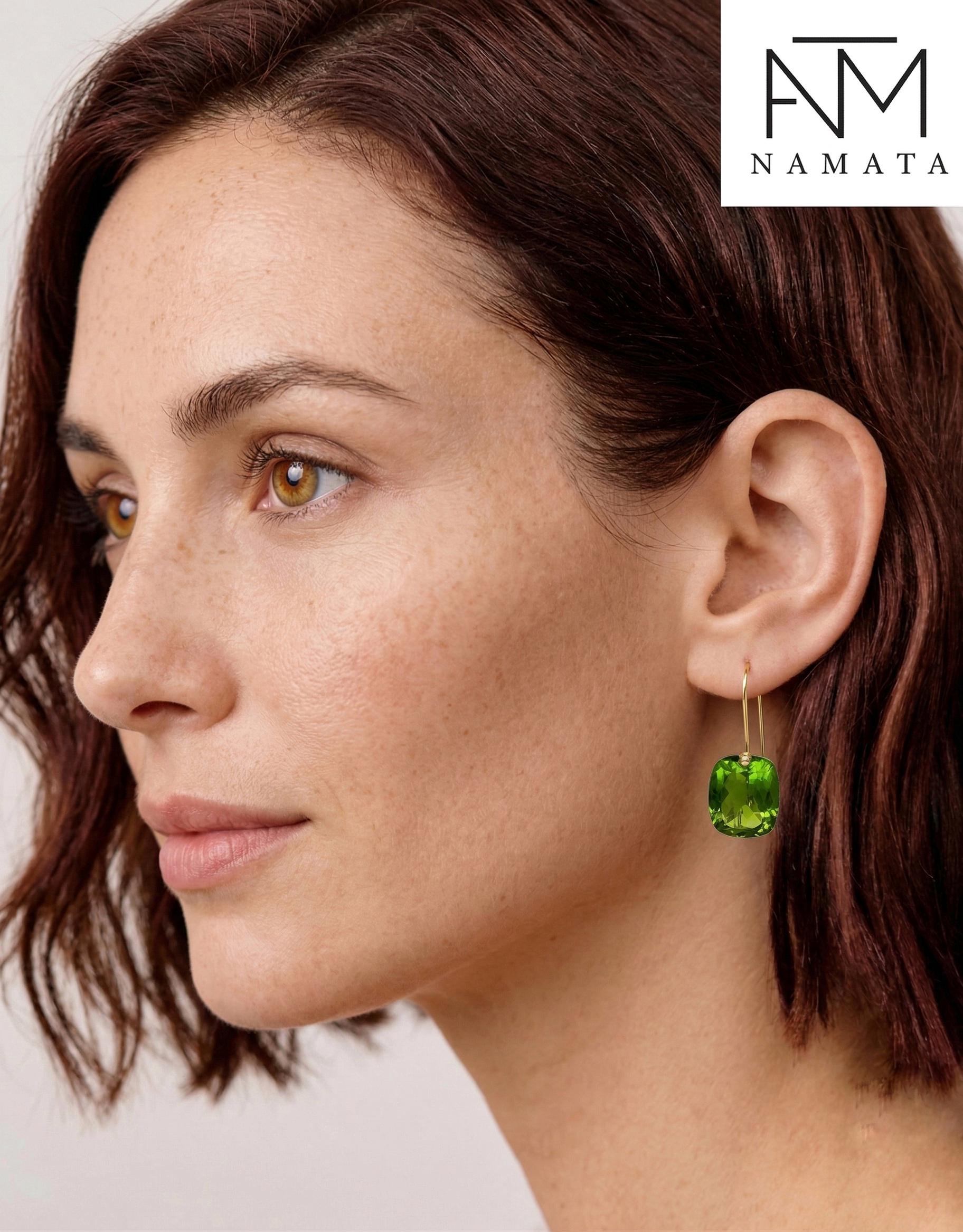 Gorgeous Peridot drop earrings. The rectangle shape drops are flawless and have a beautiful clear deep green color. The drops are attached to 24K Gold Vermeil/14K SOLID GOLD ear wires. The earrings are elegant, make a statement, and have a lux look.
