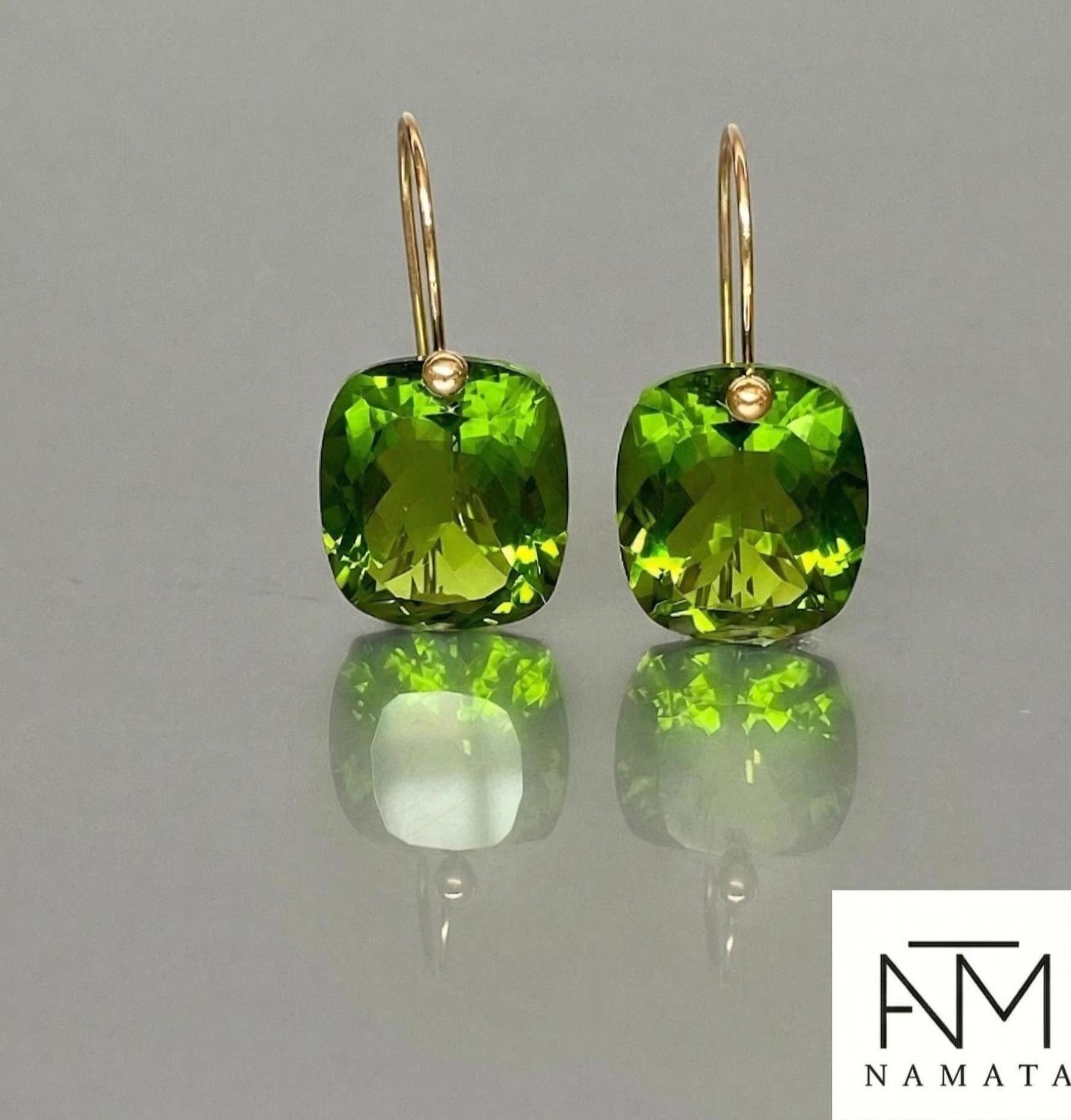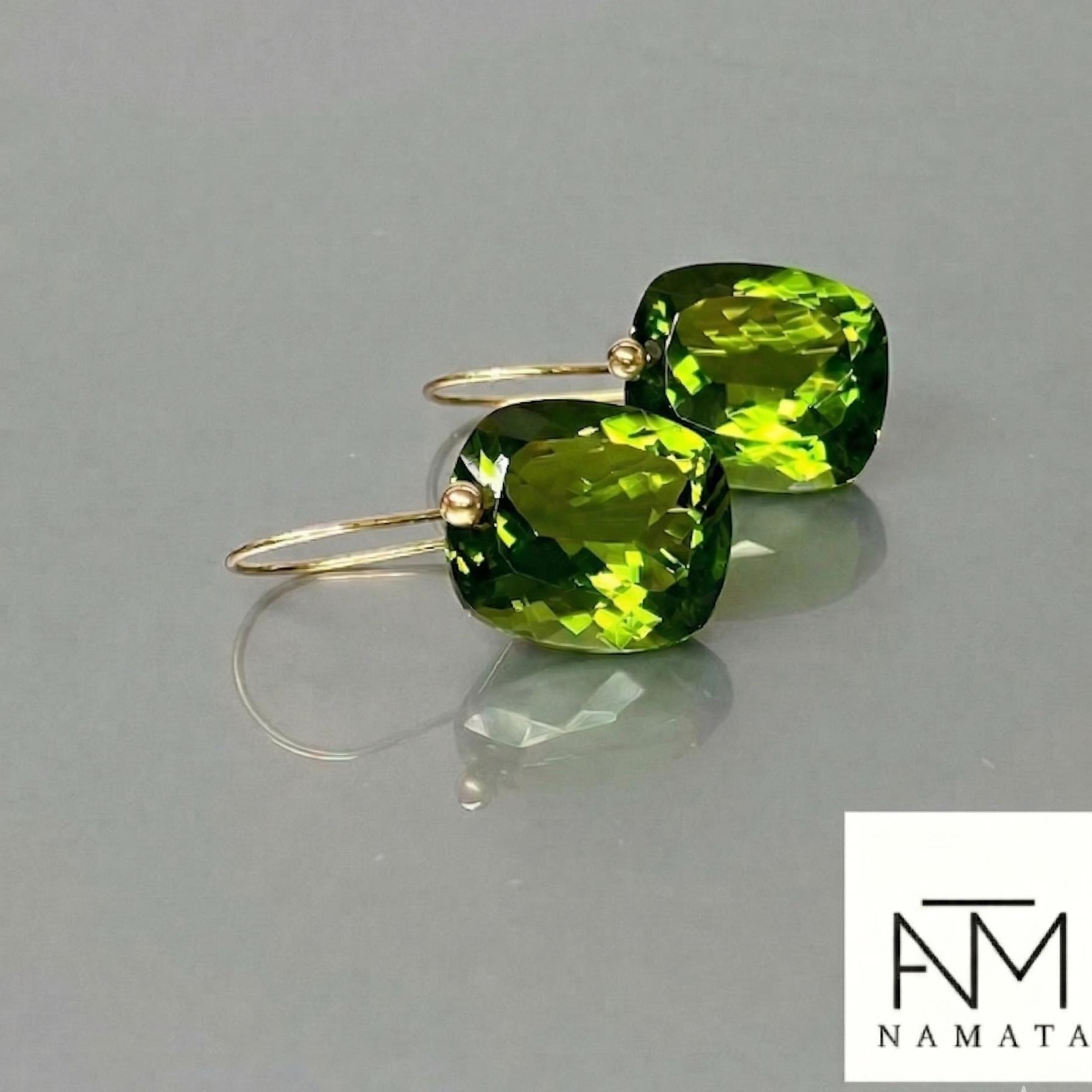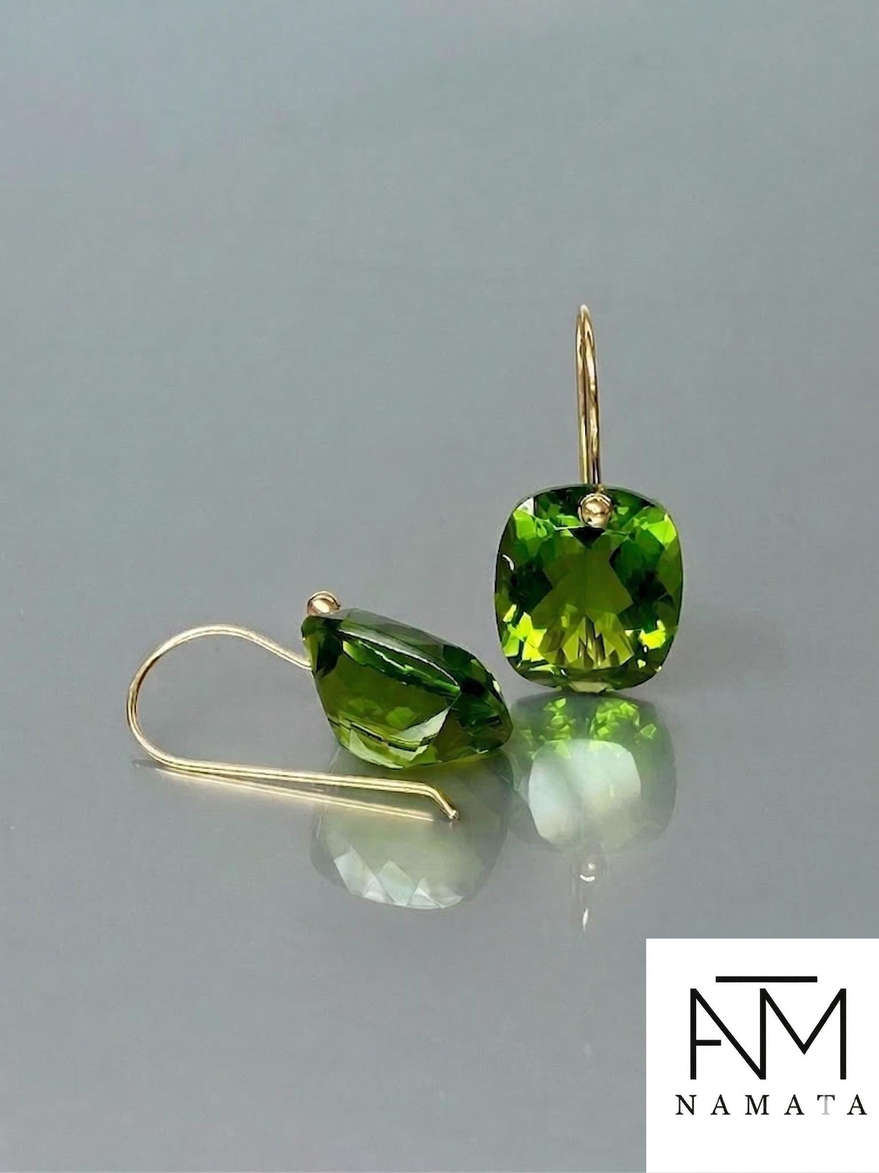 Gorgeous Peridot drop earrings. The rectangle shape drops are flawless and have a beautiful clear deep green color. The drops are attached to 24K Gold Vermeil/14K SOLID GOLD ear wires. The earrings are elegant, make a statement, and have a lux look.