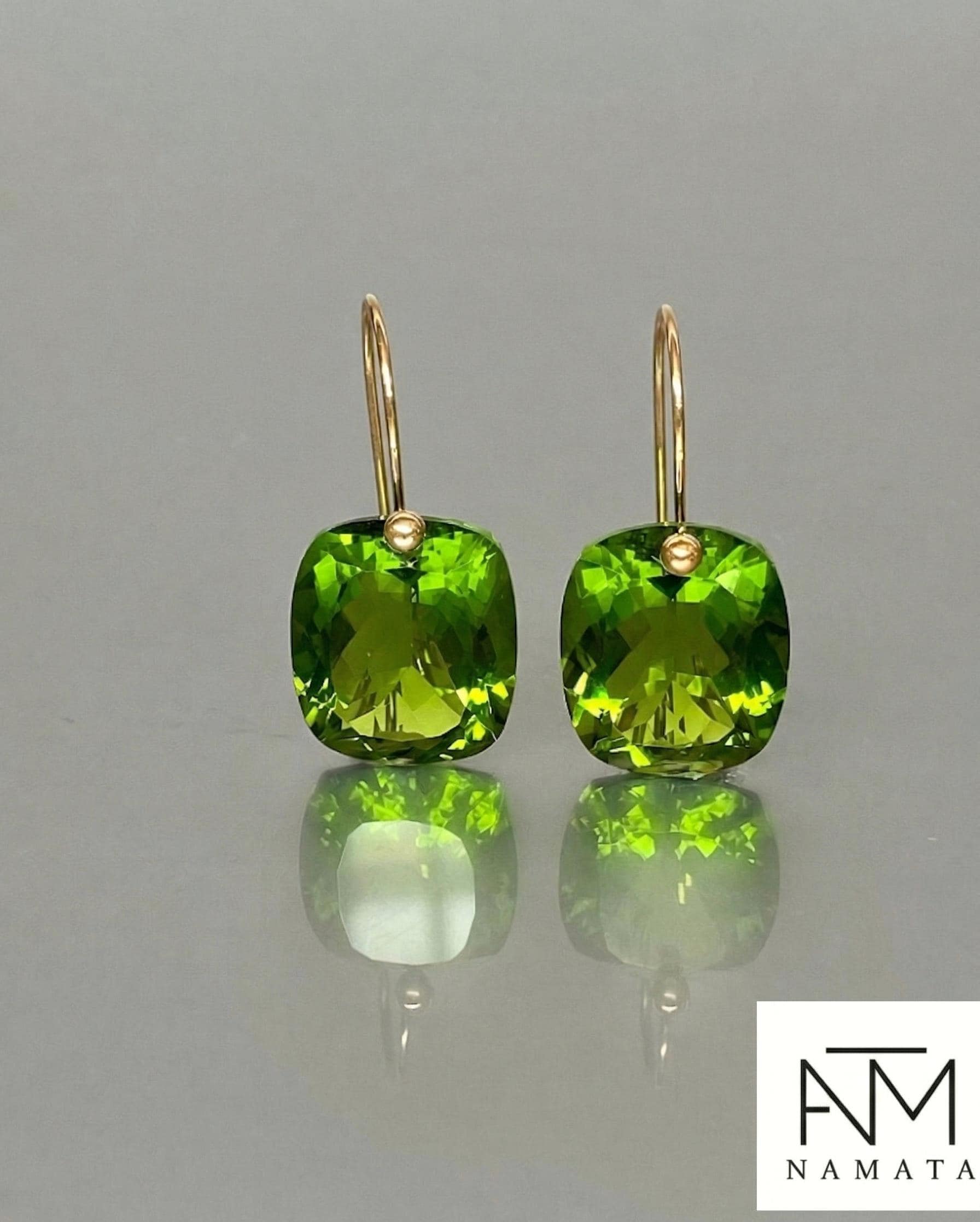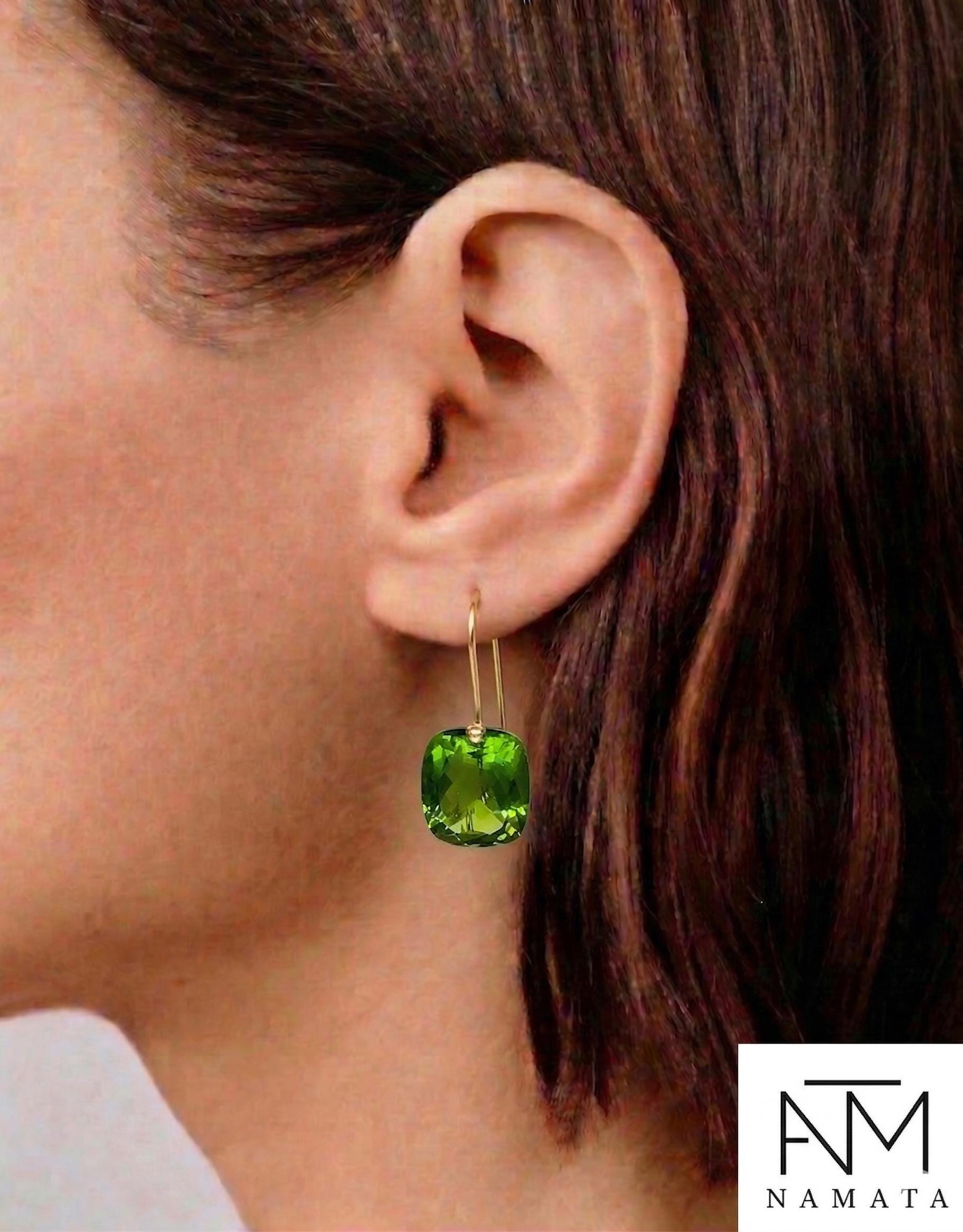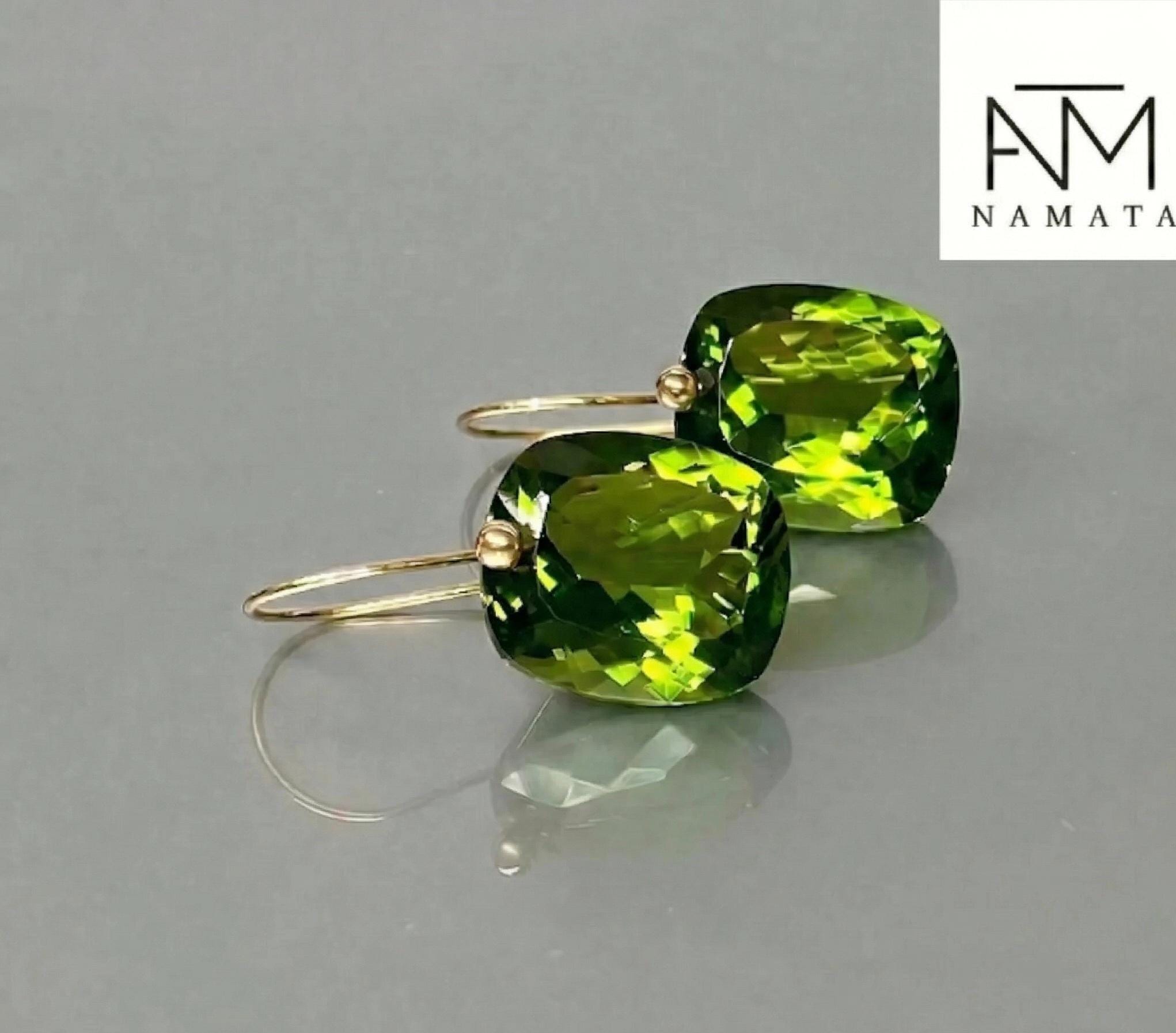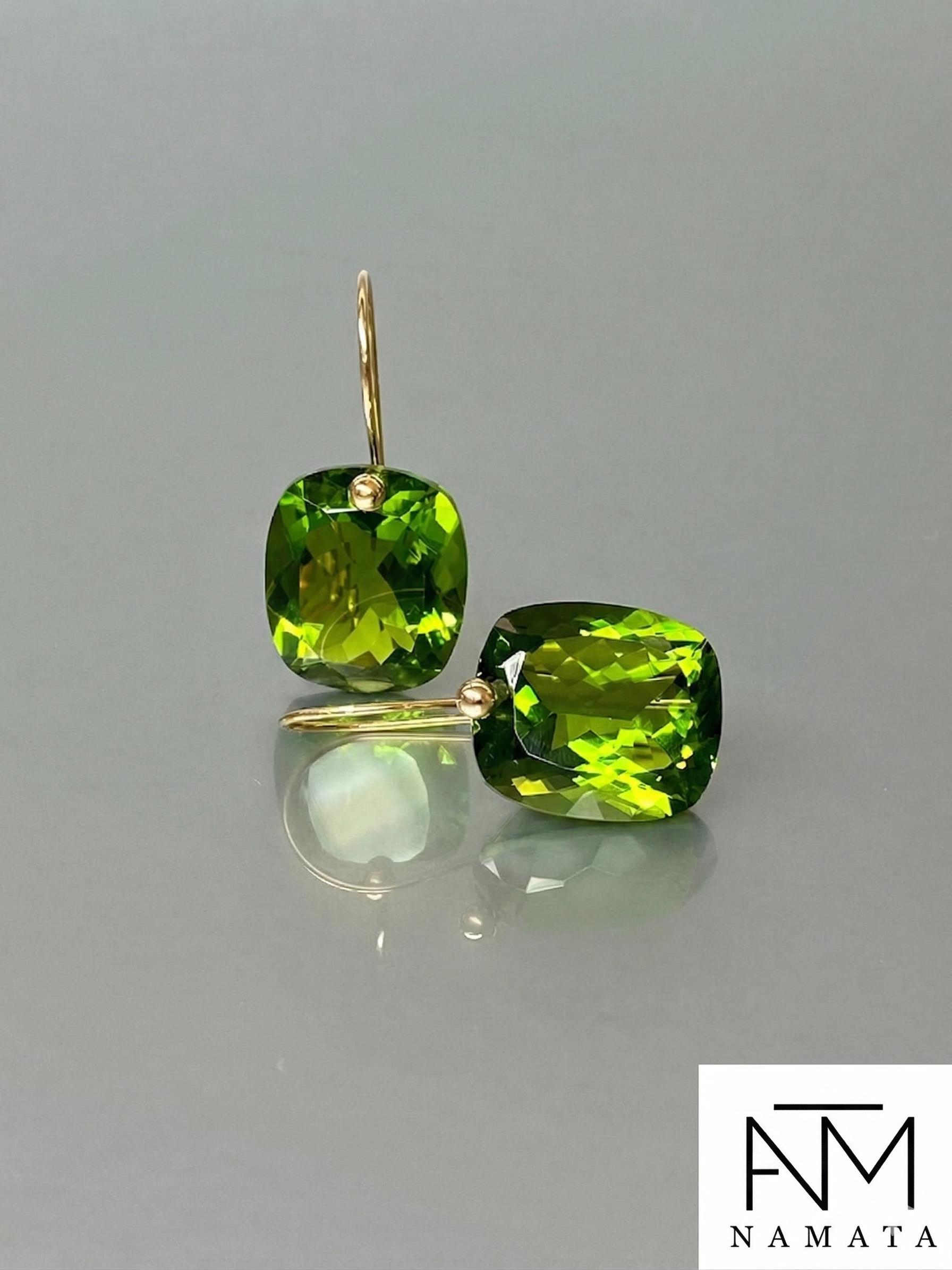 Gorgeous Peridot drop earrings. The rectangle shape drops are flawless and have a beautiful clear deep green color. The drops are attached to 24K Gold Vermeil/14K SOLID GOLD ear wires. The earrings are elegant, make a statement, and have a lux look.