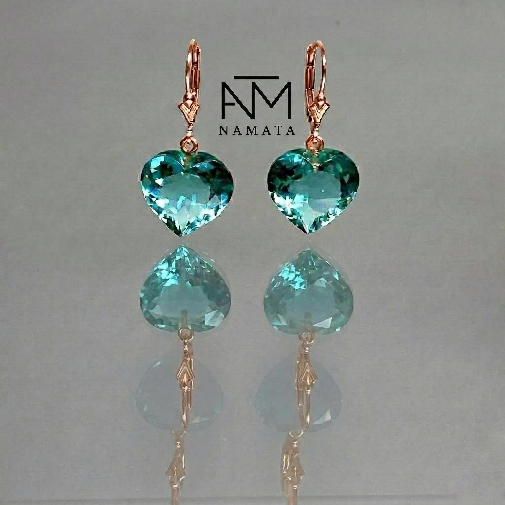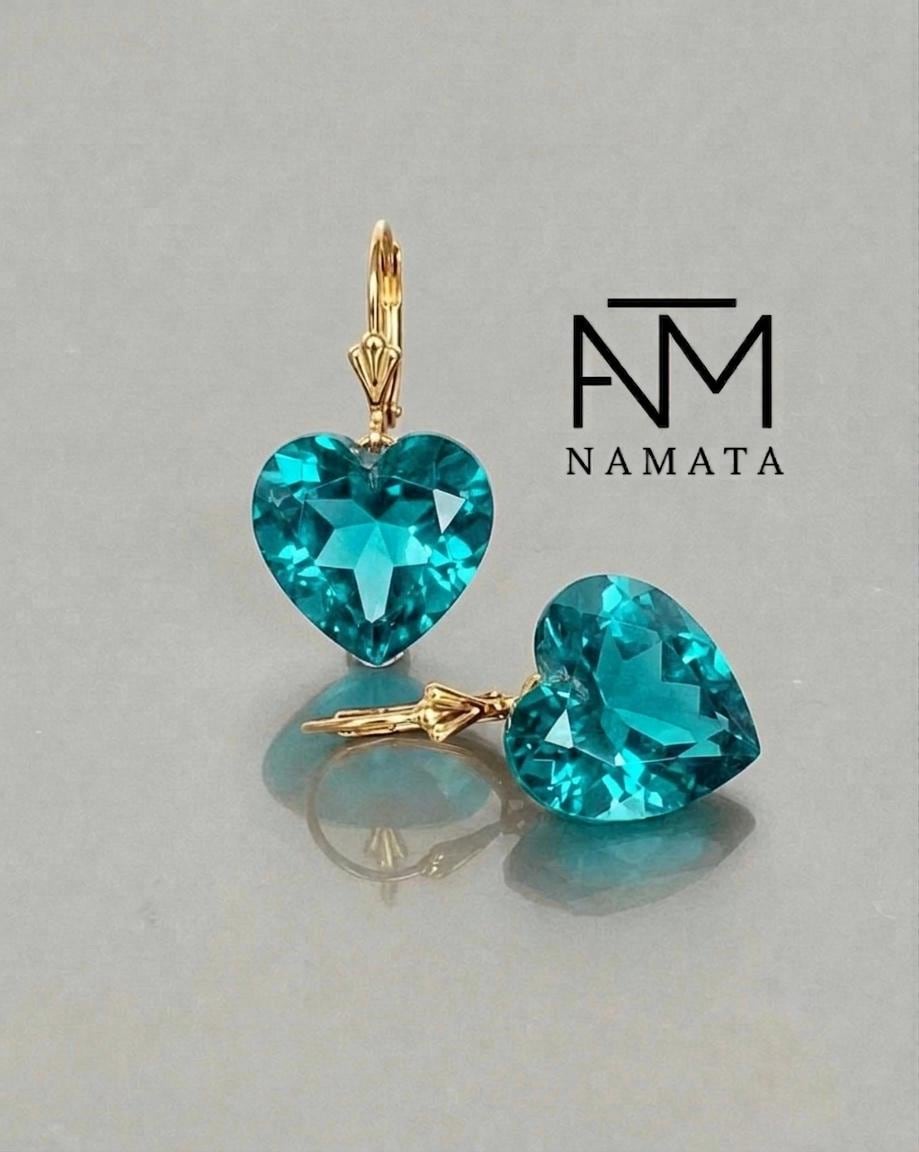 Featuring stunning heart-shaped gemstones in a vibrant blue-green hue, these earrings capture the rare, luminous glow that makes paraiba tourmaline so unique and sought after. The faceted stones reflect light beautifully, creating a radiant sparkle full of depth and brilliance.