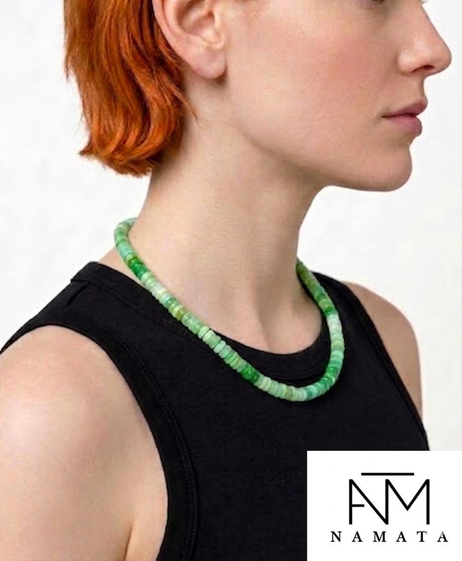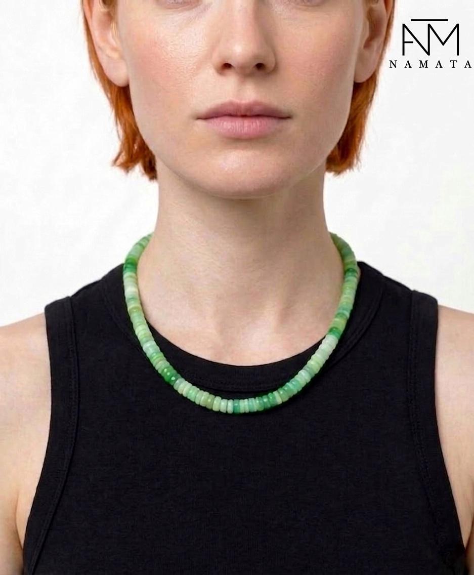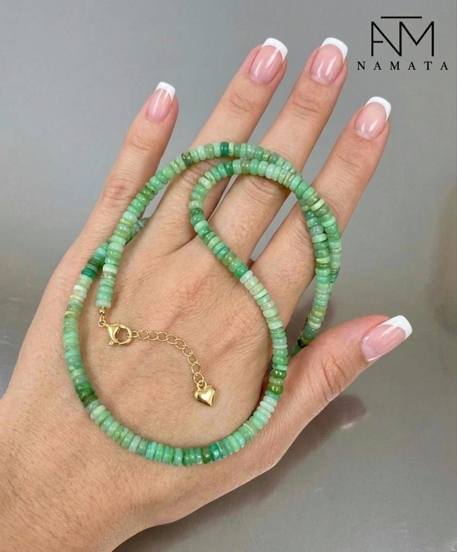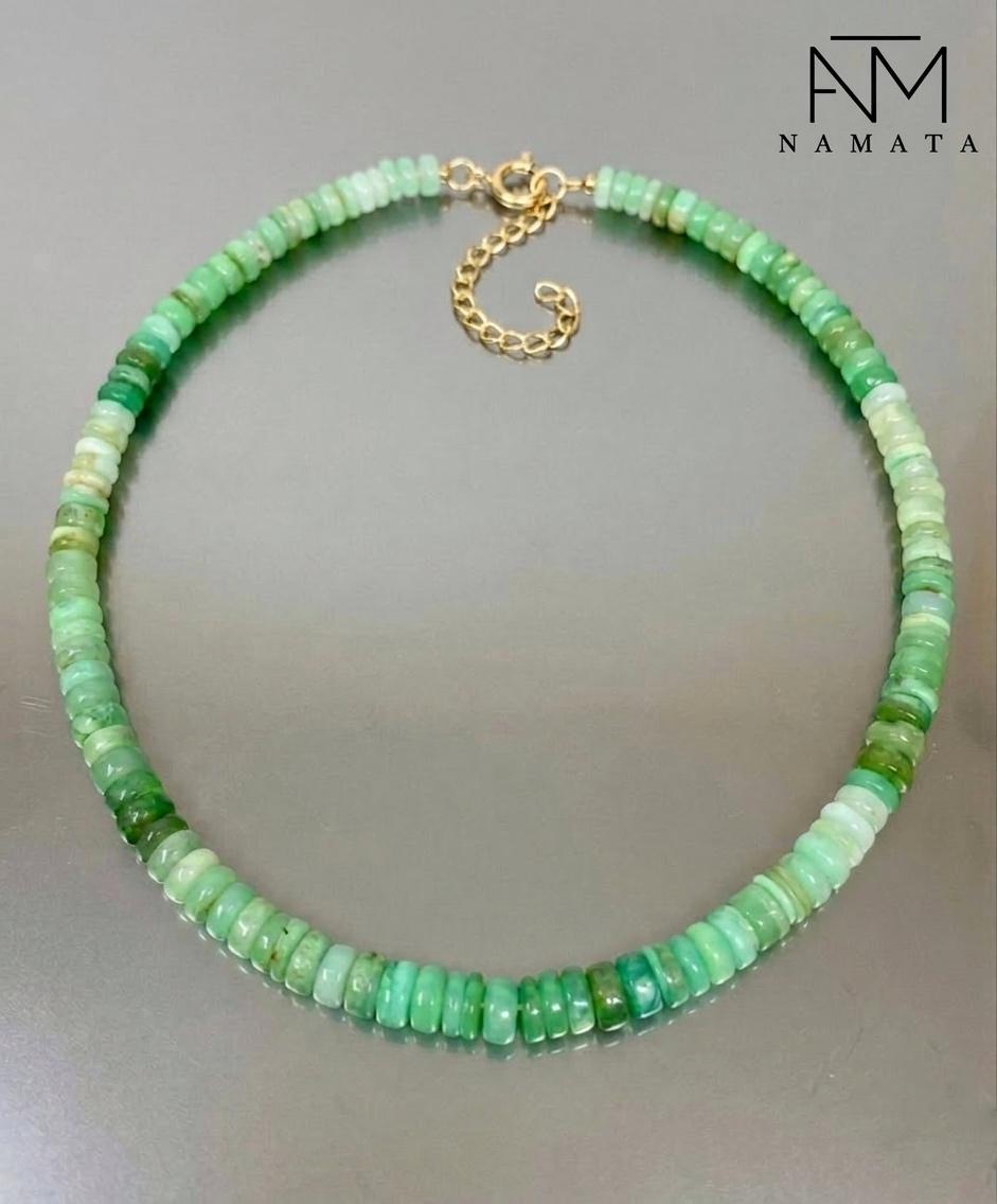 Gorgeous Chrysoprase necklace, featuring beautiful, natural green Chrysoprase smooth rondelle beads of excellent quality. The vibrant green beads are meticulously finished with a secure 14K gold-filled clasp, making this necklace a perfect piece for any occasion.