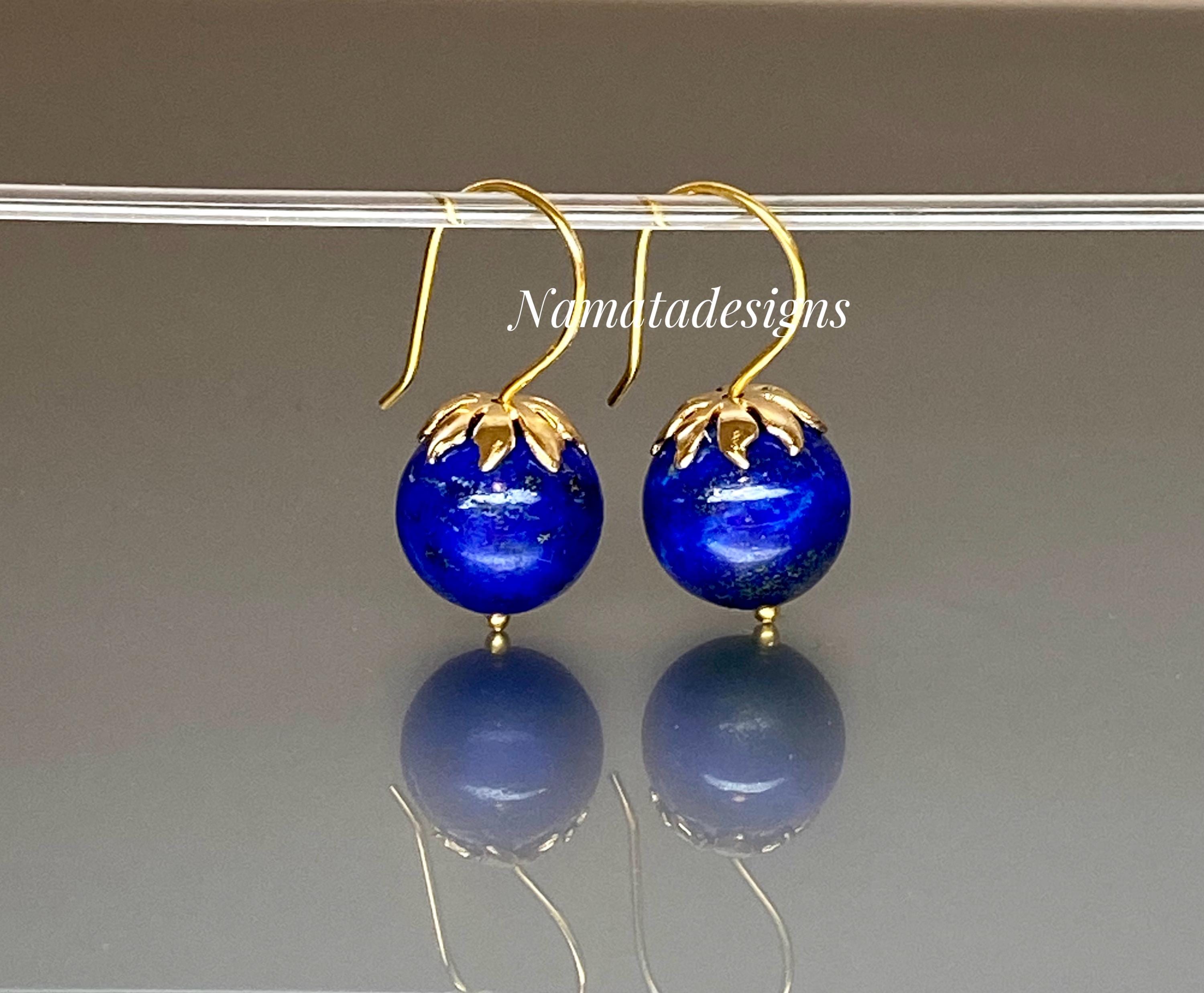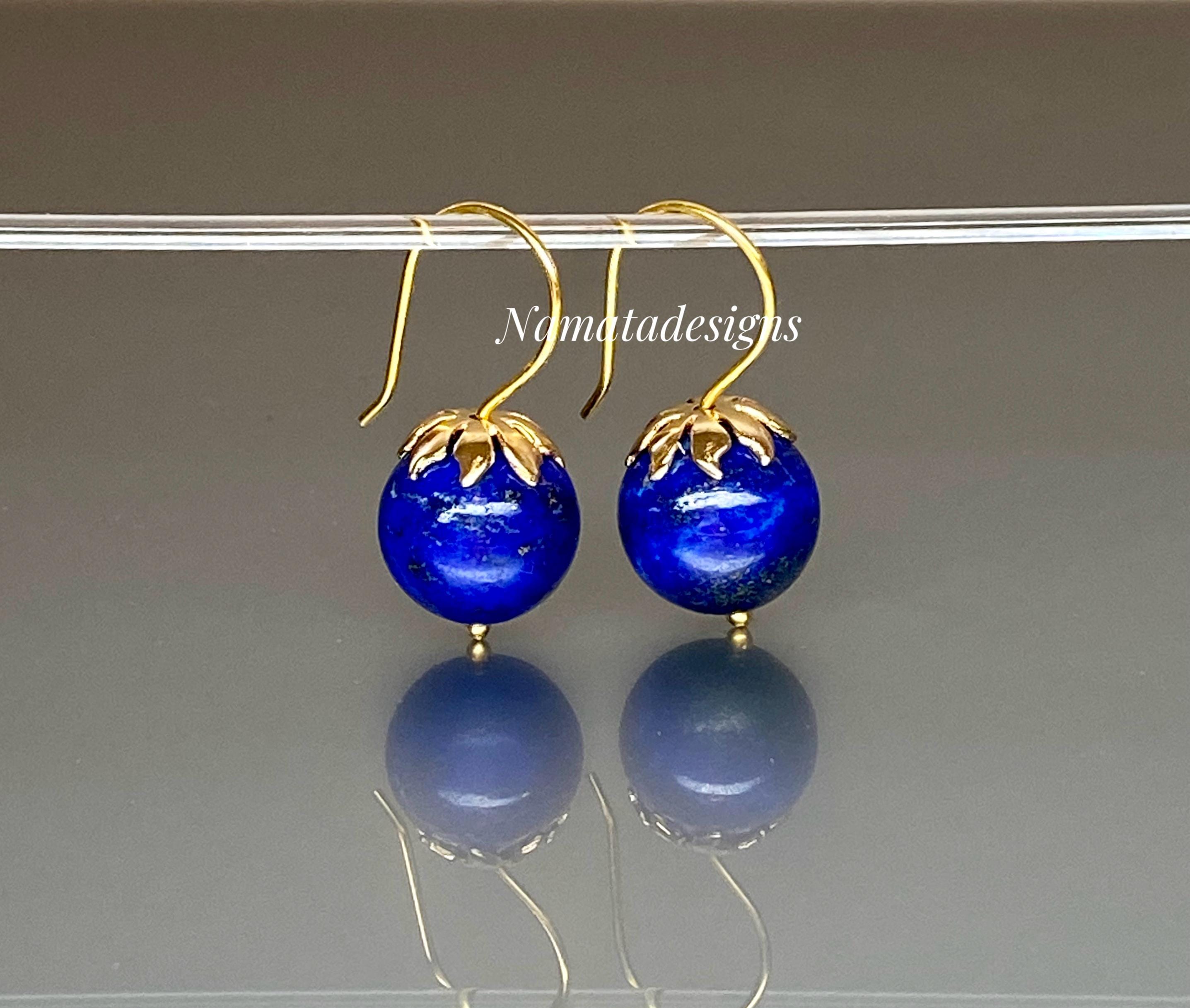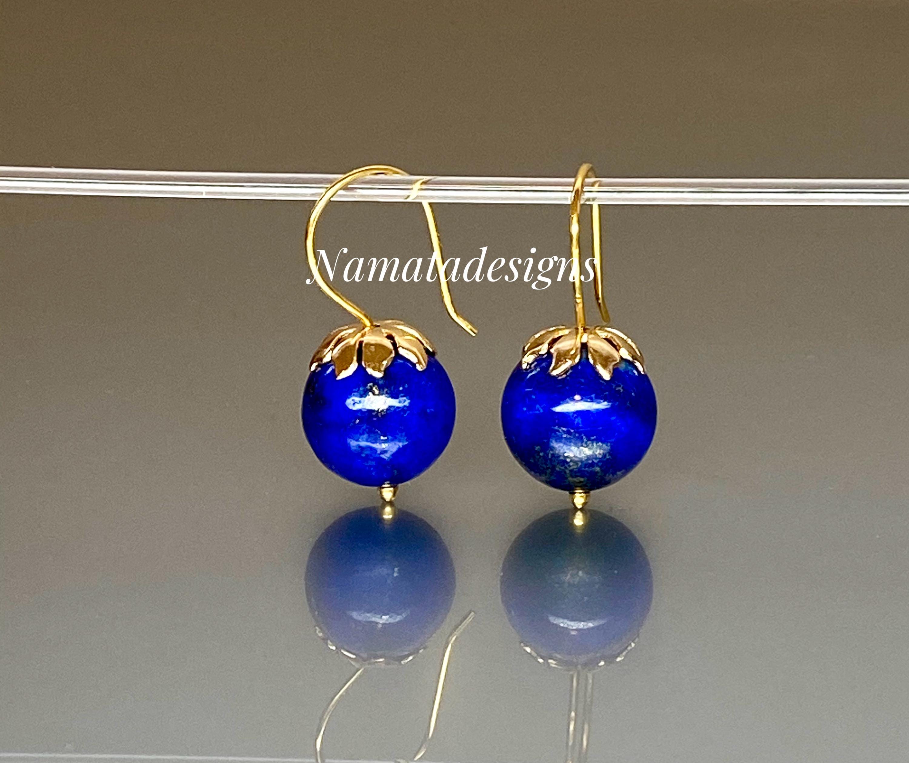 Beautiful vibrant and high-grade lapis lazuli globe earrings. The 12.5 mm lapis lazuli globes have a gorgeous deep vibrant royal blue color that shows celestial flecks of golden pyrite in the stone.