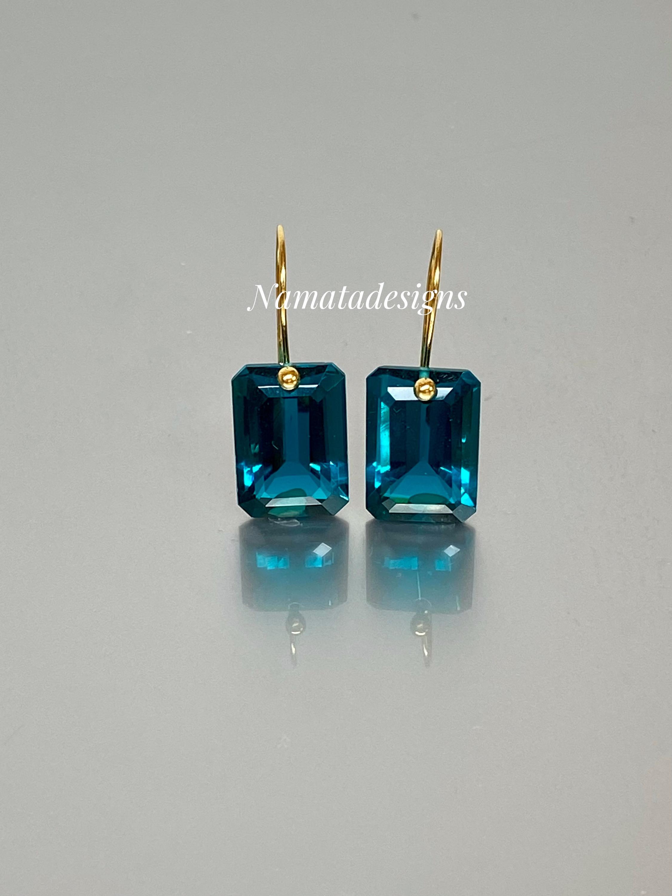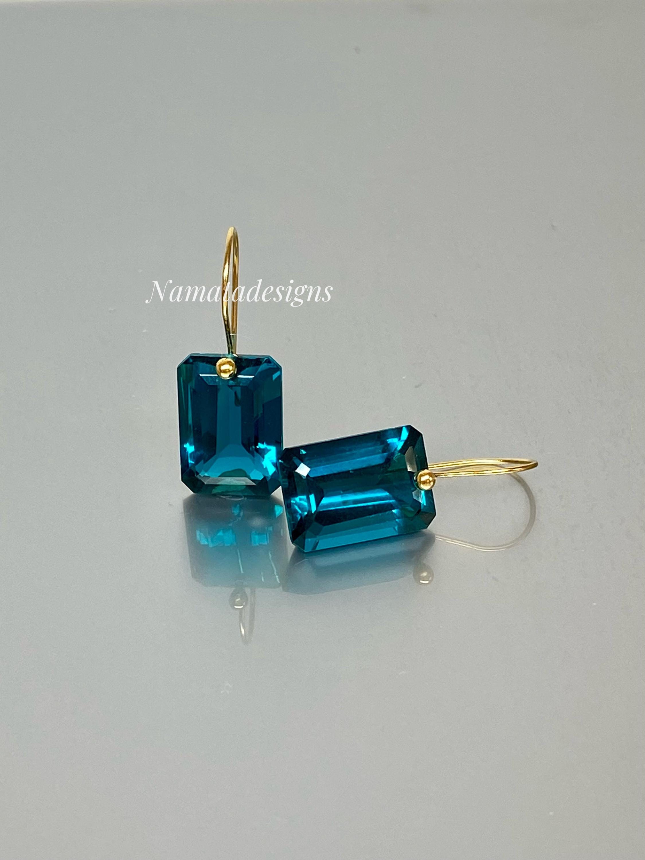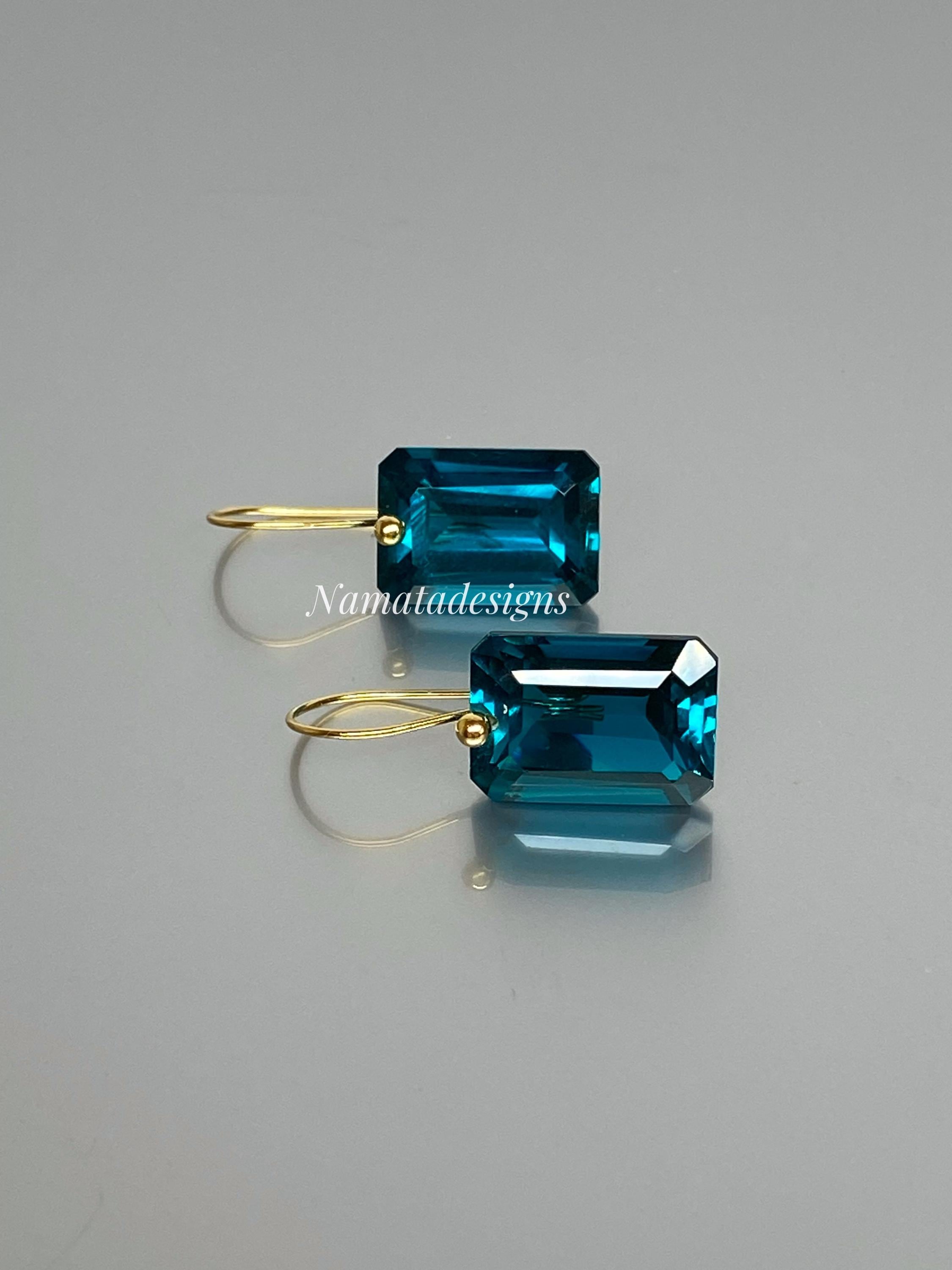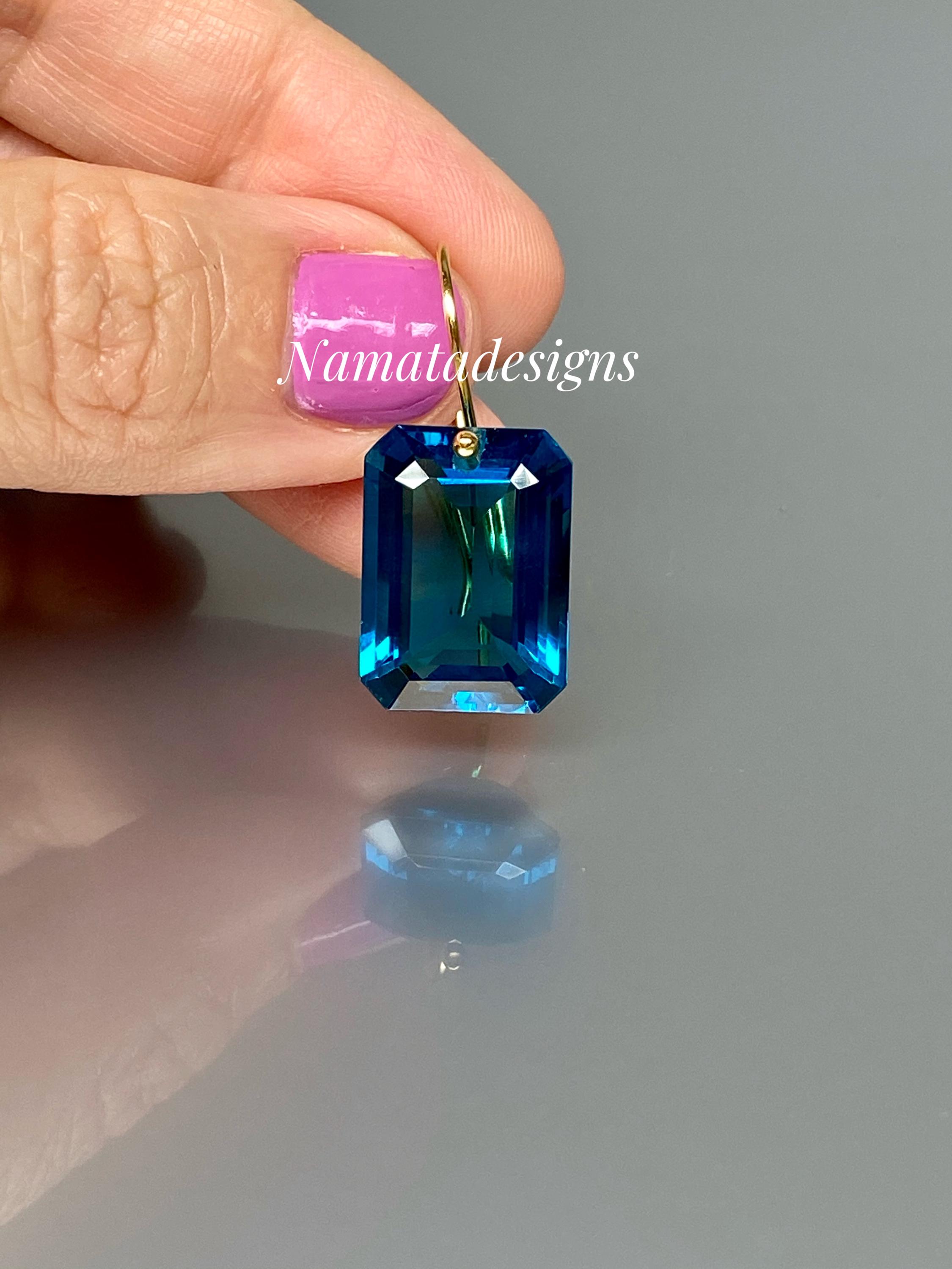 These elegant earrings feature faceted rectangular London Blue Topaz drops in a rich, deep blue hue. The stones are flawless, eye-clean, and shine with a luxurious glow.