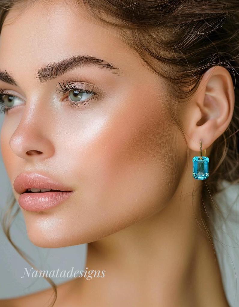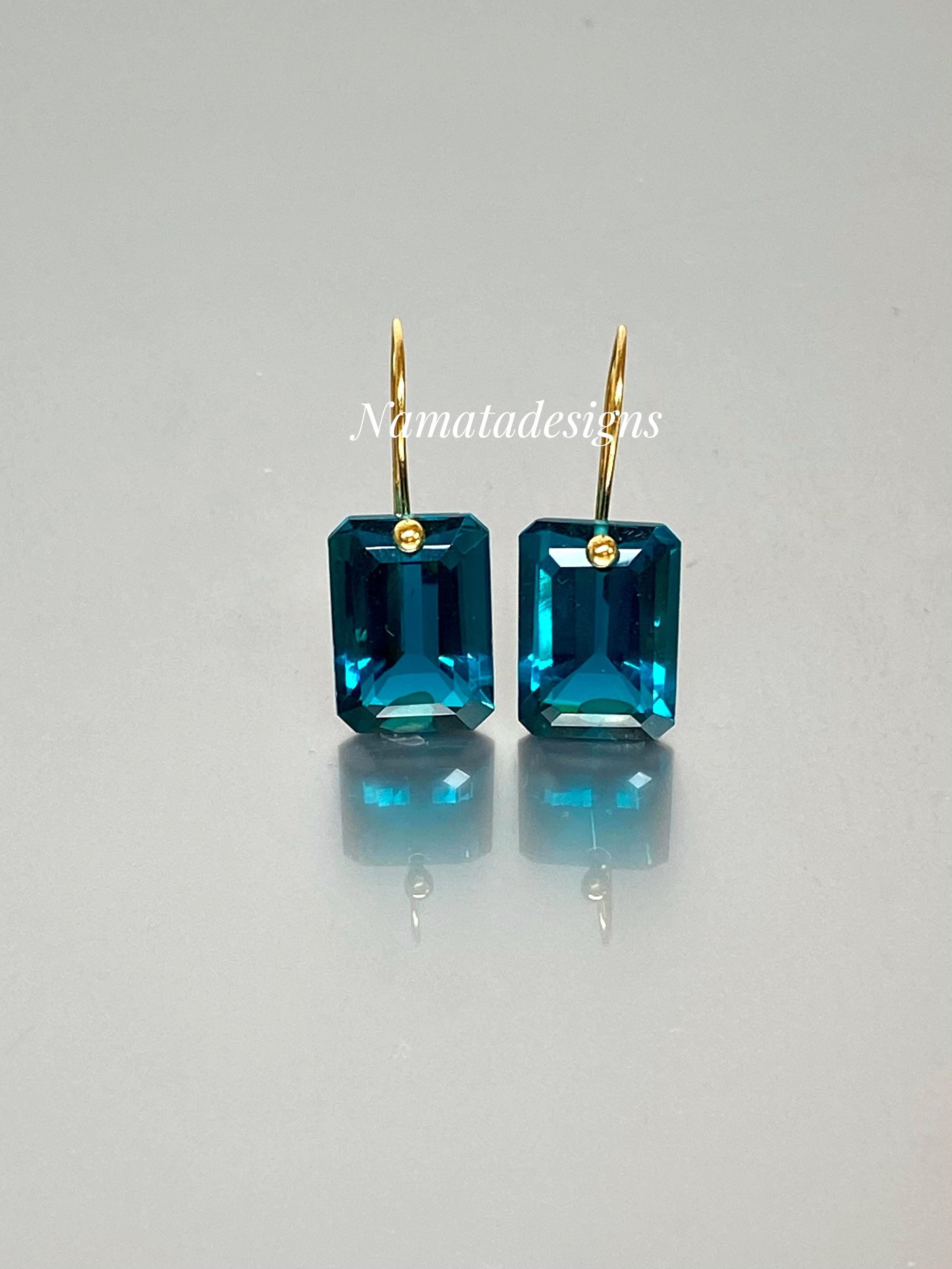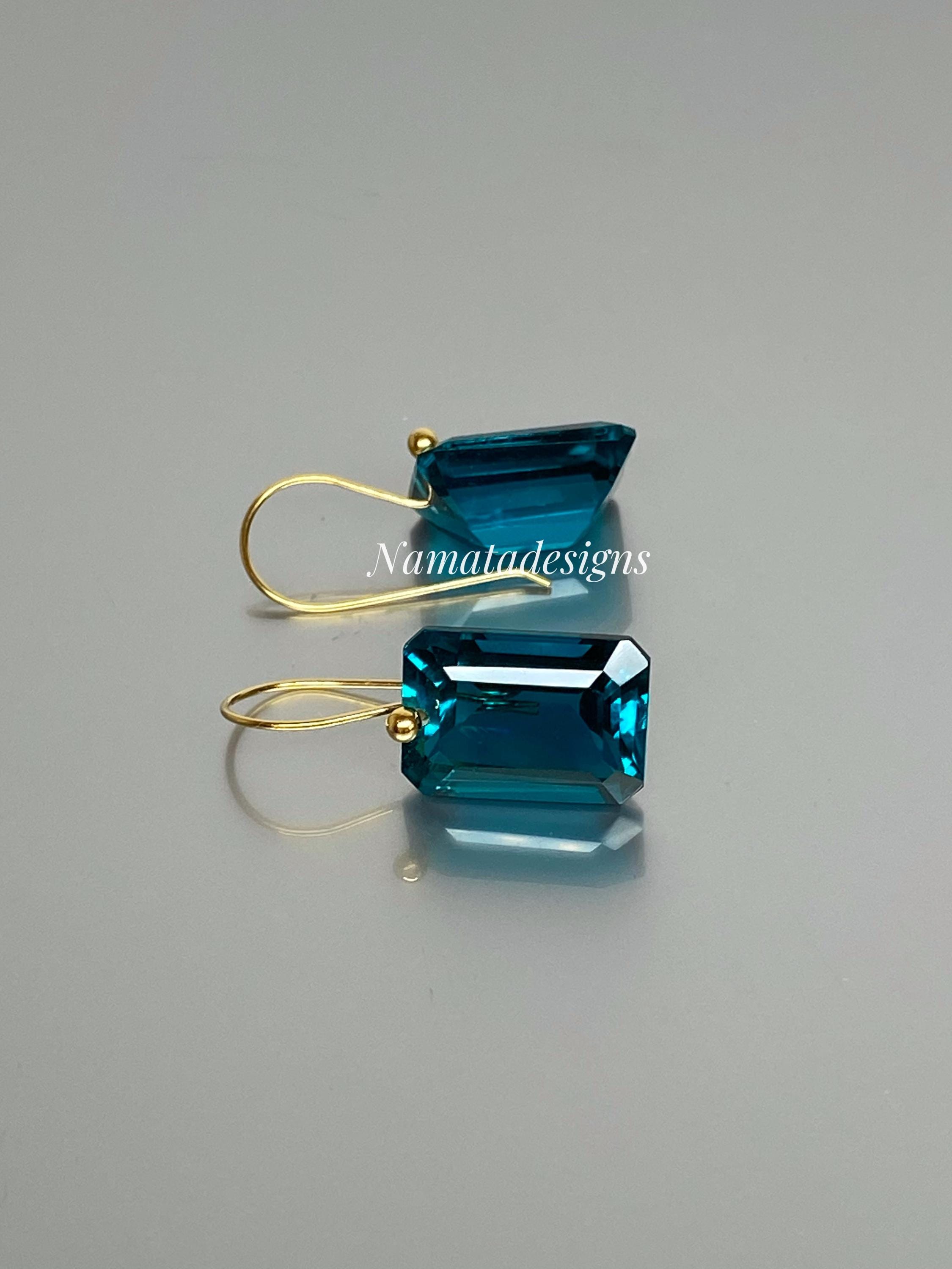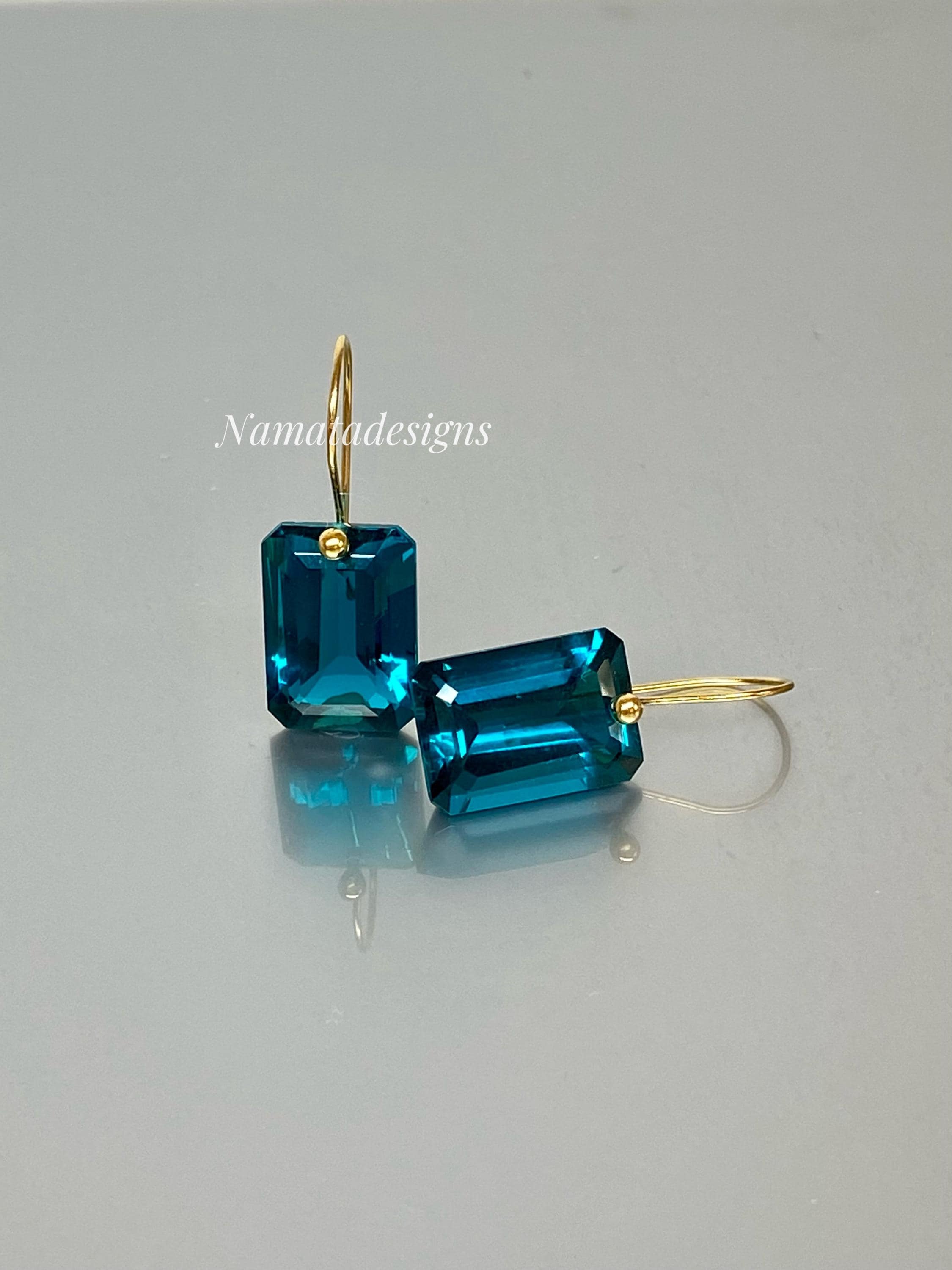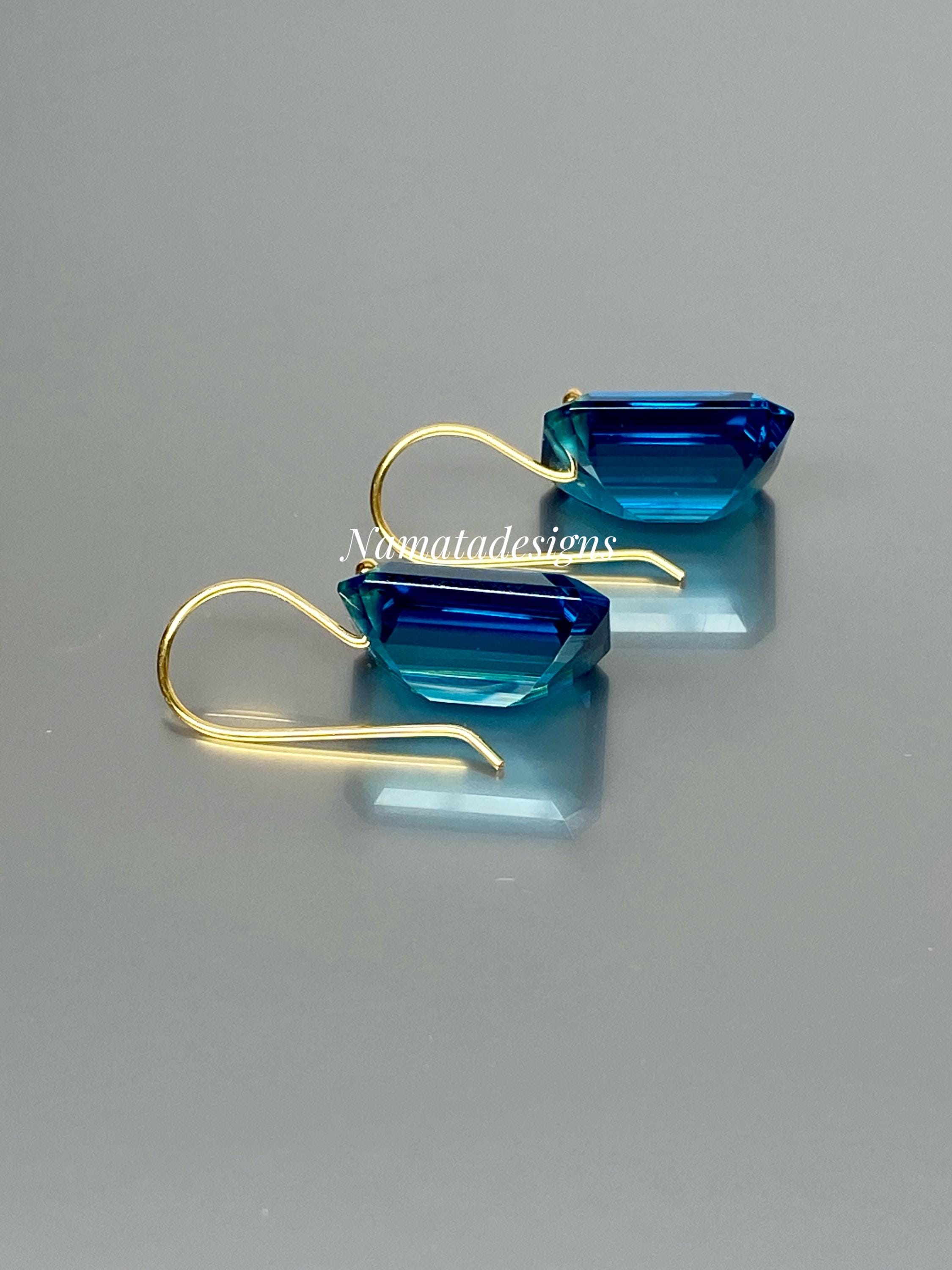 The faceted rectangular drops sparkle in rich, deep blue tones — clean, flawless, and full of light. Their sleek shape and bold color make them a beautiful statement piece.