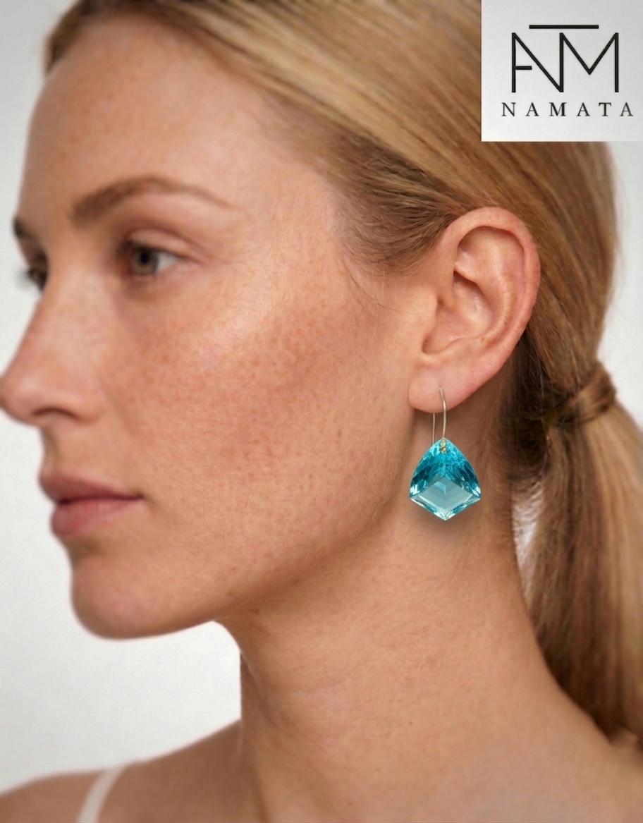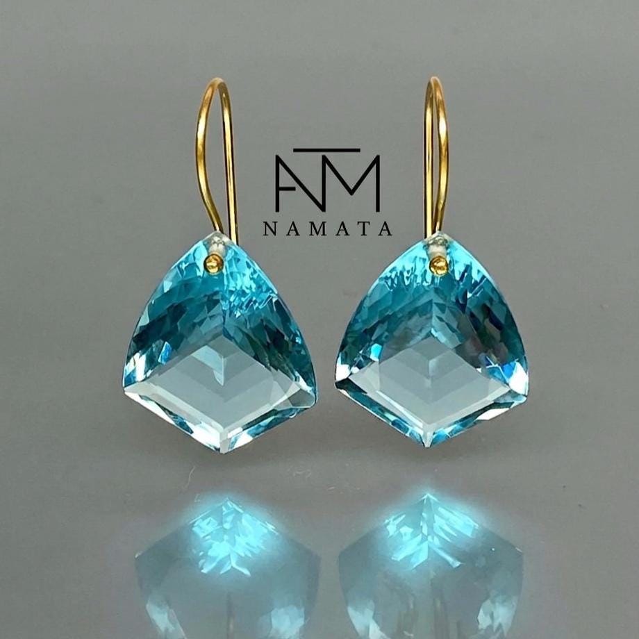 Gorgeous sparkly sky blue aquamarine earrings. The Faceted shield shape drops are flawless and have a beautiful sky-blue color. The drops are attached to vermeil on sterling ear wires. The earrings are elegant and have a lux look.
