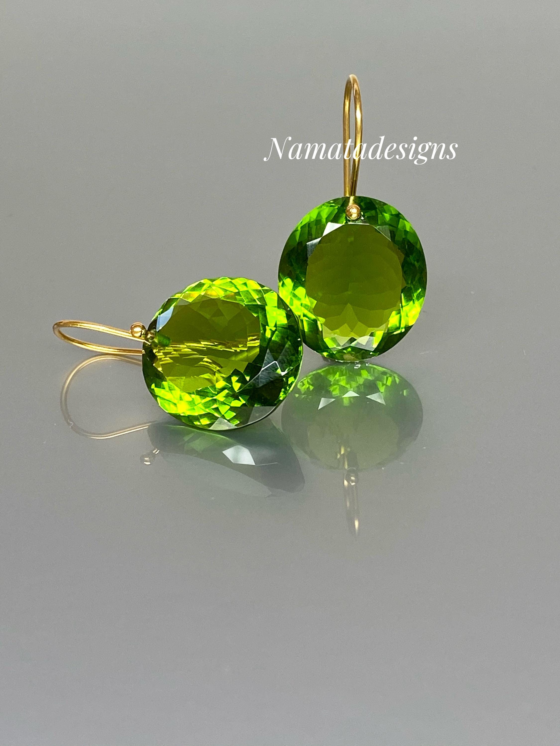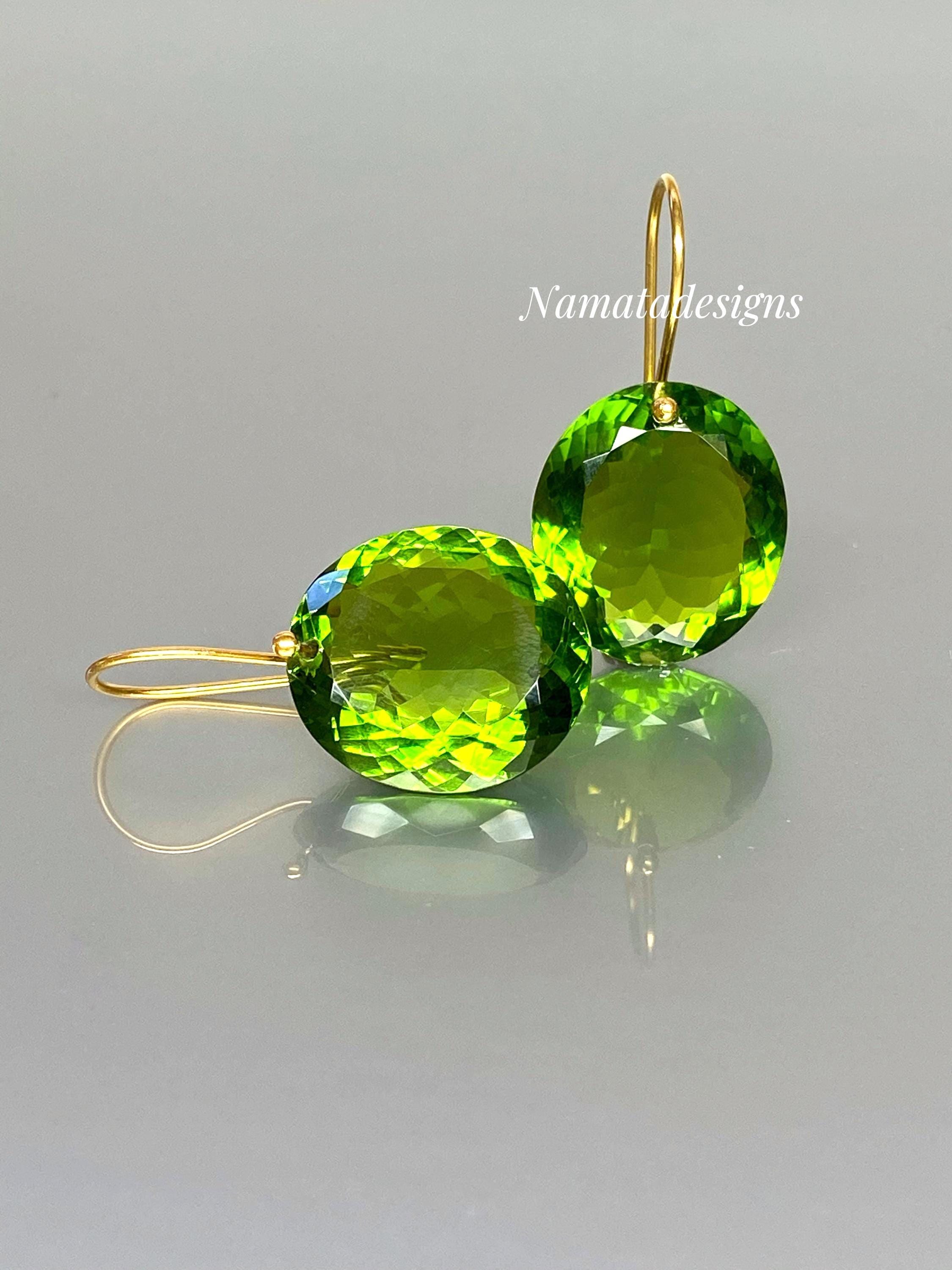 Exquisite sparkly peridot drop earrings that enchant the eye. The flawlessly faceted oval drops are not only pristine but also radiate a beautiful deep green color, captivating all who behold them. These ultra-fine oval drops are delicately suspended from ear wires crafted in 14K SOLID GOLD, adding a touch of opulence to their elegant and minimalist design.