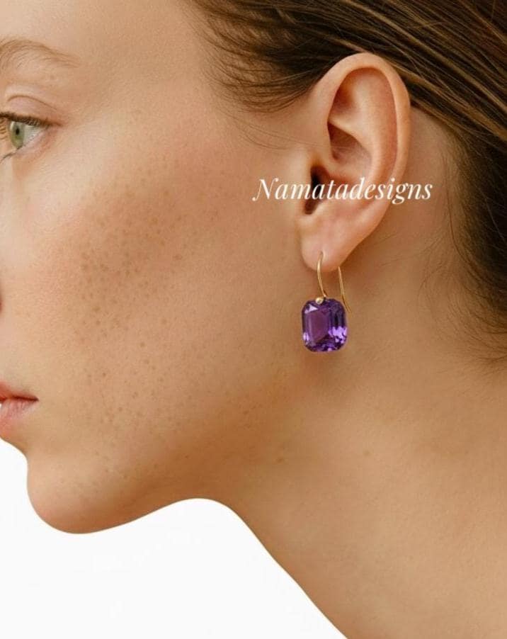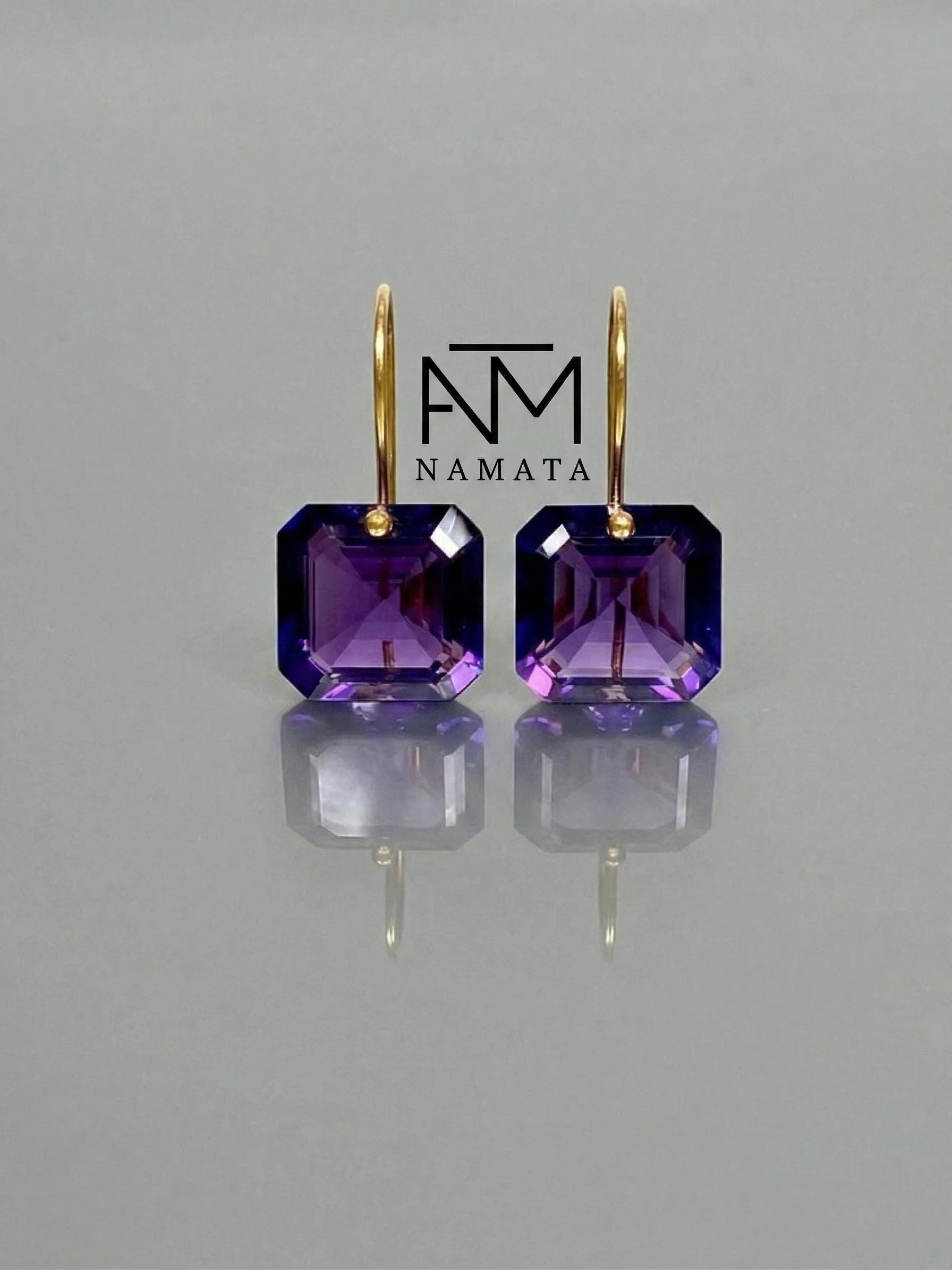 Gorgeous sparkly purple amethyst drop earrings. The Faceted square drops are flawless and eye-clean and have a beautiful vivid clear deep purple color. The drops are attached to vermeil on sterling ear wires. The earrings are elegant and have a luxurious look.