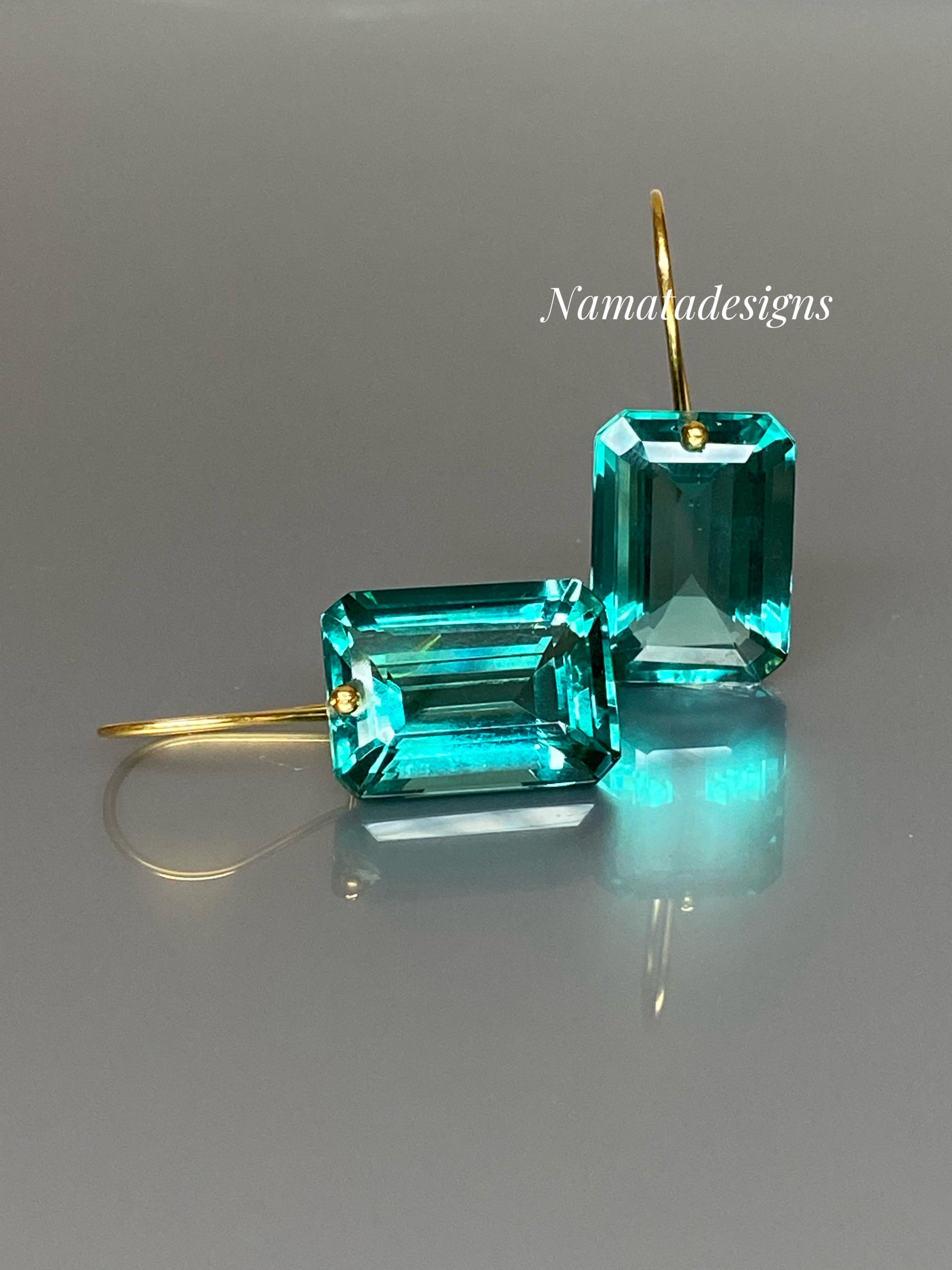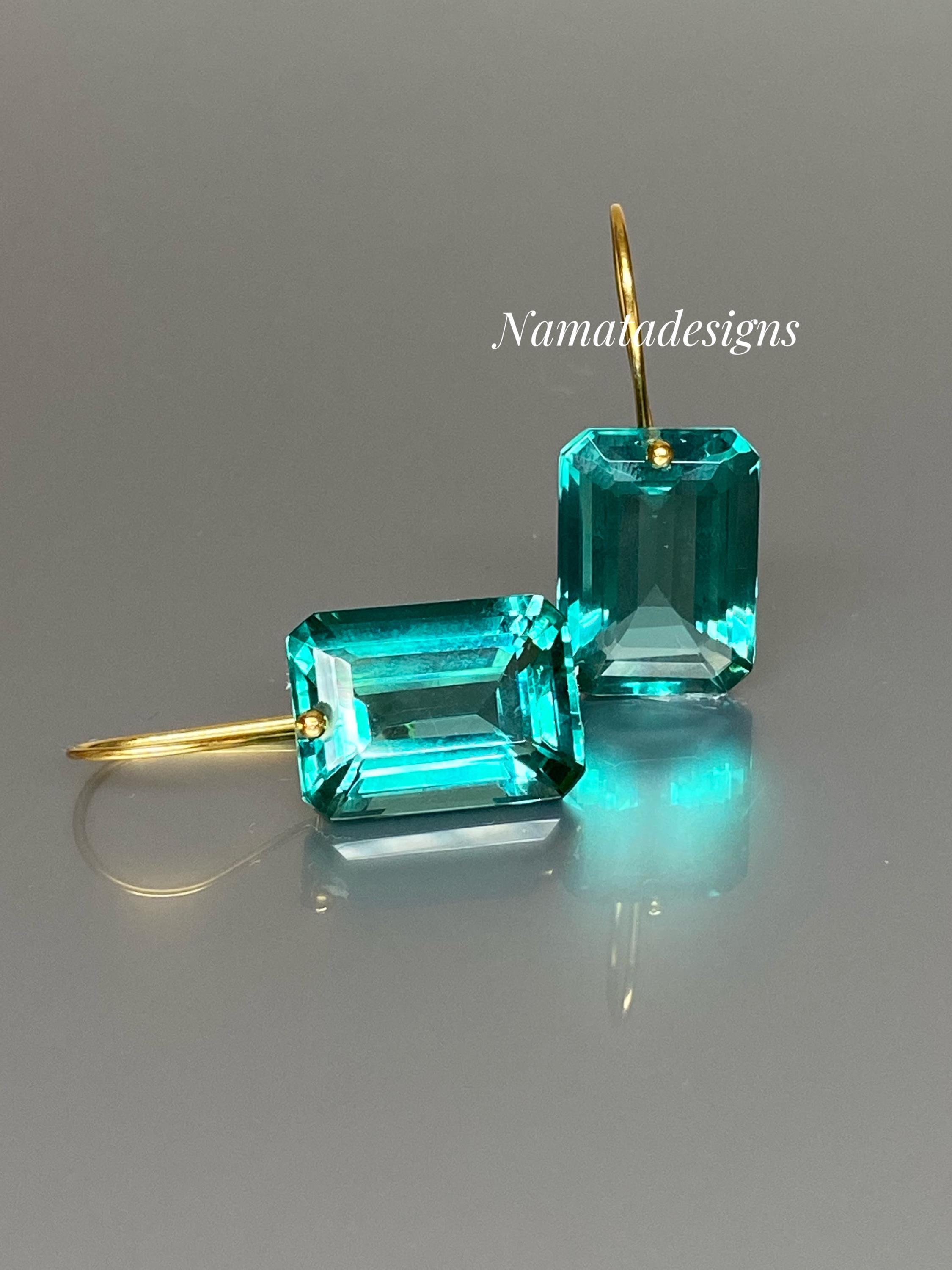 Beautiful Paraiba tourmaline earrings in Brilliant drops. The faceted rectangle drops have a gorgeous ocean blue color that brings lots of depth to the stone and reflects lights beautifully. The fancy drops are attached to 24K Gold Vermeil/ 14K SOLID GOLD ear wires.