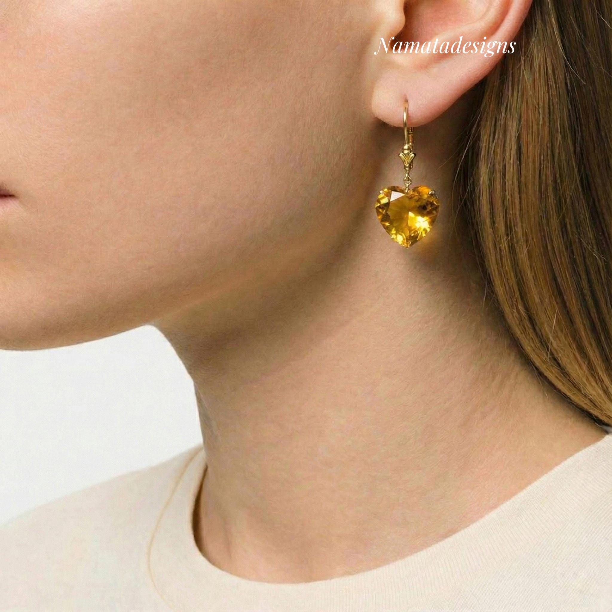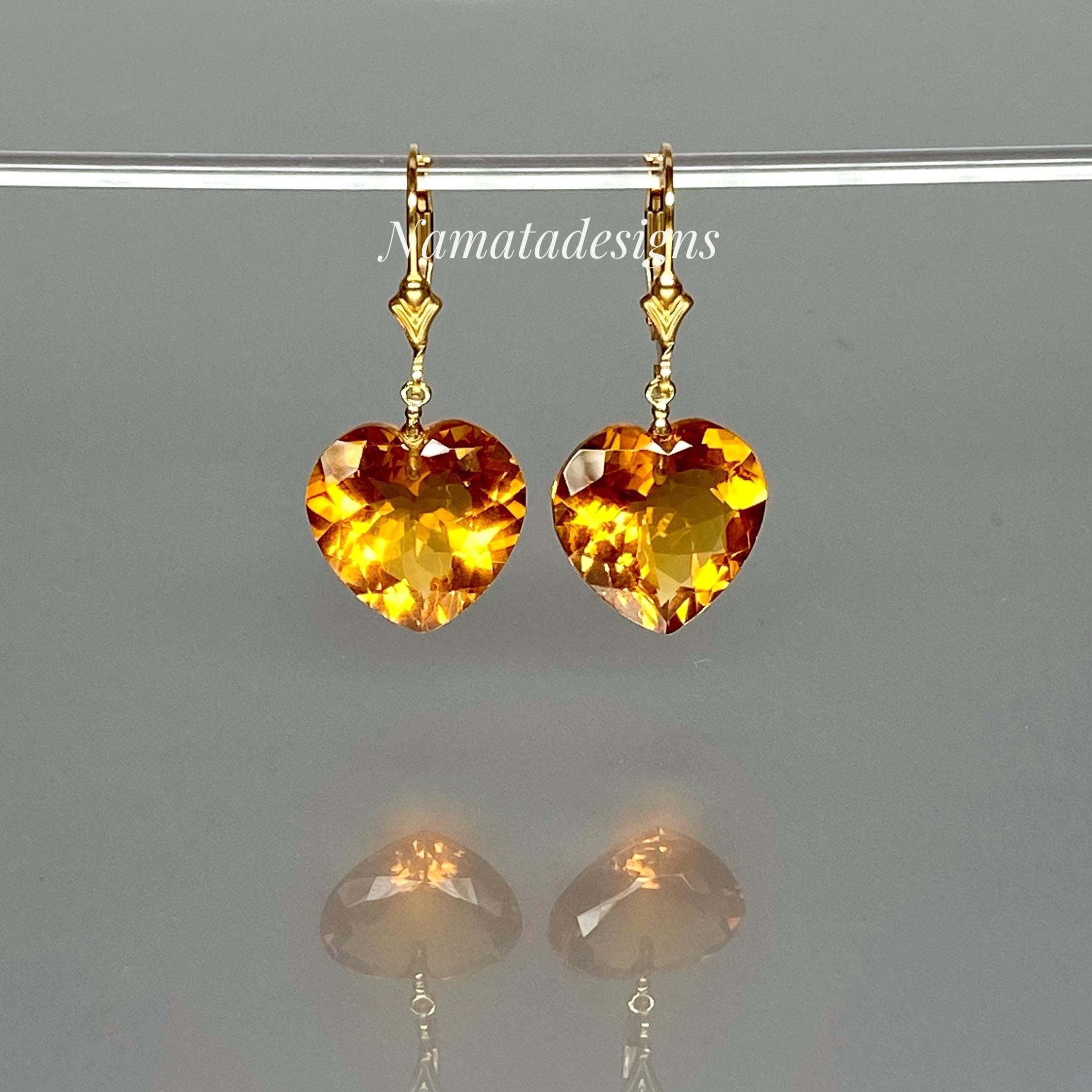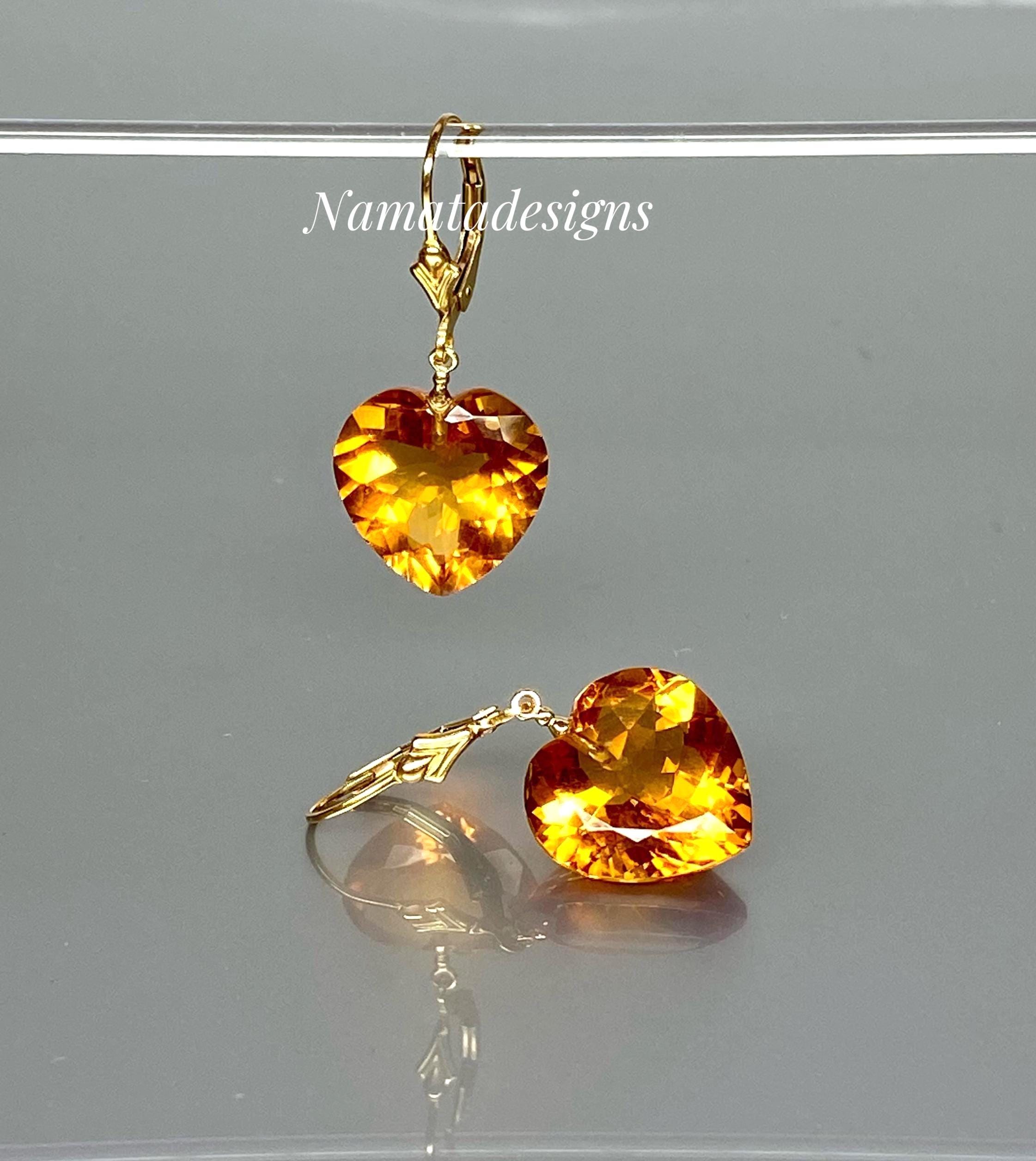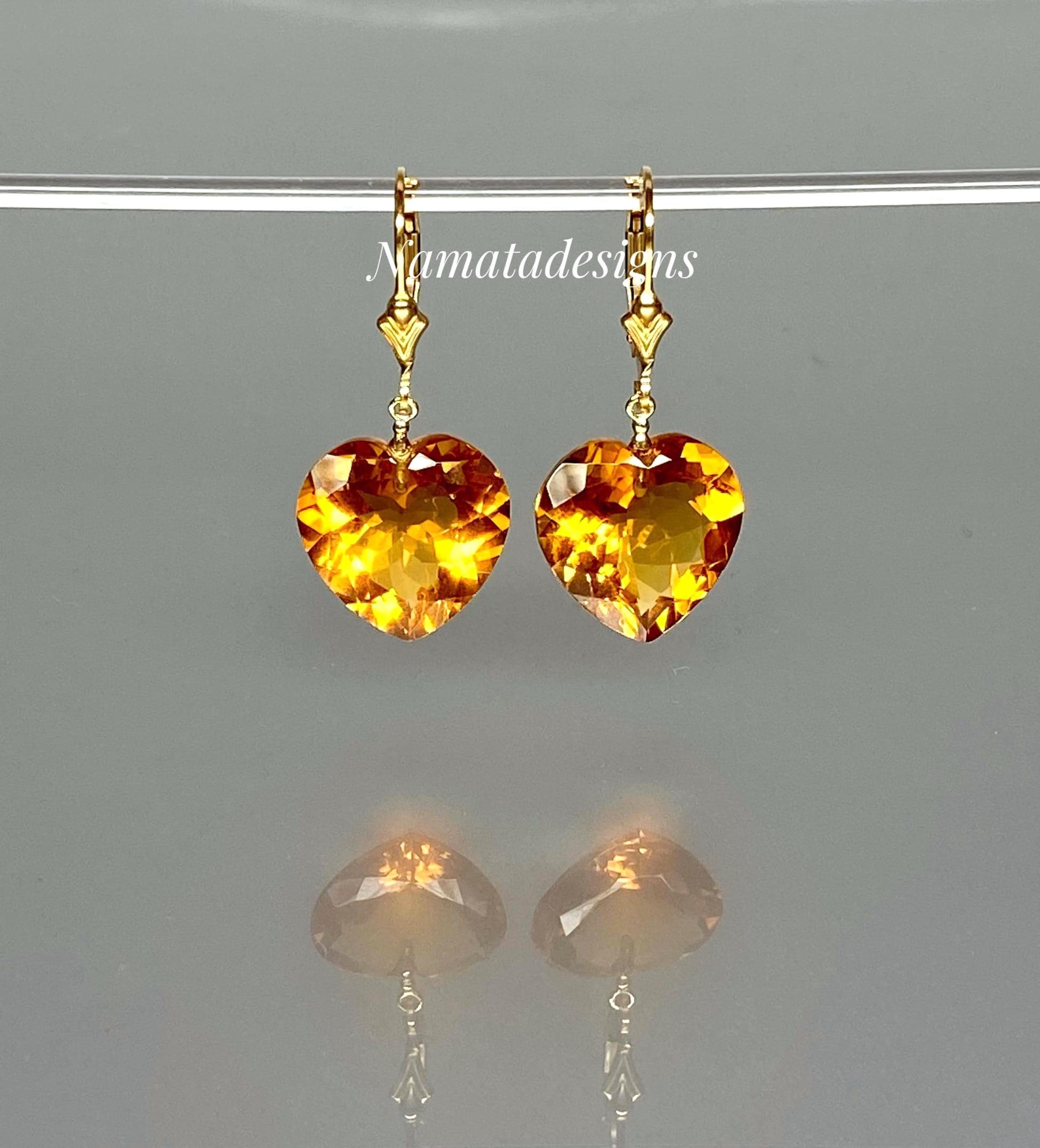 Gorgeous sparkly golden citrine earrings. The Faceted heart-shaped drops are flawless and have beautiful golden colors. The drops are attached to secure 14k gold-filled/Sterling silver lever backs. The earrings are elegant and have a luxurious look.